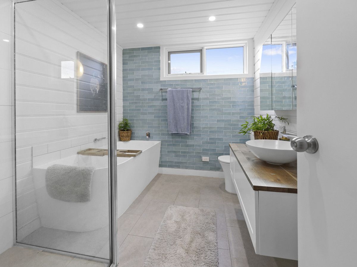 The beach house has undergone a significant transformation, replaced tired asbestos walls and reconfigured existing spaces to create a light-filled, modern lifestyle home. Careful planning allowed for some space to be repurposed from the upper storey balcony, making room for a luxury ensuite accessed directly from the master bedroom through sliding barn doors. High windows in the ensuite invite morning light, enhancing the sense of openness and serenity.