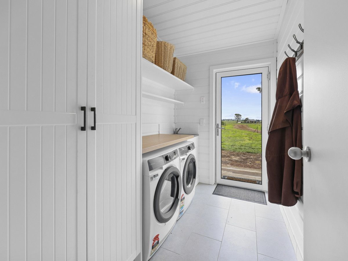 Inside, polished timber floors create a warm and inviting atmosphere while supporting the sustainable theme. The interiors are further enhanced by stone bench tops, which offer both functionality and a natural aesthetic. White timber lining boards and exposed white timber beams add to the sense of openness and brightness within the living spaces. In addition, feature white shiplap walls bring texture and interest to the design, reinforcing the home's cohesive architectural style.