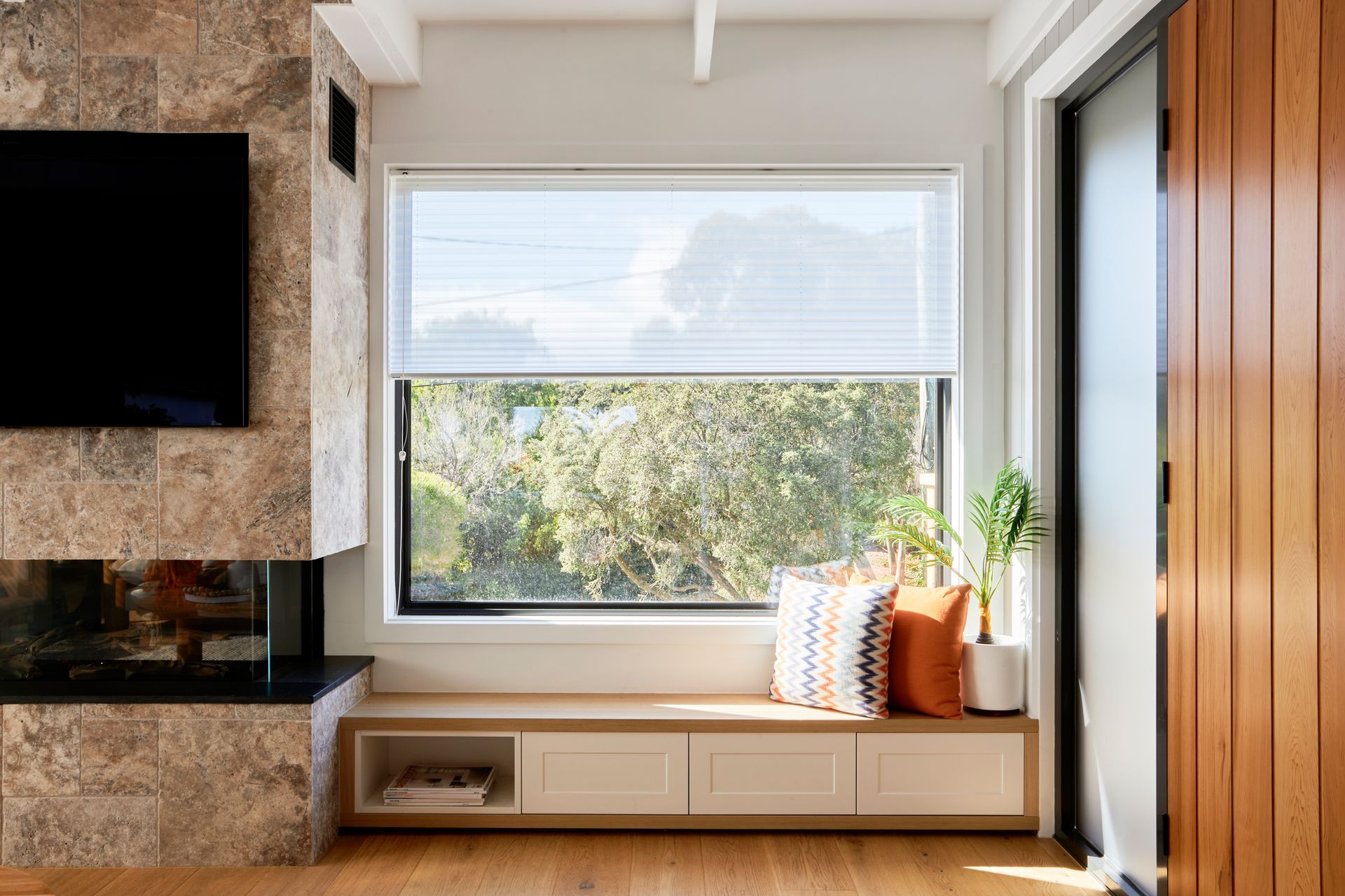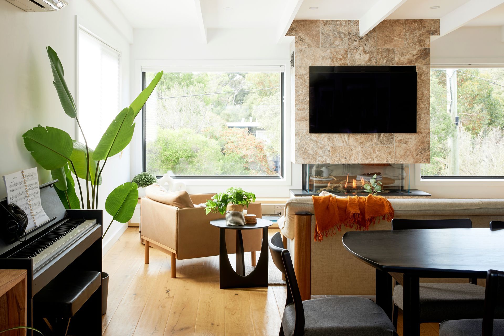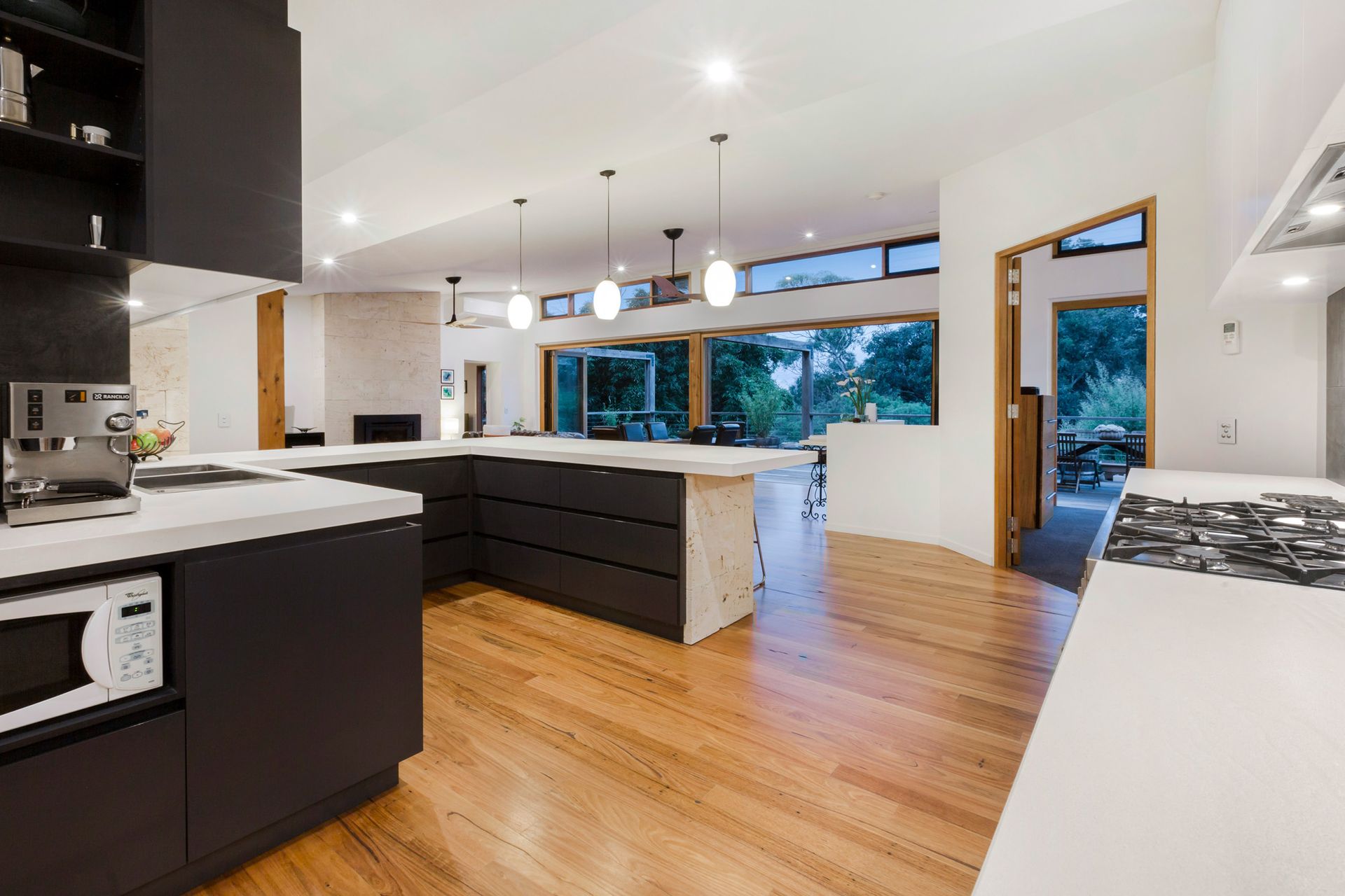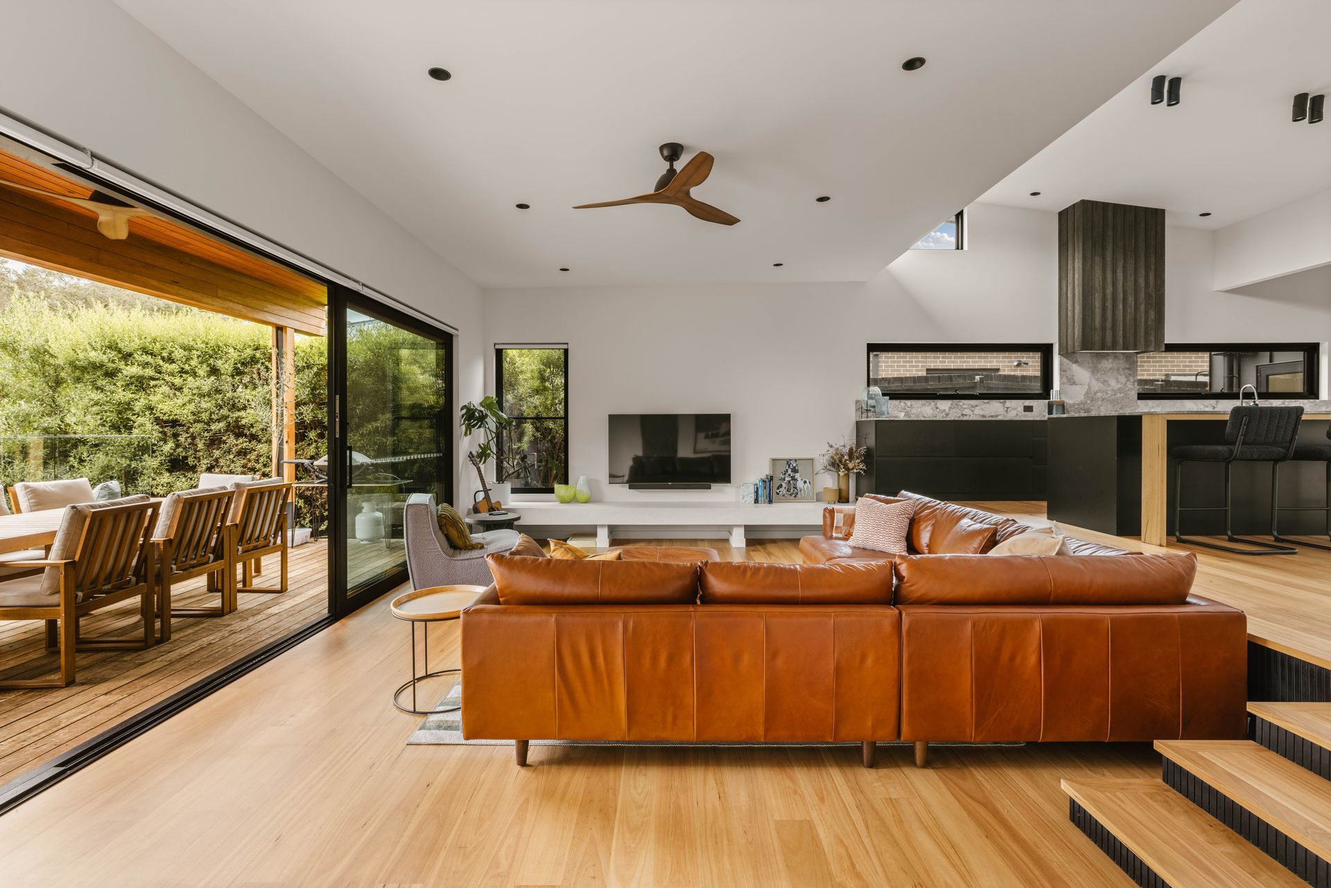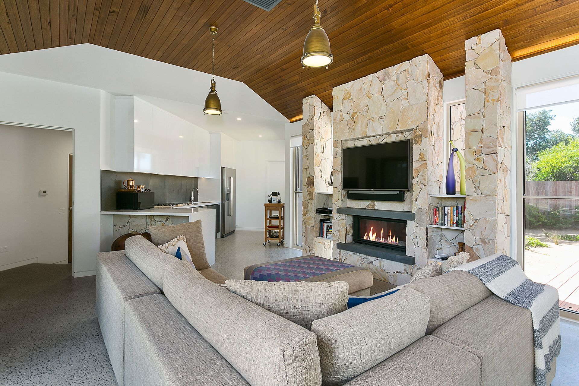 Split level living with polished timber floors and light walls. Windows provide selected views of the natural garden and norther tree top views to Port Phillip bay. The exterior features timber shiplap finished in natural tung oil.