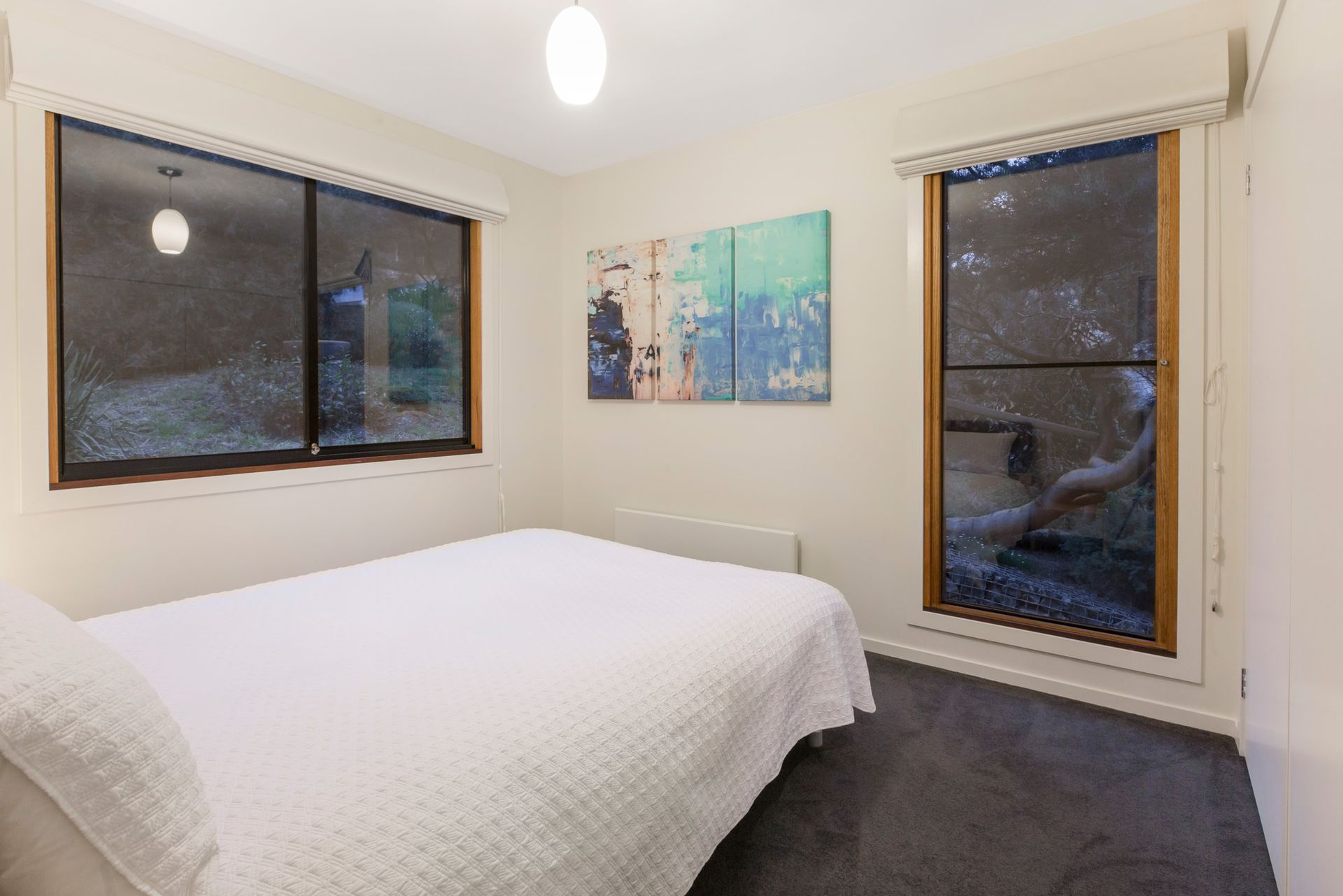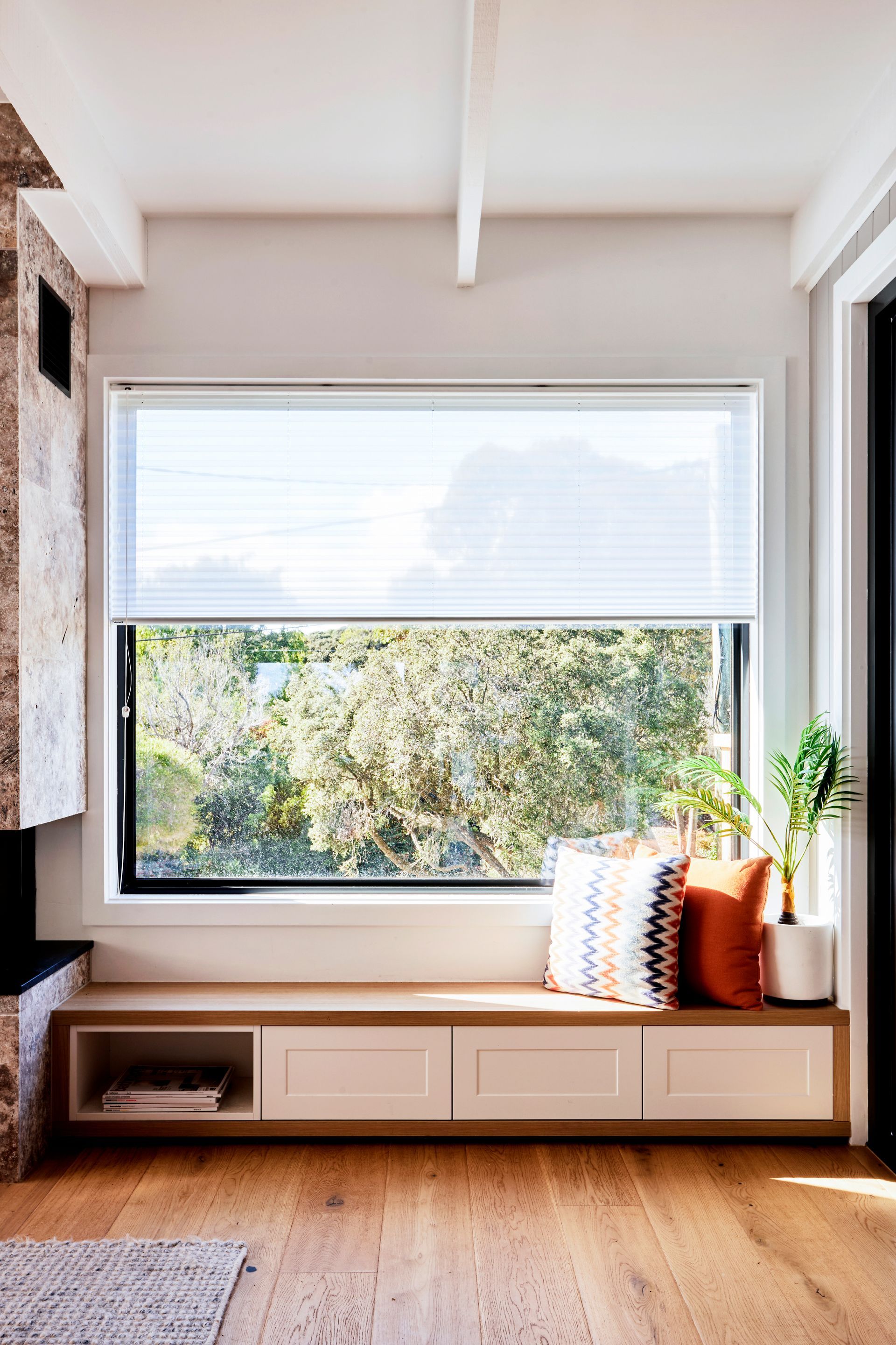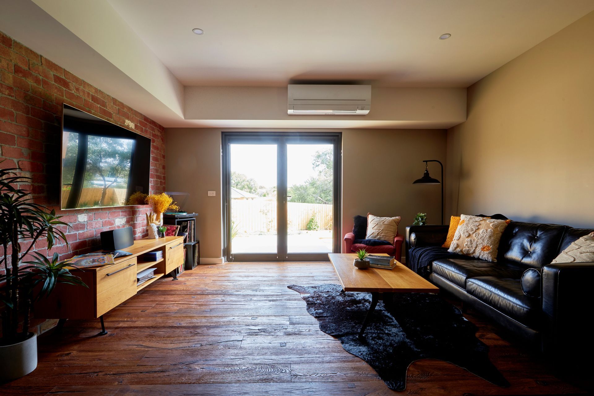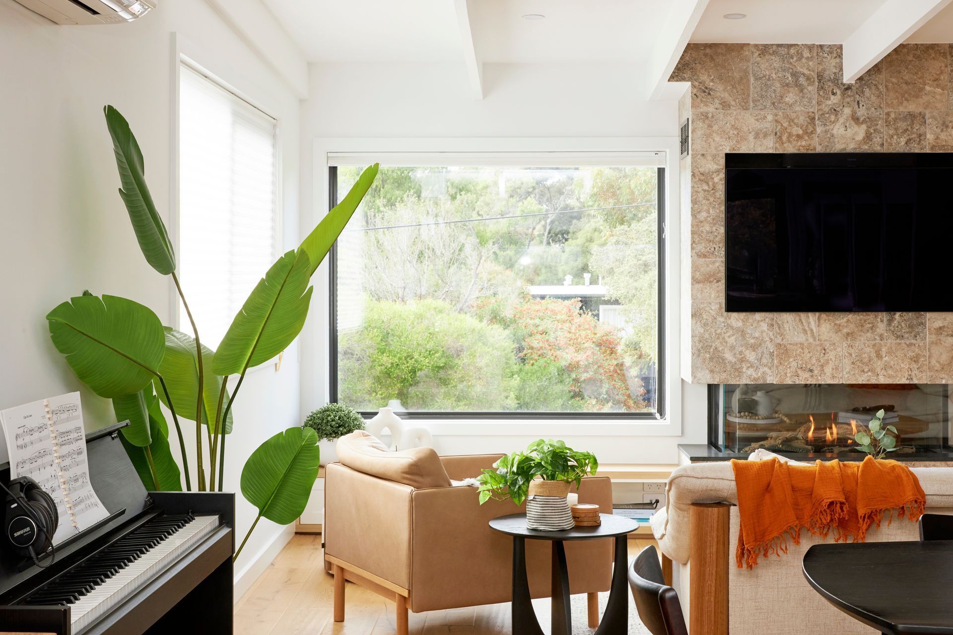 Split level living with polished timber floors and light walls. Windows provide selected views of the natural garden and norther tree top views to Port Phillip bay. The exterior features timber shiplap finished in natural tung oil.
