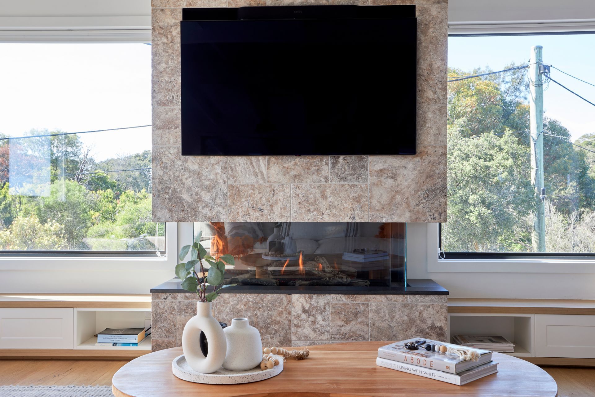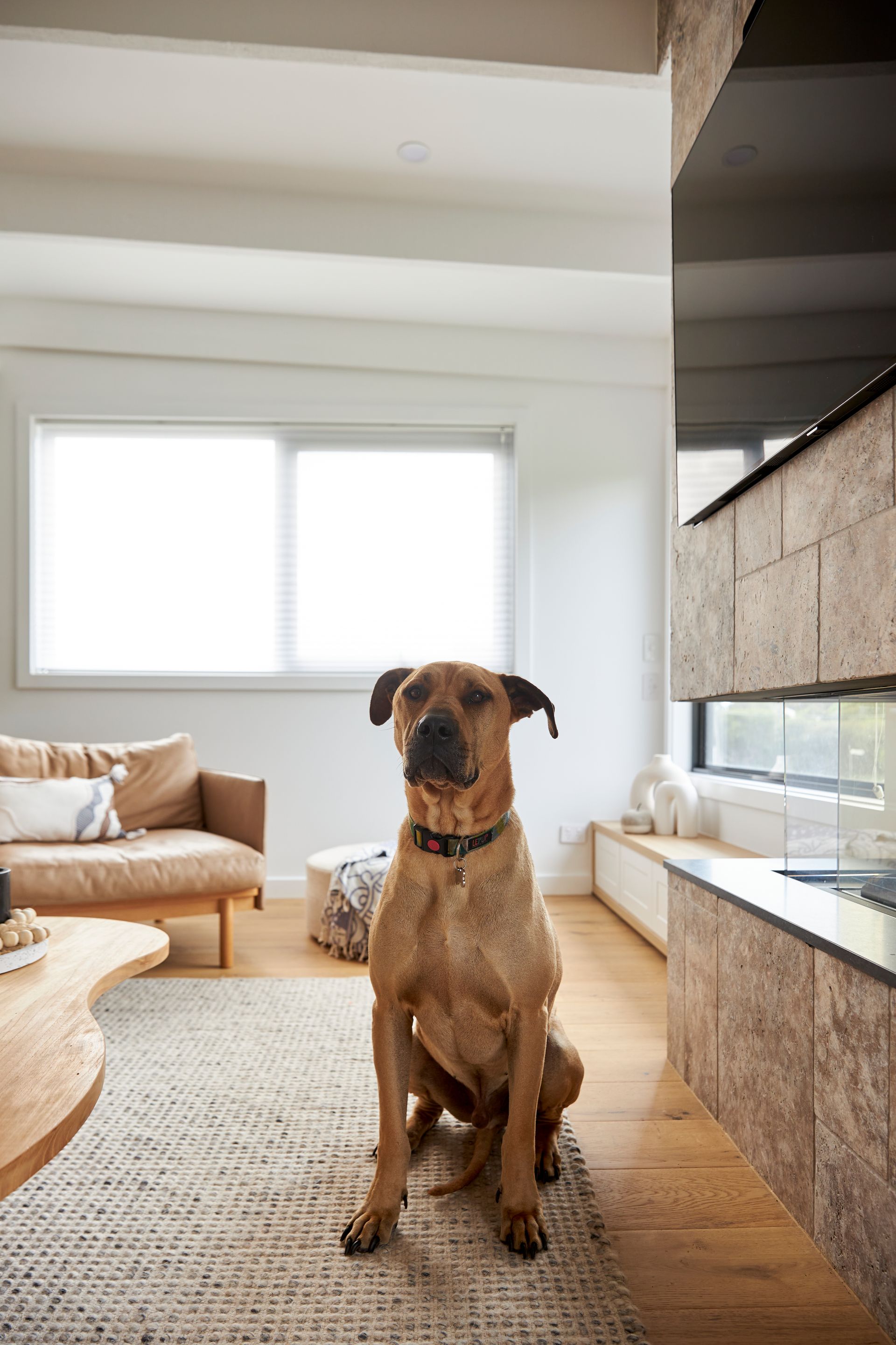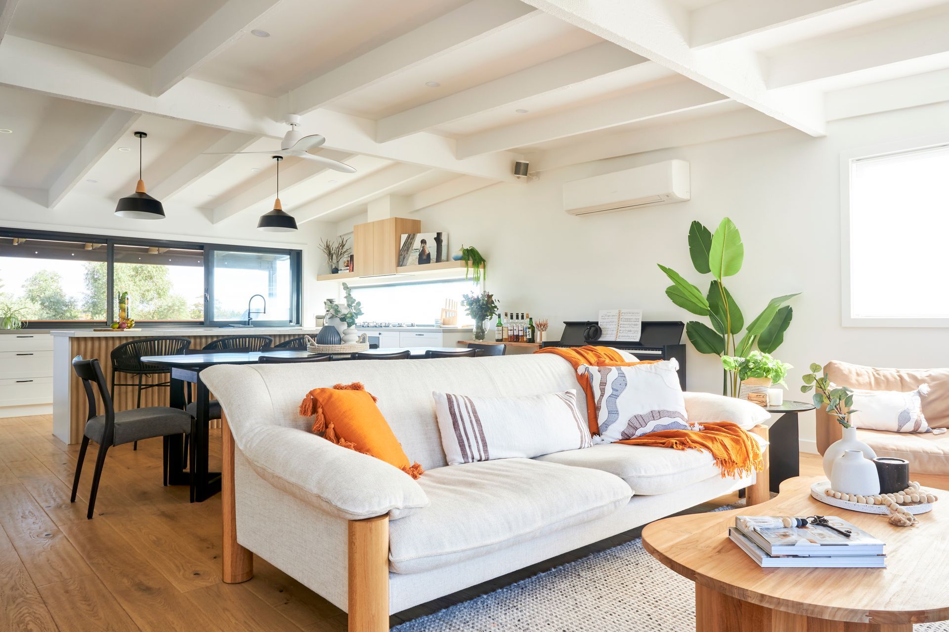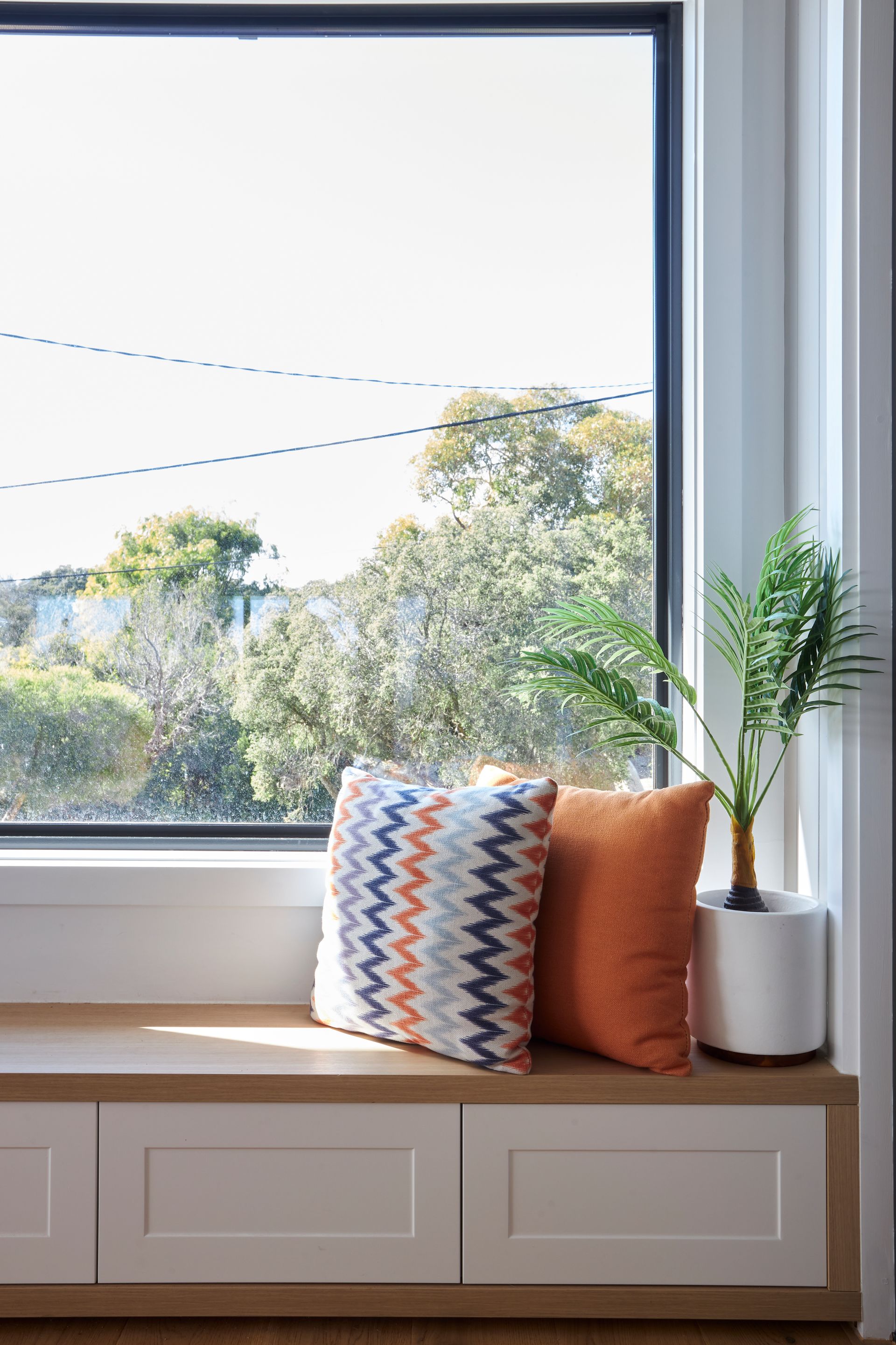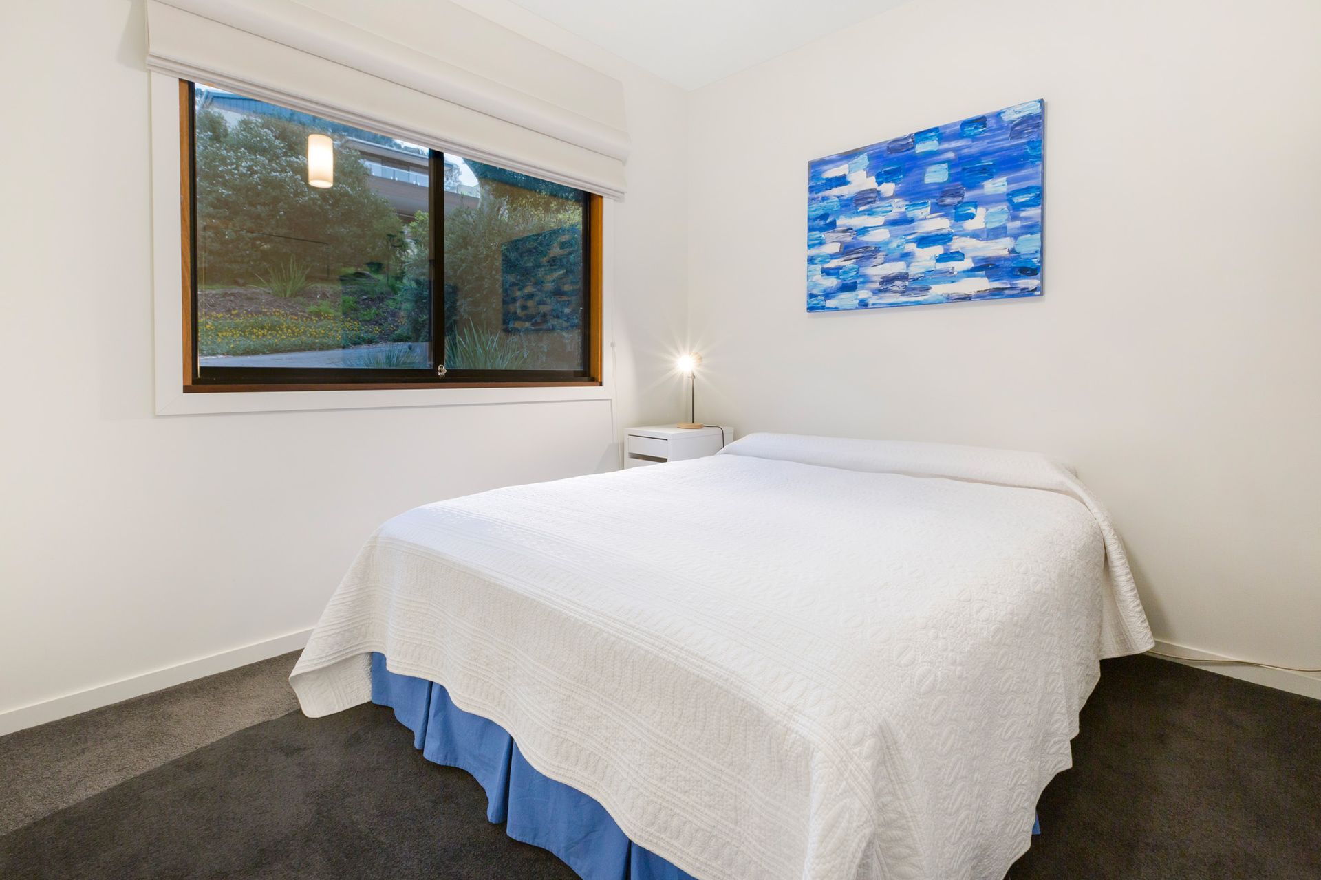 Split level living with polished timber floors and light walls. Windows provide selected views of the natural garden and norther tree top views to Port Phillip bay. The exterior features timber shiplap finished in natural tung oil.