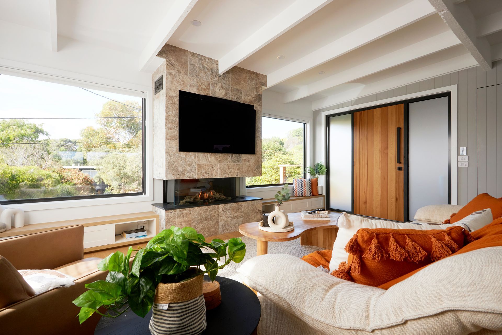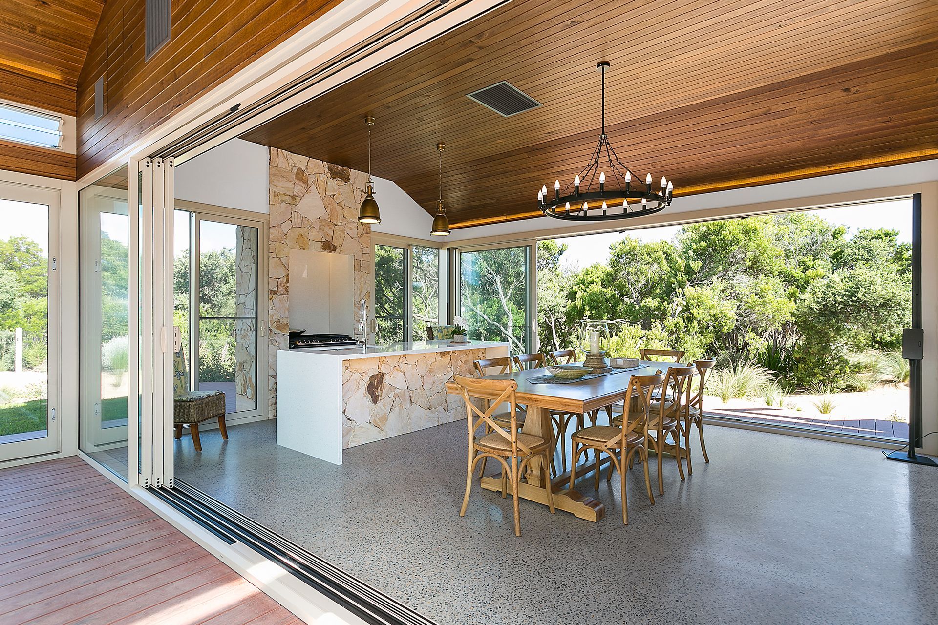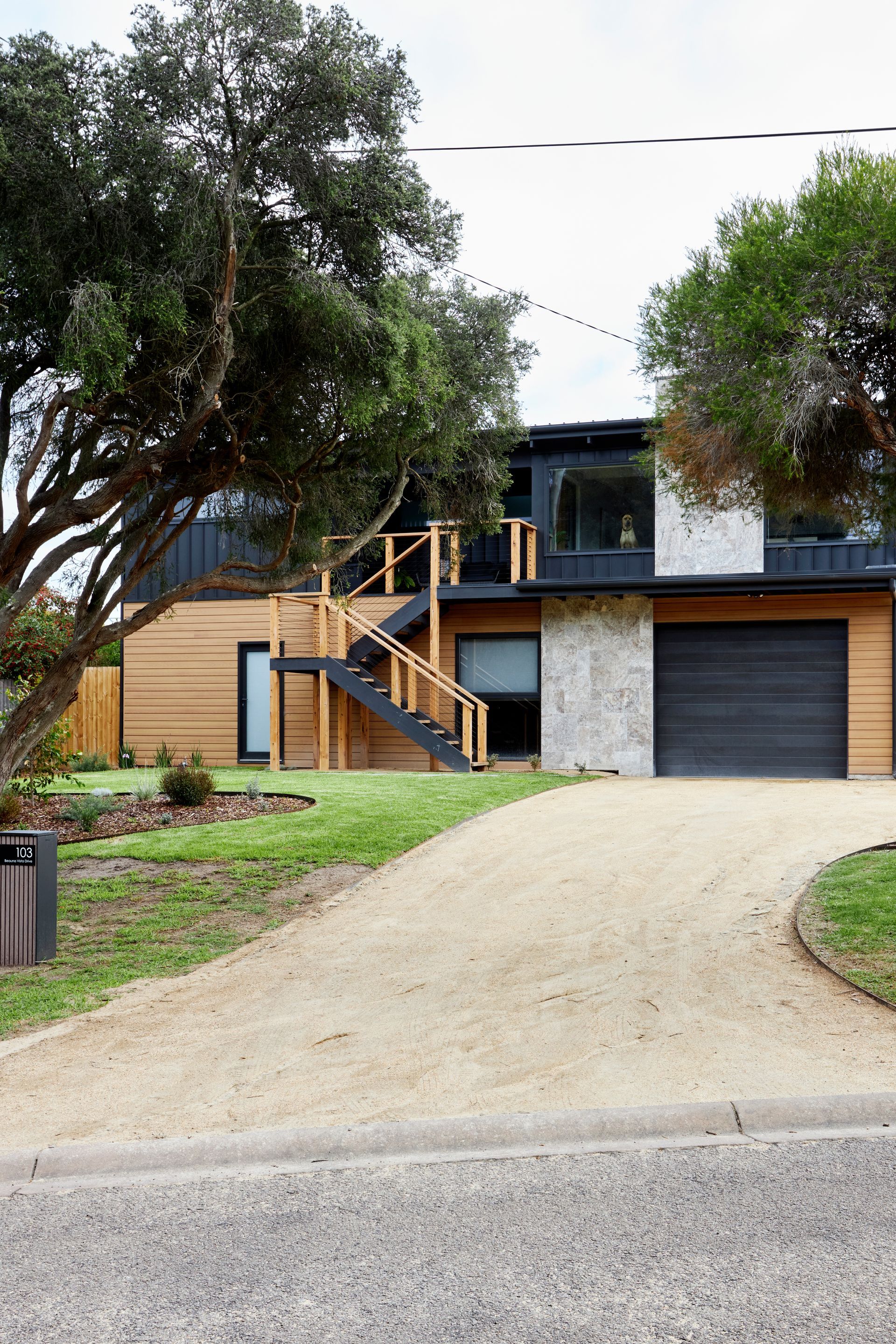 Beautiful contemporary rustic beach house featuring natural stone, recycled timbers, charred sequoia cladding. indoor/outdoor living, sustainable design. Windows by Ryloch, Landscape design by James Ross and landscape construction by 'Stylescapes'. Natural stone by 'eco-Outdoor'. Interior design was directed by a family friend of the clients and the results are exemplary.