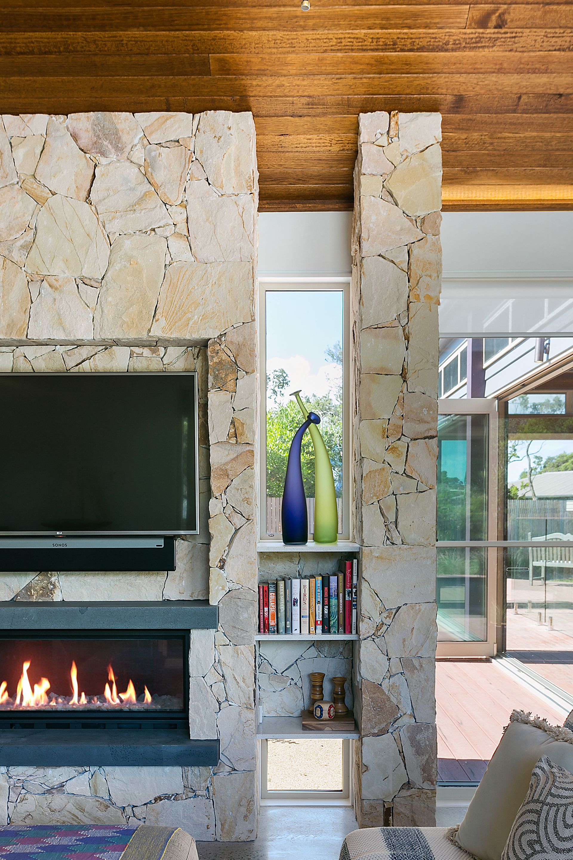 The majority of the lower storey structure was left intact with new skins, and with a new kitchen and bathroom providing a link to the overall architectural metamorphosis. An emphasis on natural light and air in all rooms provides comfortable living while maintaining privacy indoors and out. Natural rock walls are a feature indoors and out and contribute the overall organic feel including polished light hardwood floors. Some original Oregon beams were recycled to make a unique timber bench feature upstairs.