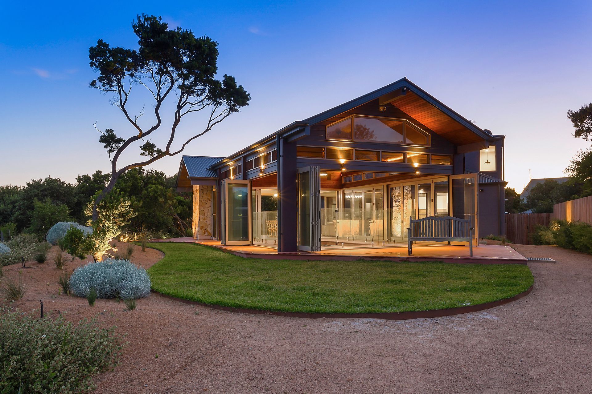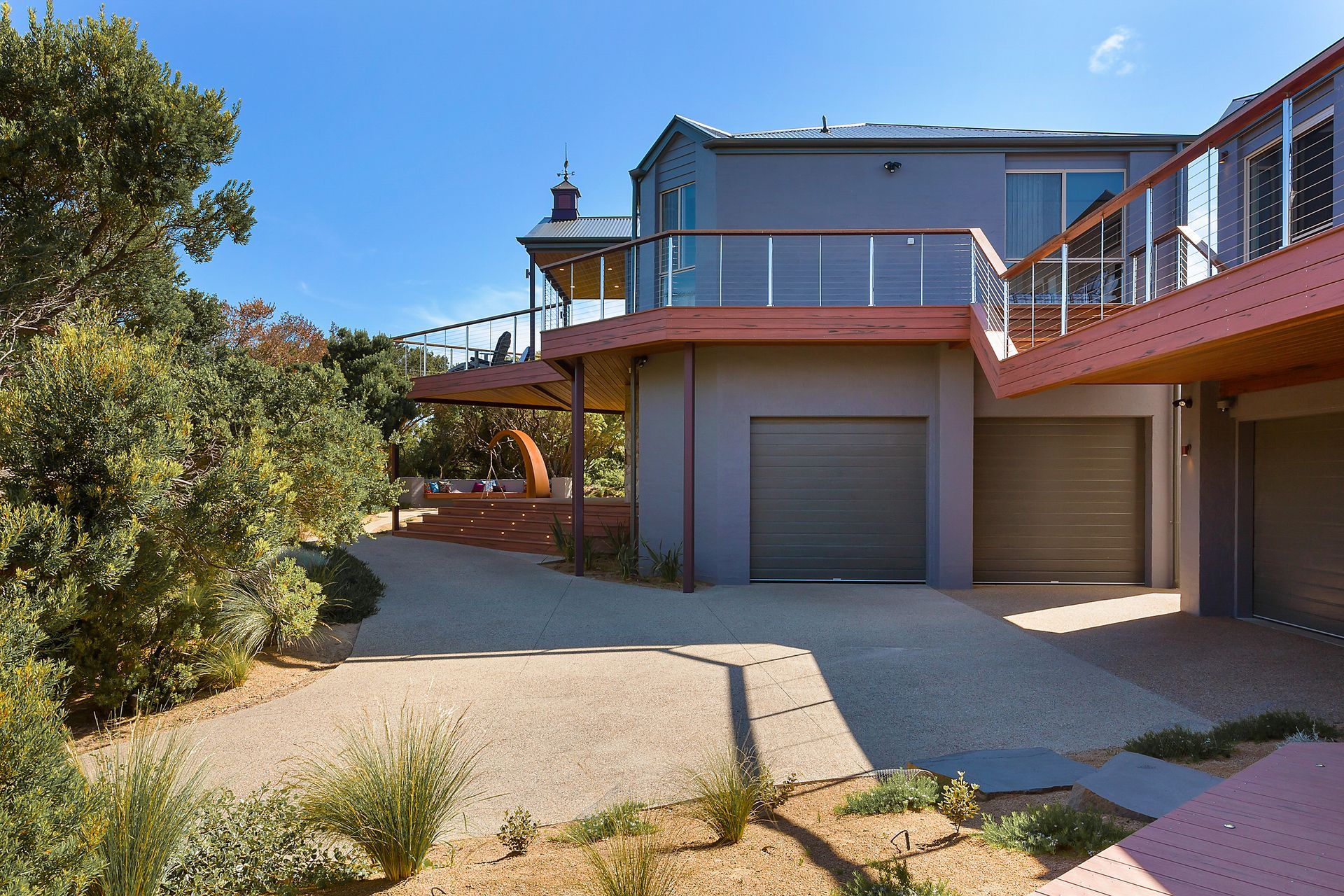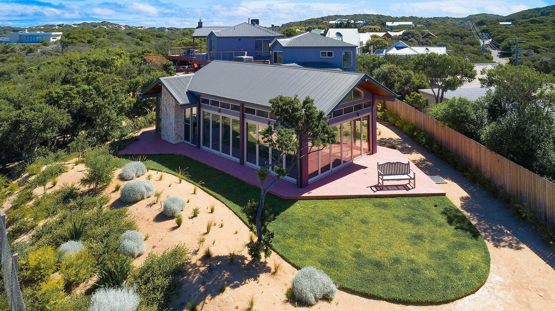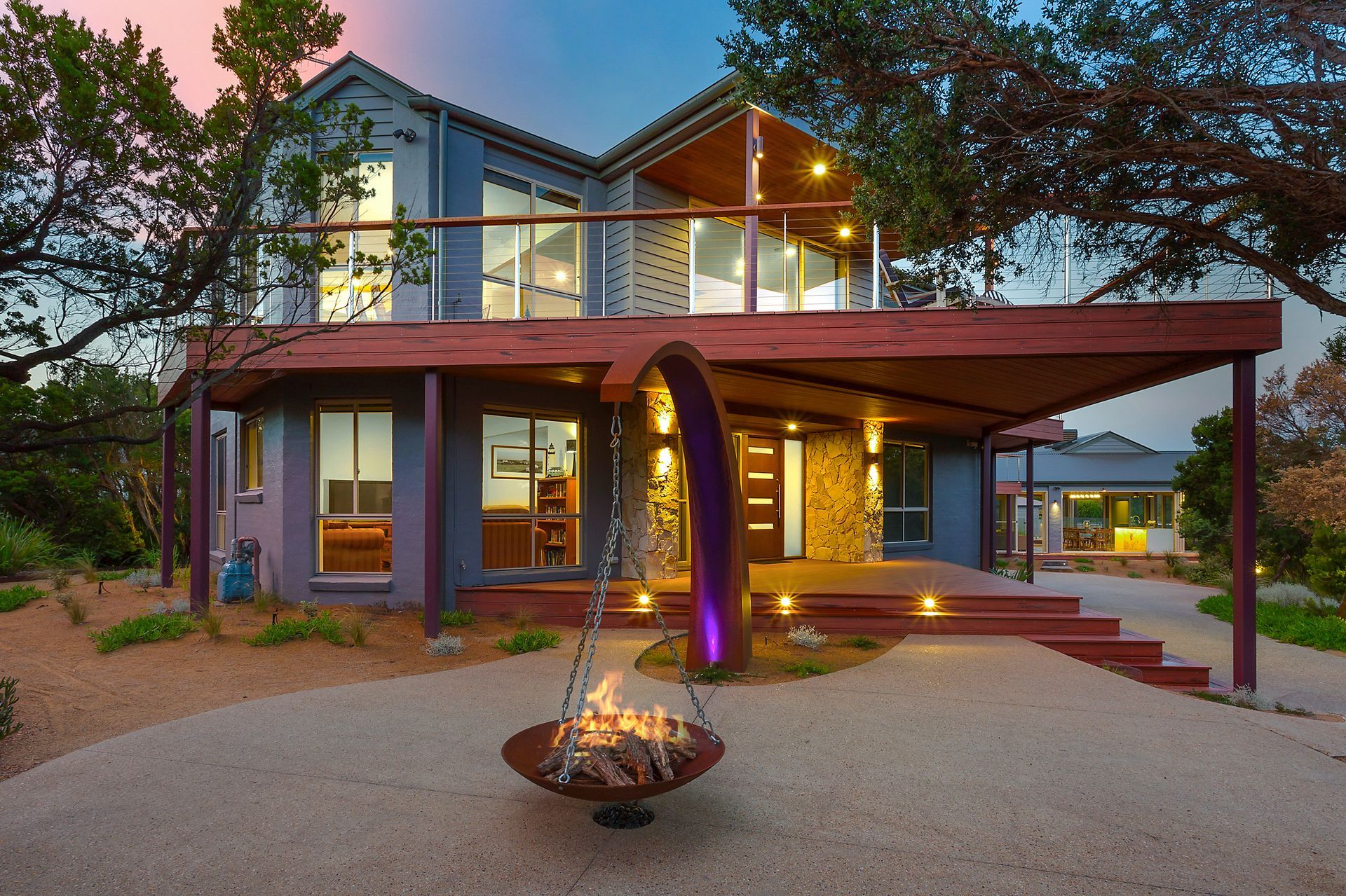 Two storey Rammed earth and render house with panoramic classic views of the dunes and tree tops of Bass Strait. Plenty of natural light reaches the inner living areas via a central stair well with hi-lite louvered ventilation windows. Hot air can escape in summer through the natural air tunnel in summer and controlled in winter with doors and reverse cycle ceiling sweep fans. Floors are polished concrete.