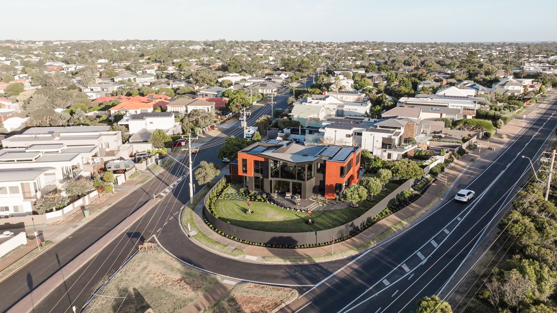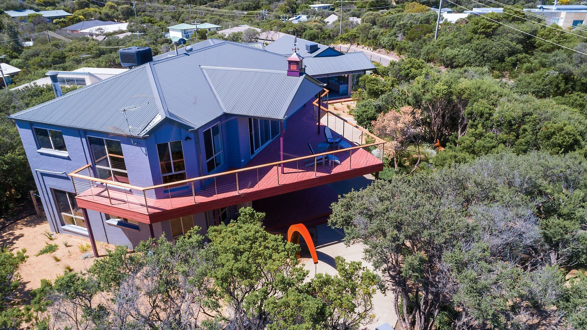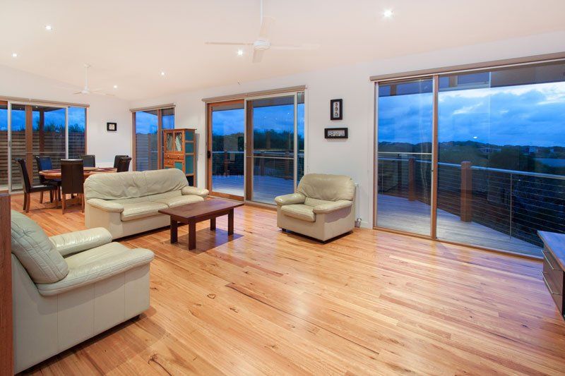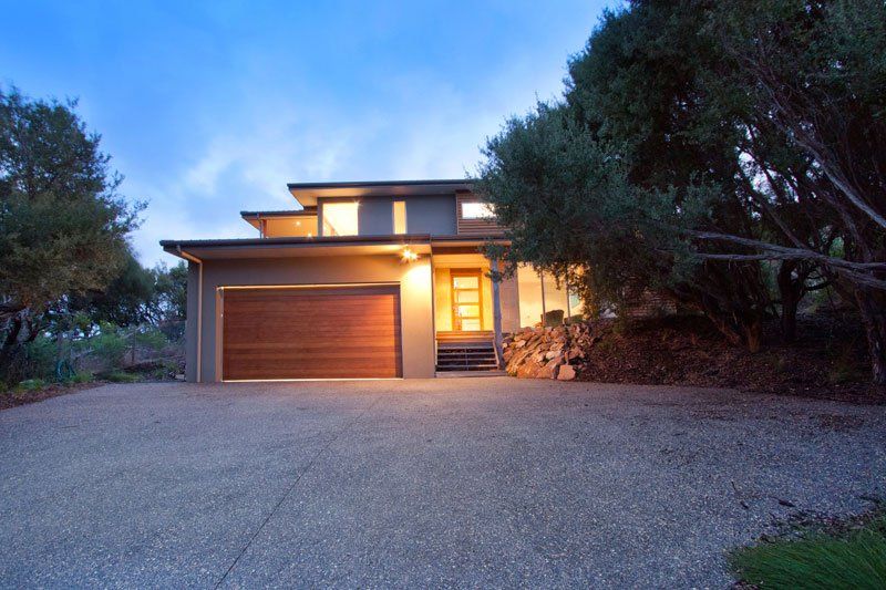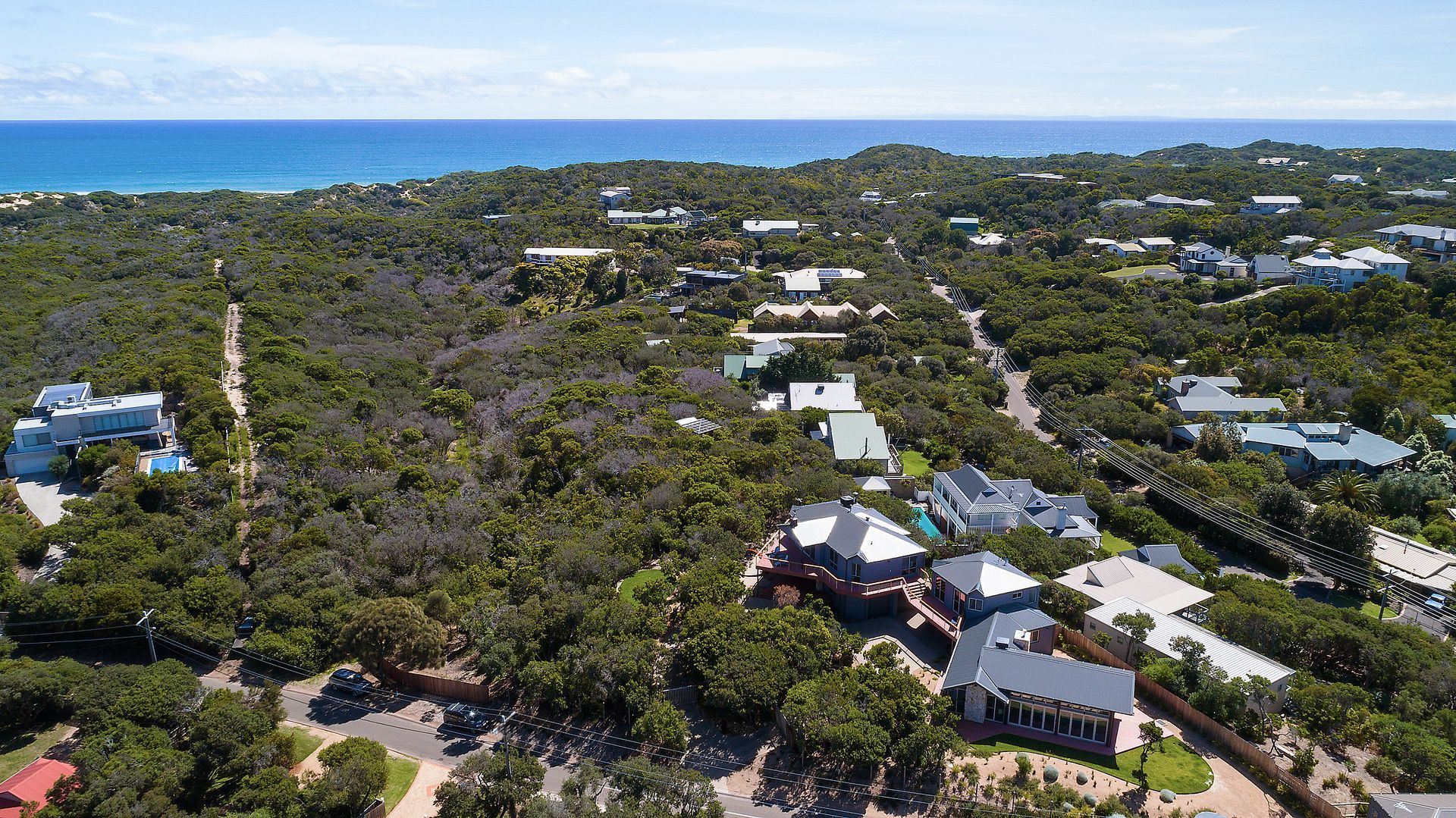 Two storey Rammed earth and render house with panoramic classic views of the dunes and tree tops of Bass Strait. Plenty of natural light reaches the inner living areas via a central stair well with hi-lite louvered ventilation windows. Hot air can escape in summer through the natural air tunnel in summer and controlled in winter with doors and reverse cycle ceiling sweep fans. Floors are polished concrete.