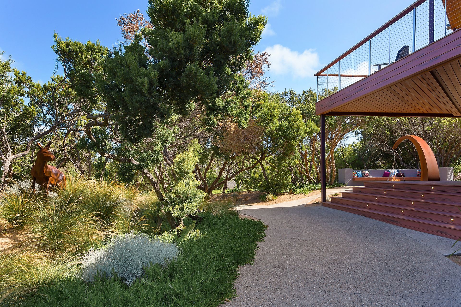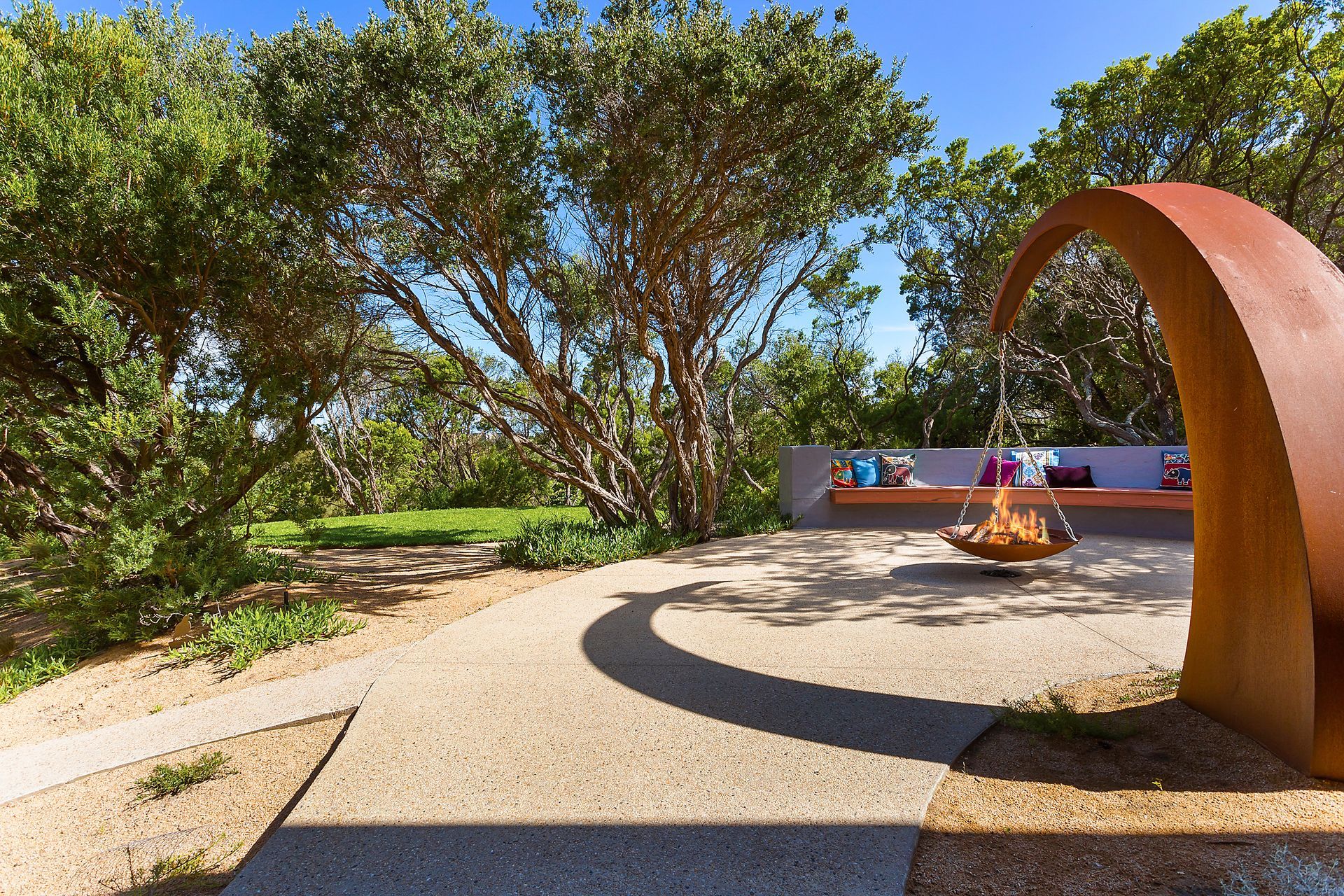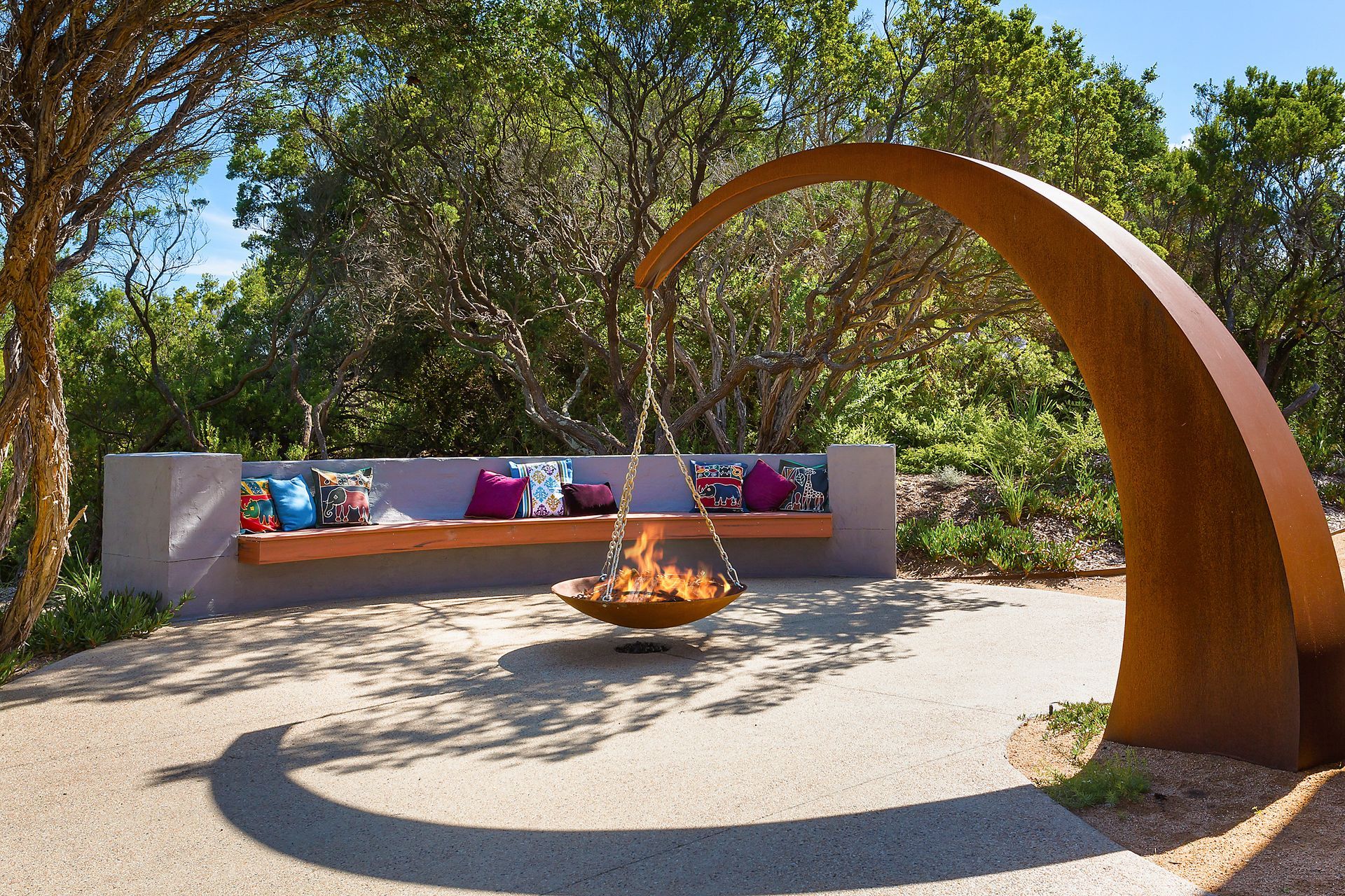 The home also has a large spa room, outdoor rooms with polished concrete floors, rendered brick walls in a deep mauve grey that reflect the colours of storm clouds that occasionally blow in from Bass strait, and plum coloured posts that are colour matched to the Aga stove doors in the outdoor room. A Corten special fire pit sculpture by Matt hill sits at the centre of an outdoor communal space in the trees.