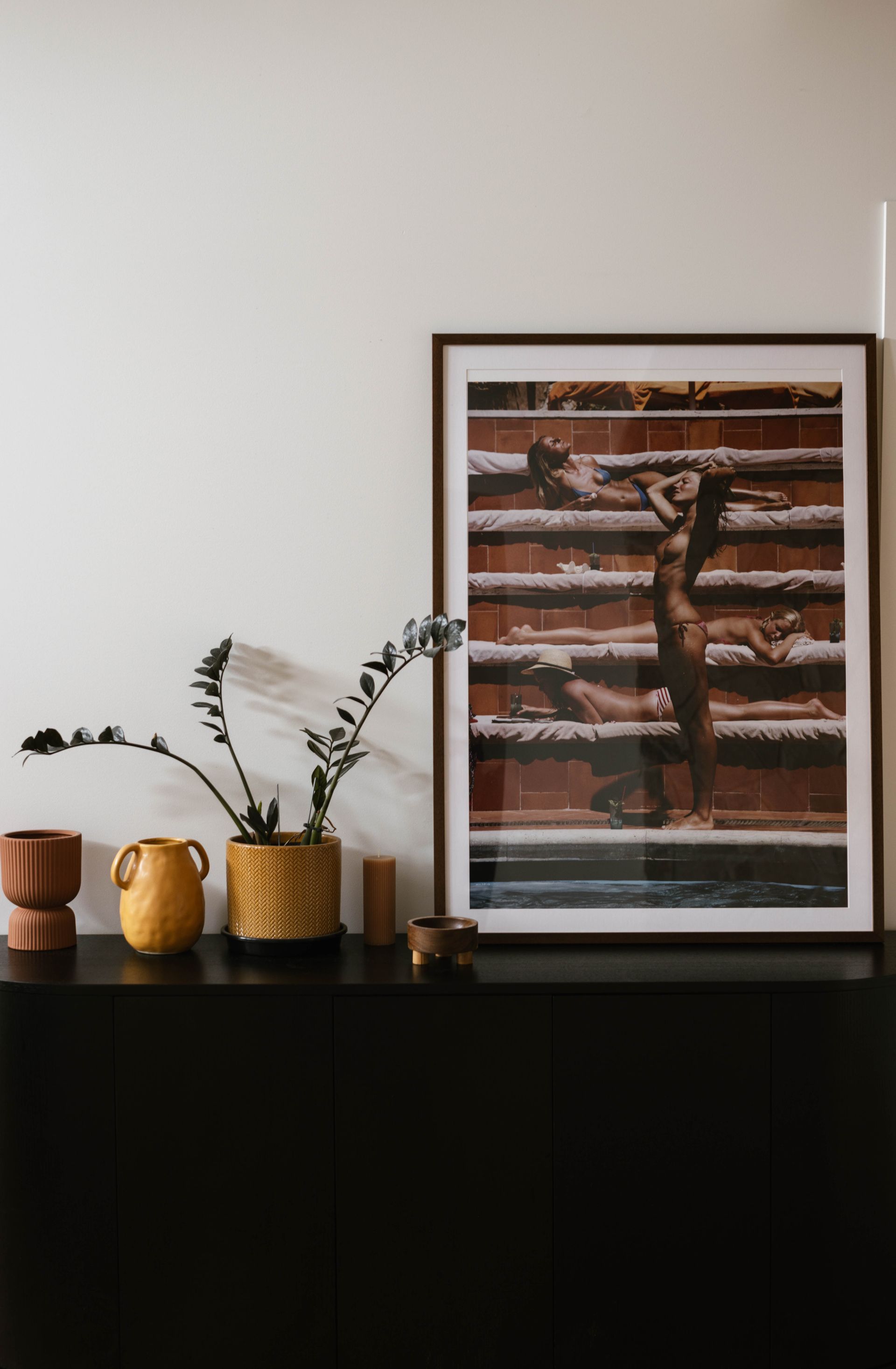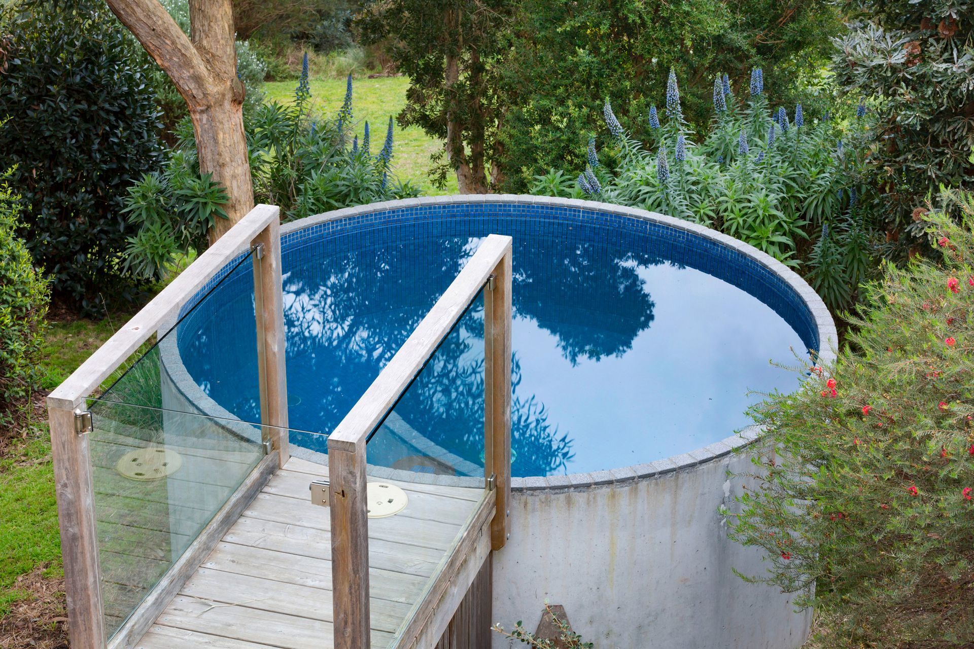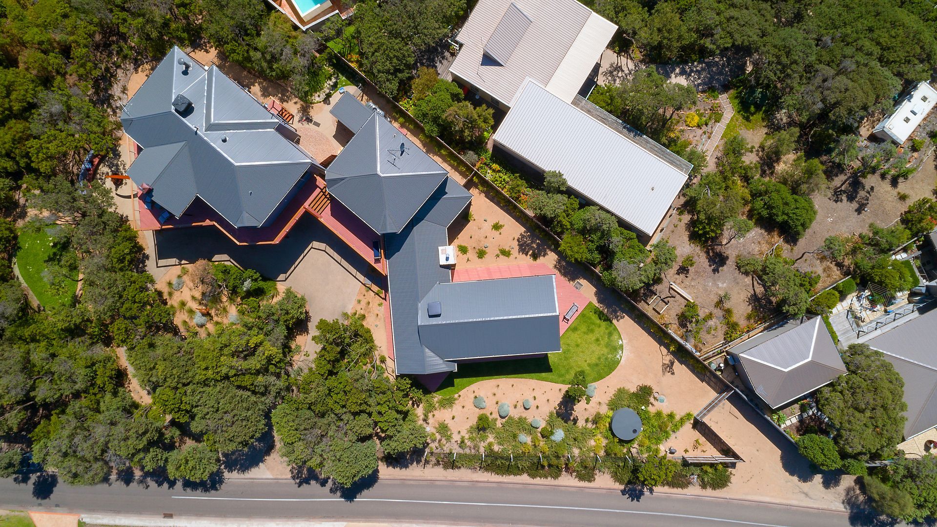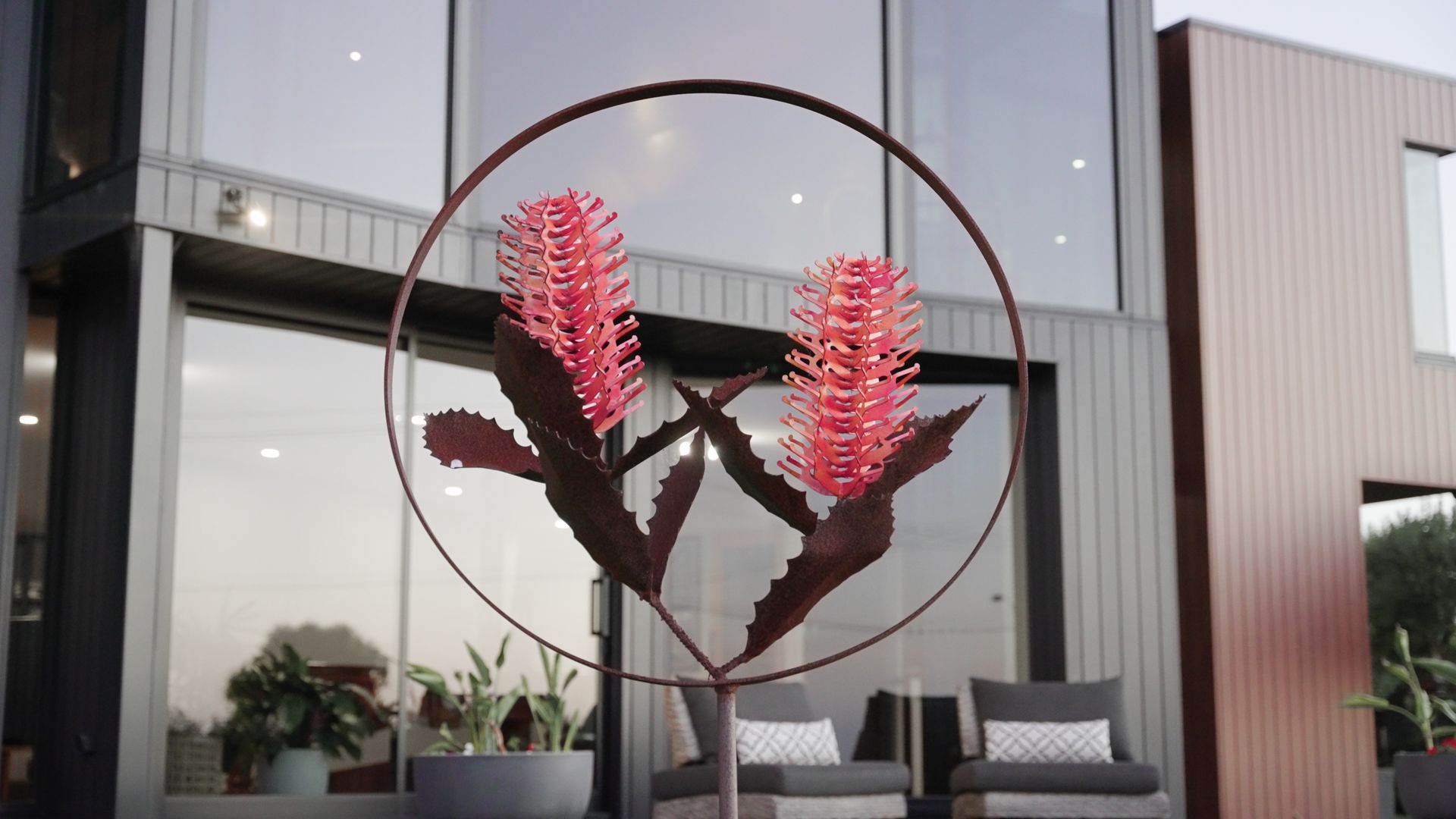 The home also has a large spa room, outdoor rooms with polished concrete floors, rendered brick walls in a deep mauve grey that reflect the colours of storm clouds that occasionally blow in from Bass strait, and plum coloured posts that are colour matched to the Aga stove doors in the outdoor room. A Corten special fire pit sculpture by Matt hill sits at the centre of an outdoor communal space in the trees.