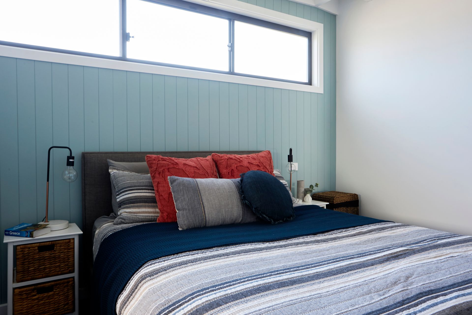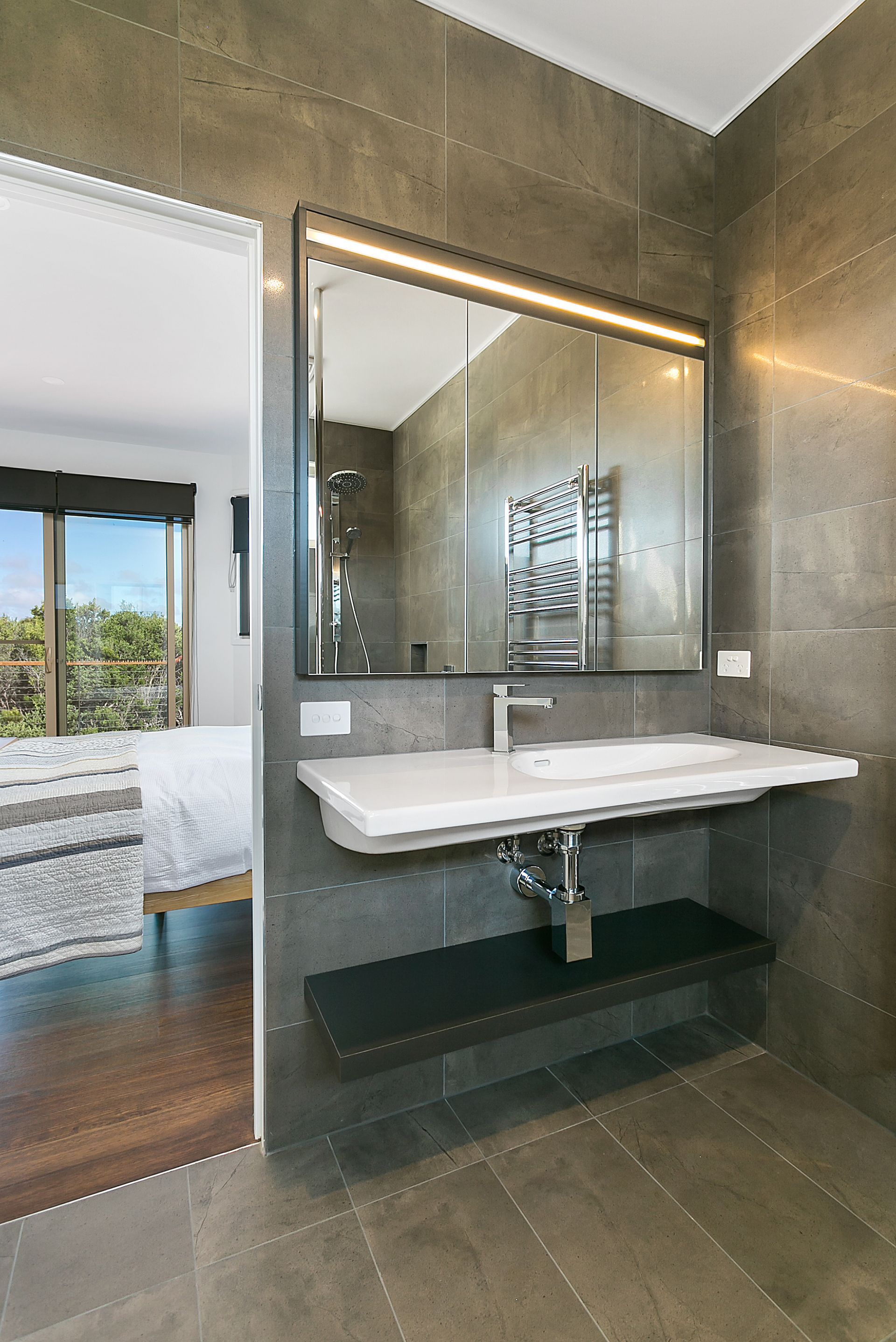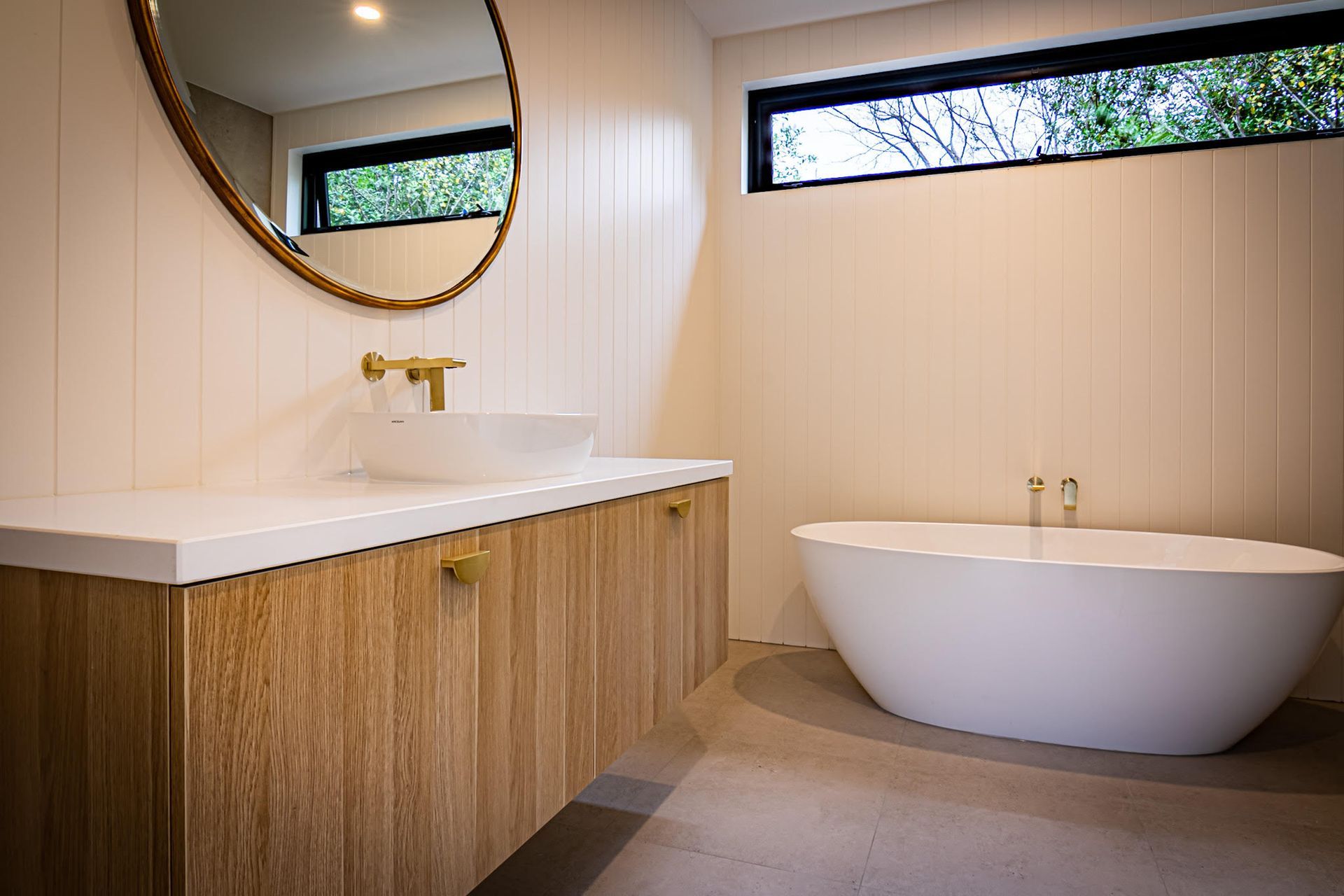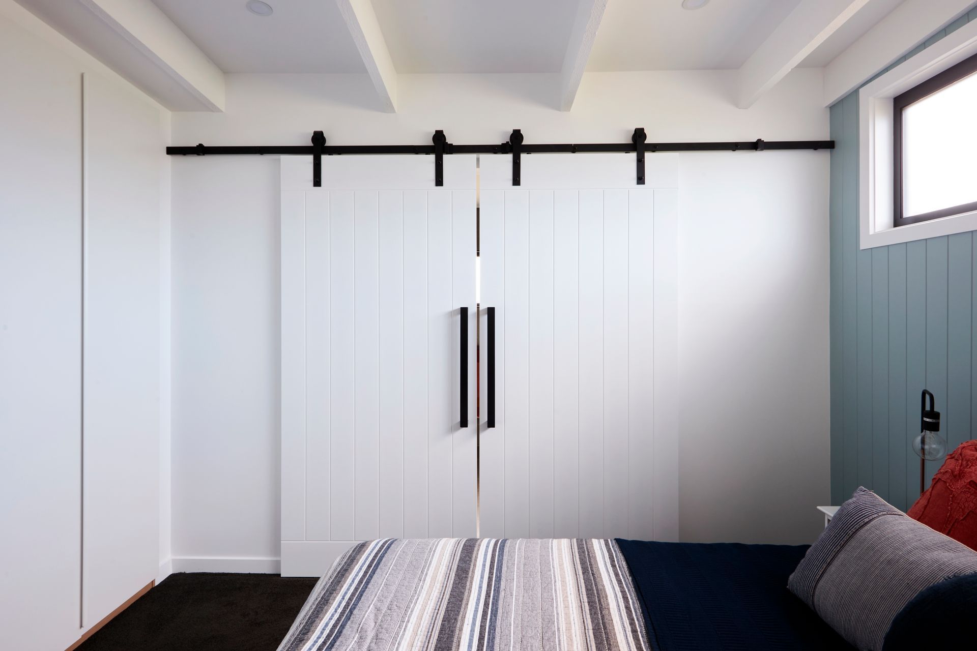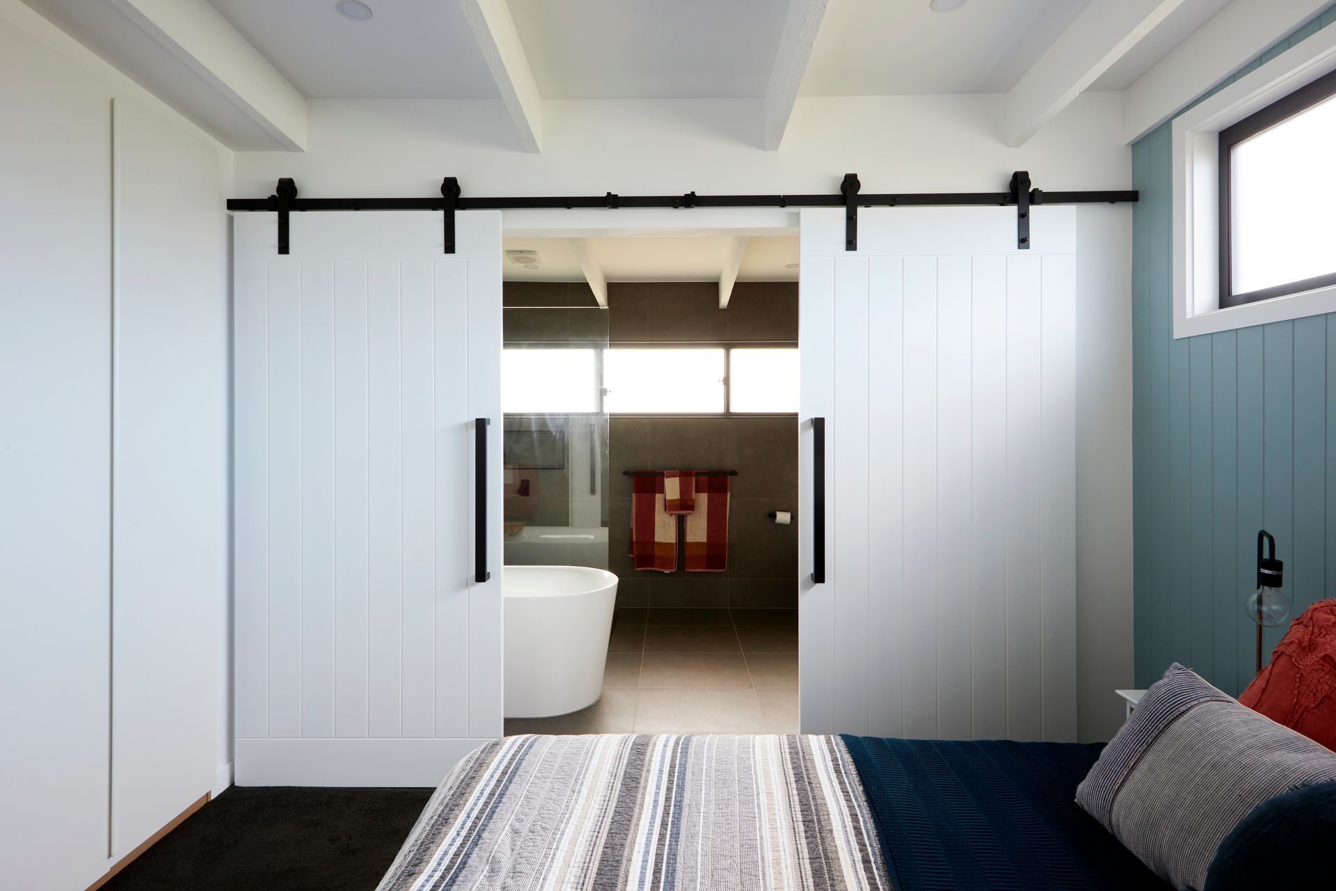 Beach house make over replacing tired asbestos walls and reconfiguring existing spaces to create a light filled modern lifestyle home. Some space was stolen from the upper story balcony to accomodate a luxury ensuite accessed from master bedroom via sliding barn doors. Morning light spills in to the ensuite through high windows.