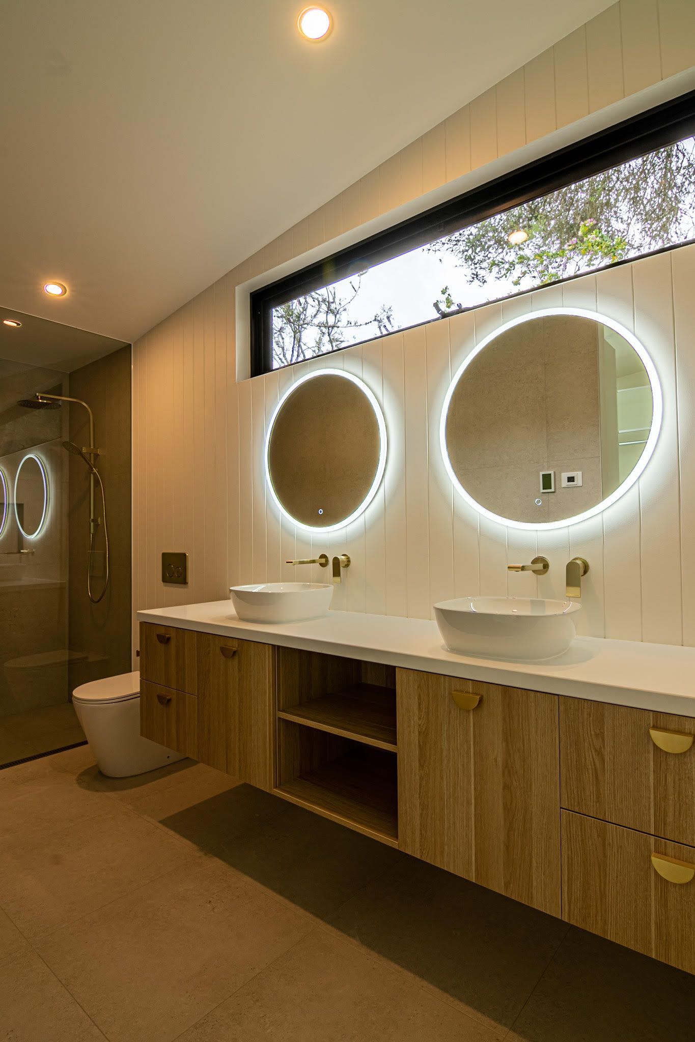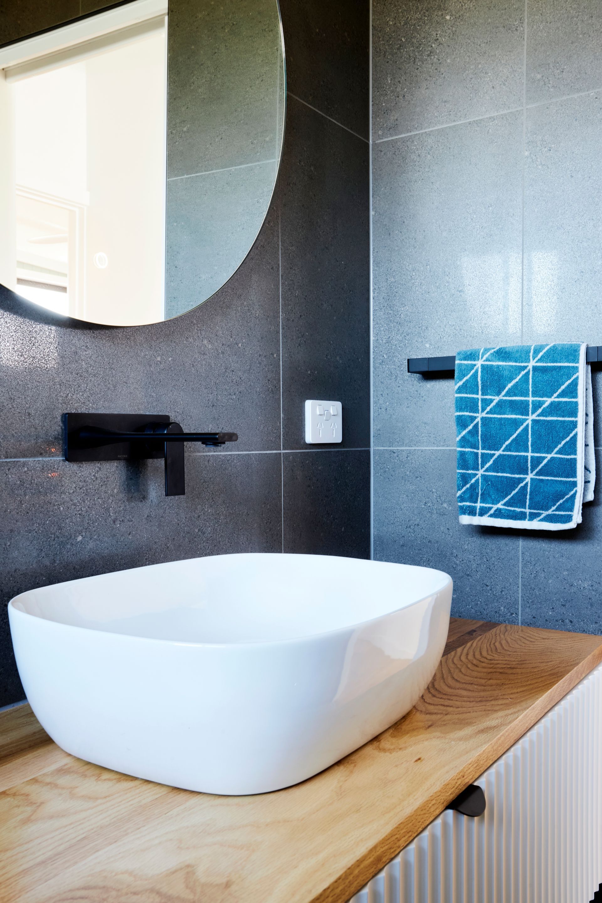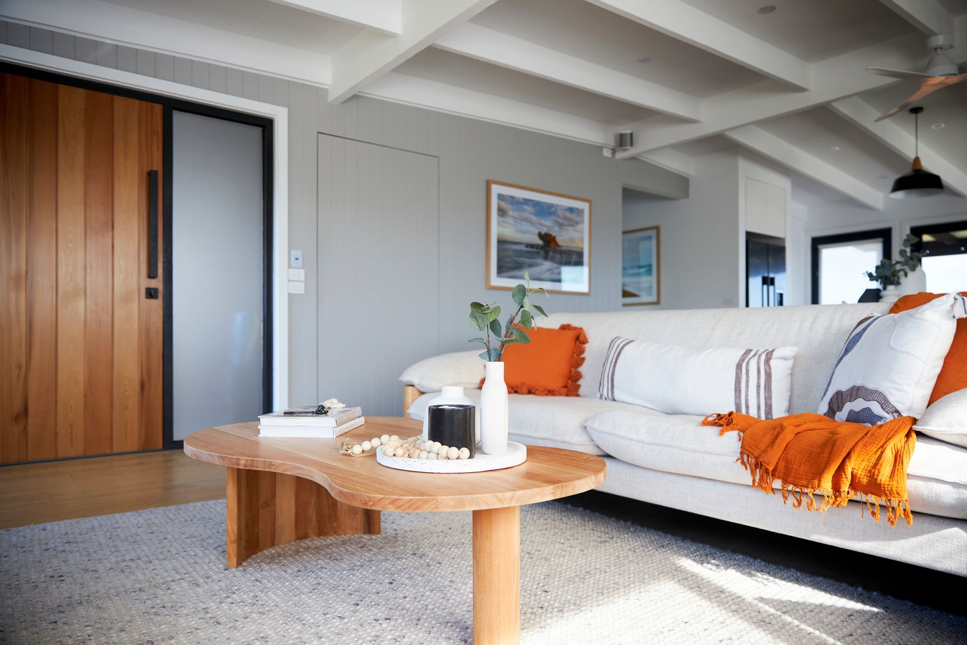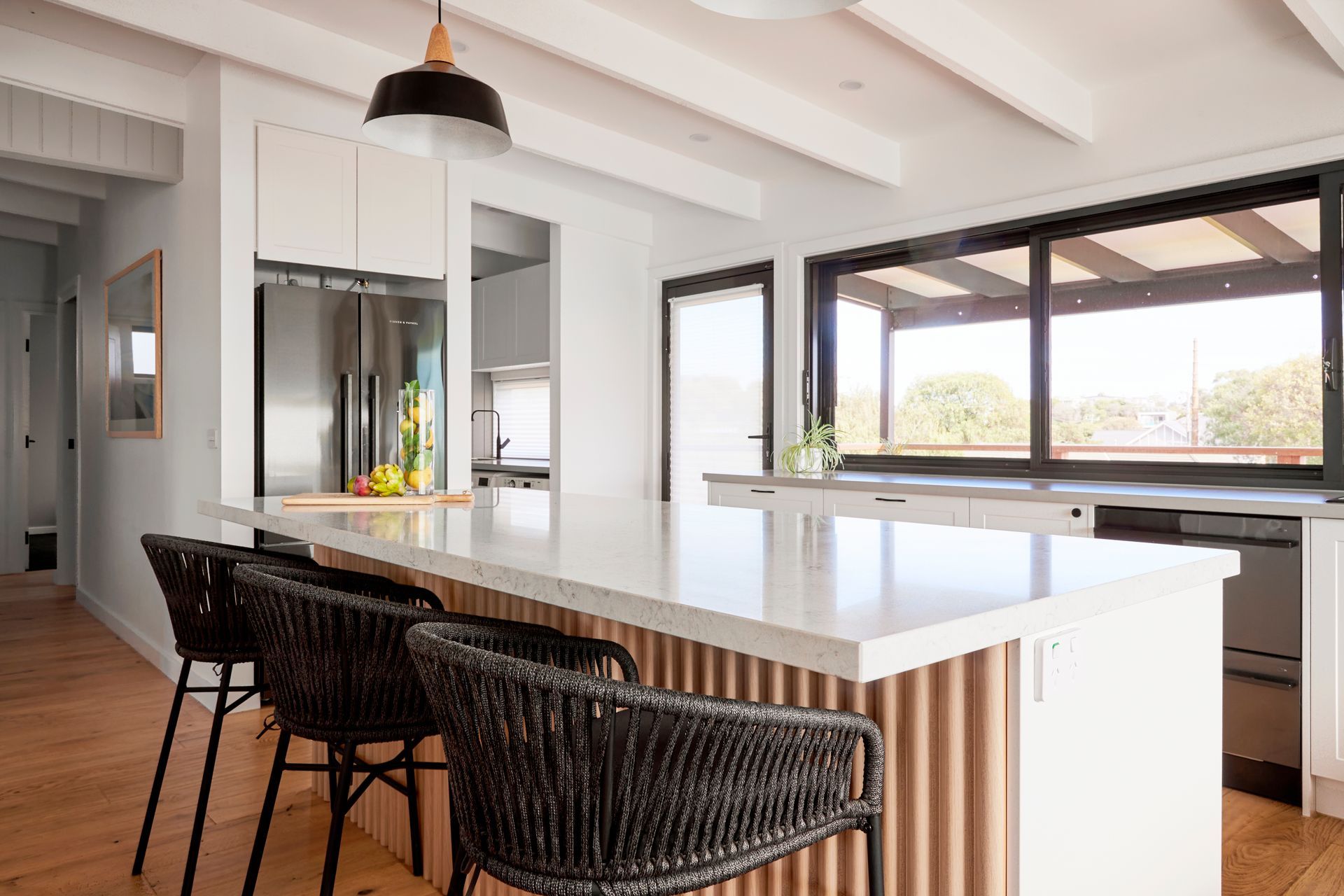 Beach house make over replacing tired asbestos walls and reconfiguring existing spaces to create a light filled modern lifestyle home. Some space was stolen from the upper story balcony to accomodate a luxury ensuite accessed from master bedroom via sliding barn doors. Morning light spills in to the ensuite through high windows.