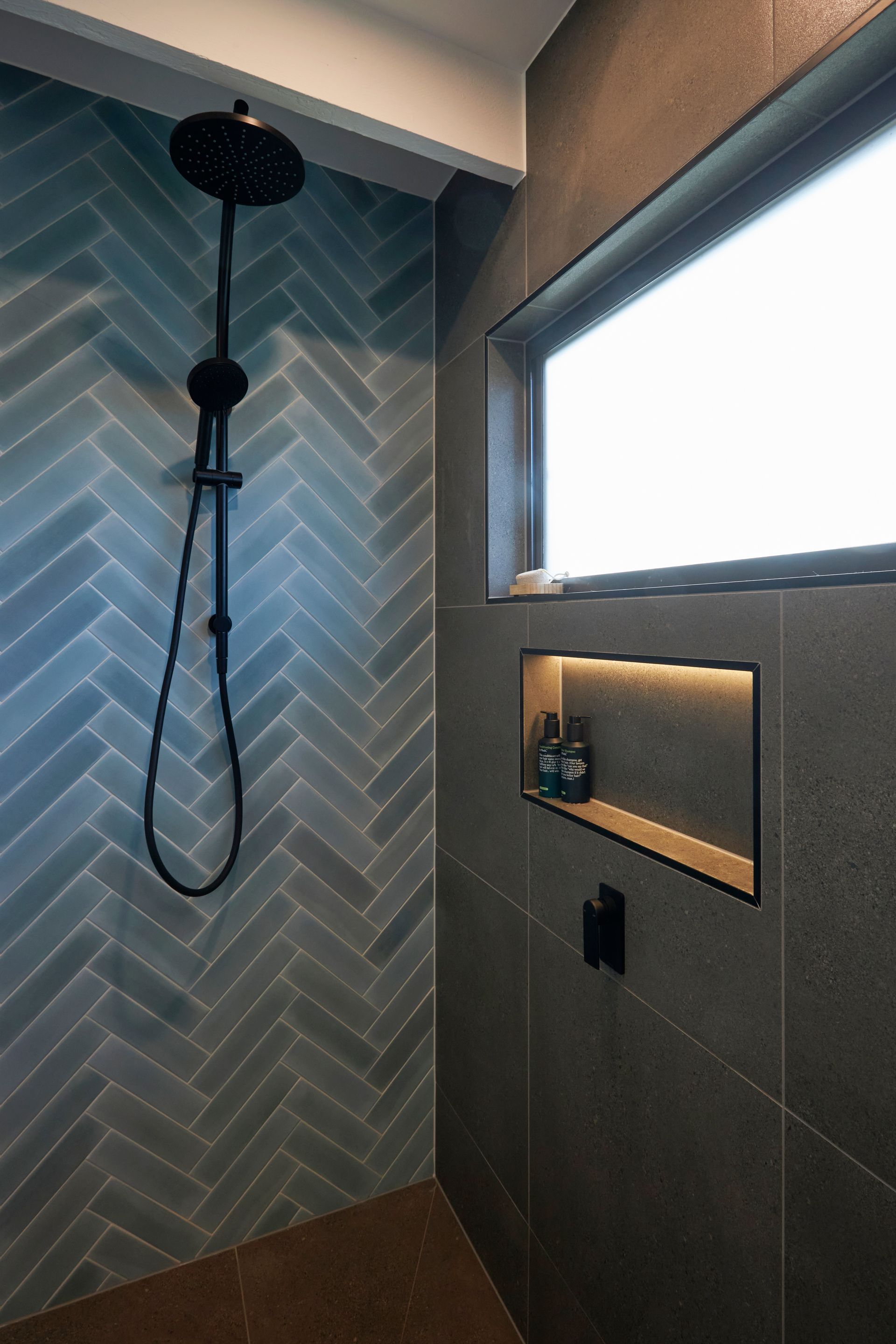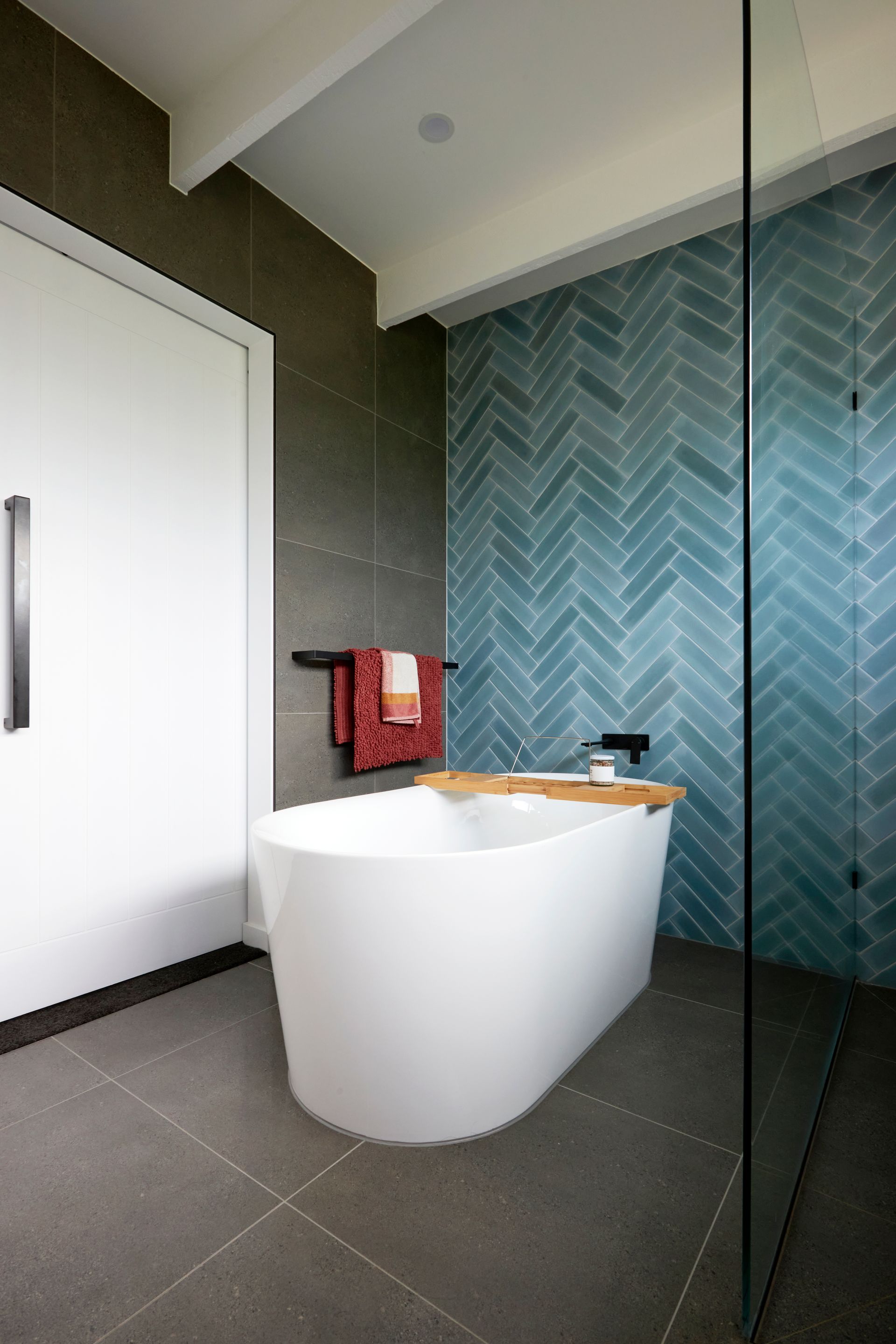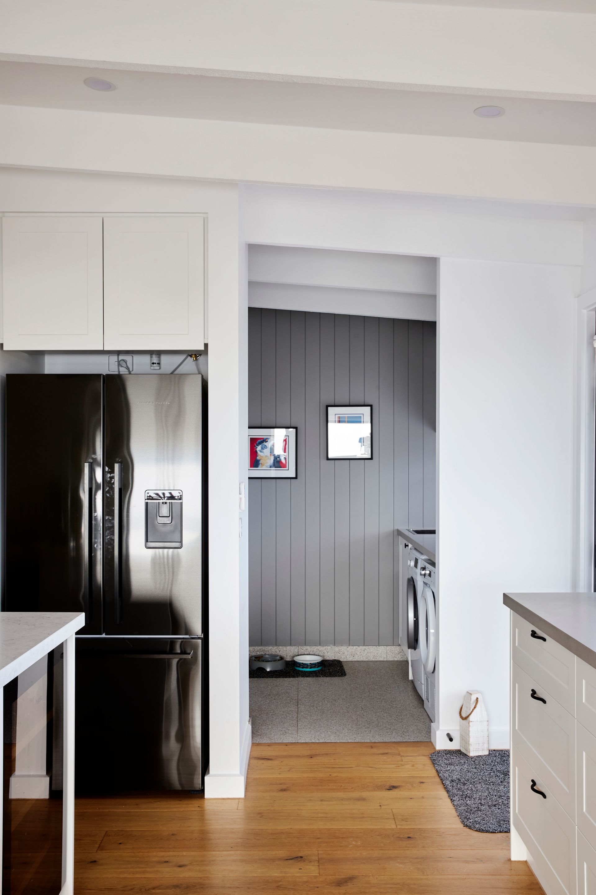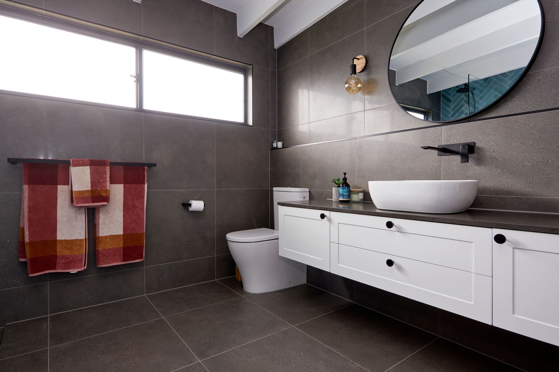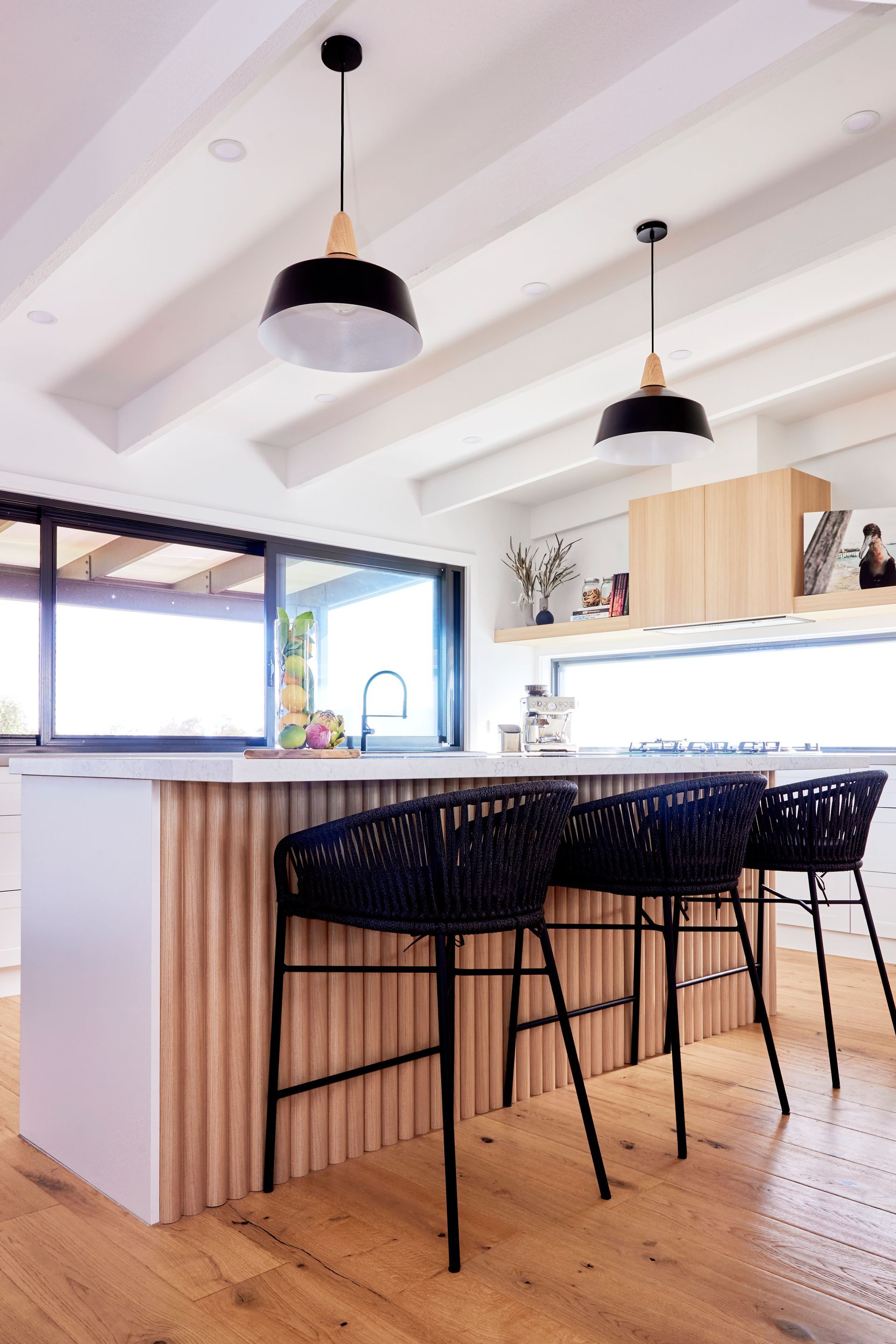 Beach house make over replacing tired asbestos walls and reconfiguring existing spaces to create a light filled modern lifestyle home. Some space was stolen from the upper story balcony to accomodate a luxury ensuite accessed from master bedroom via sliding barn doors. Morning light spills in to the ensuite through high windows.