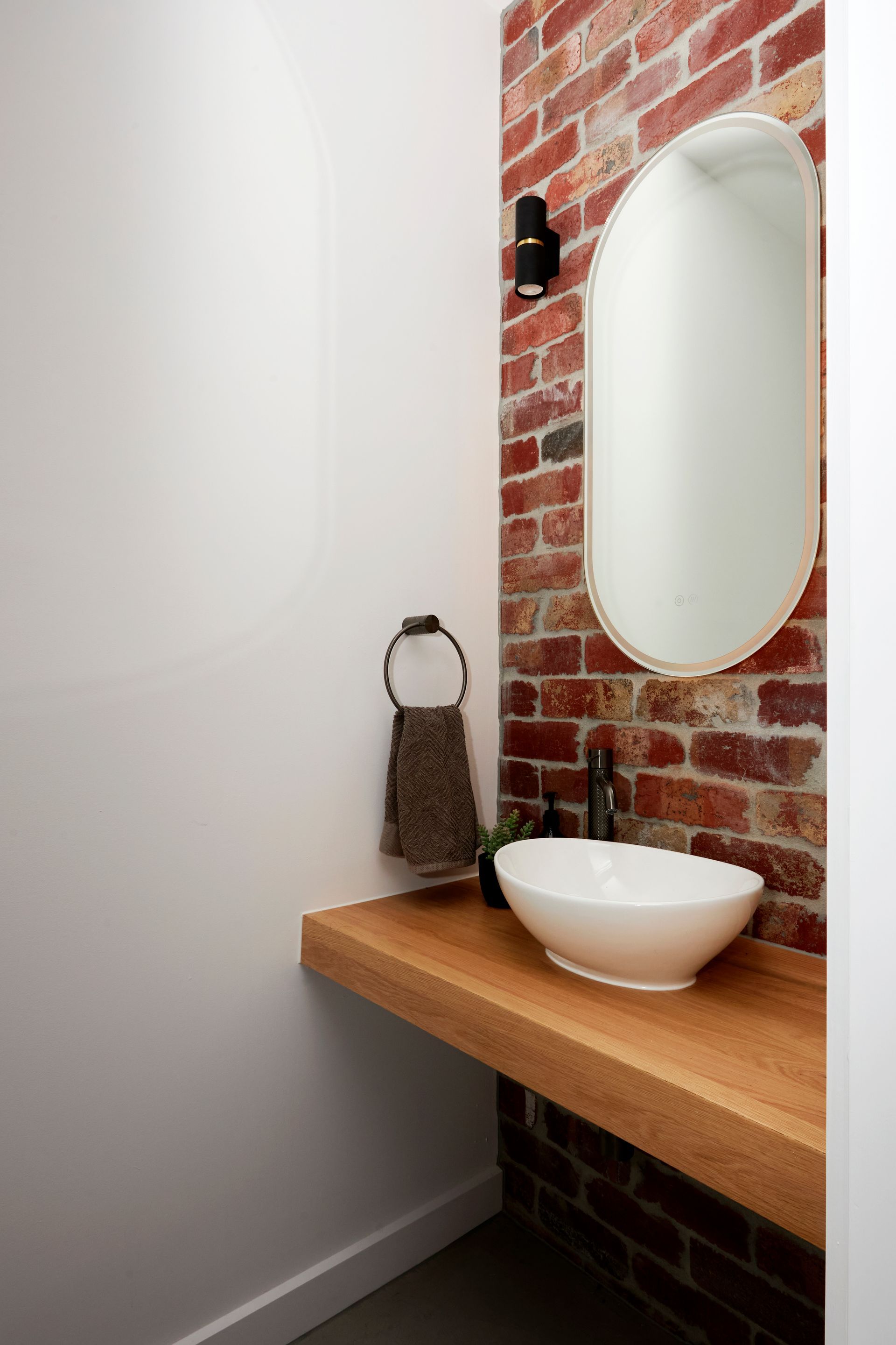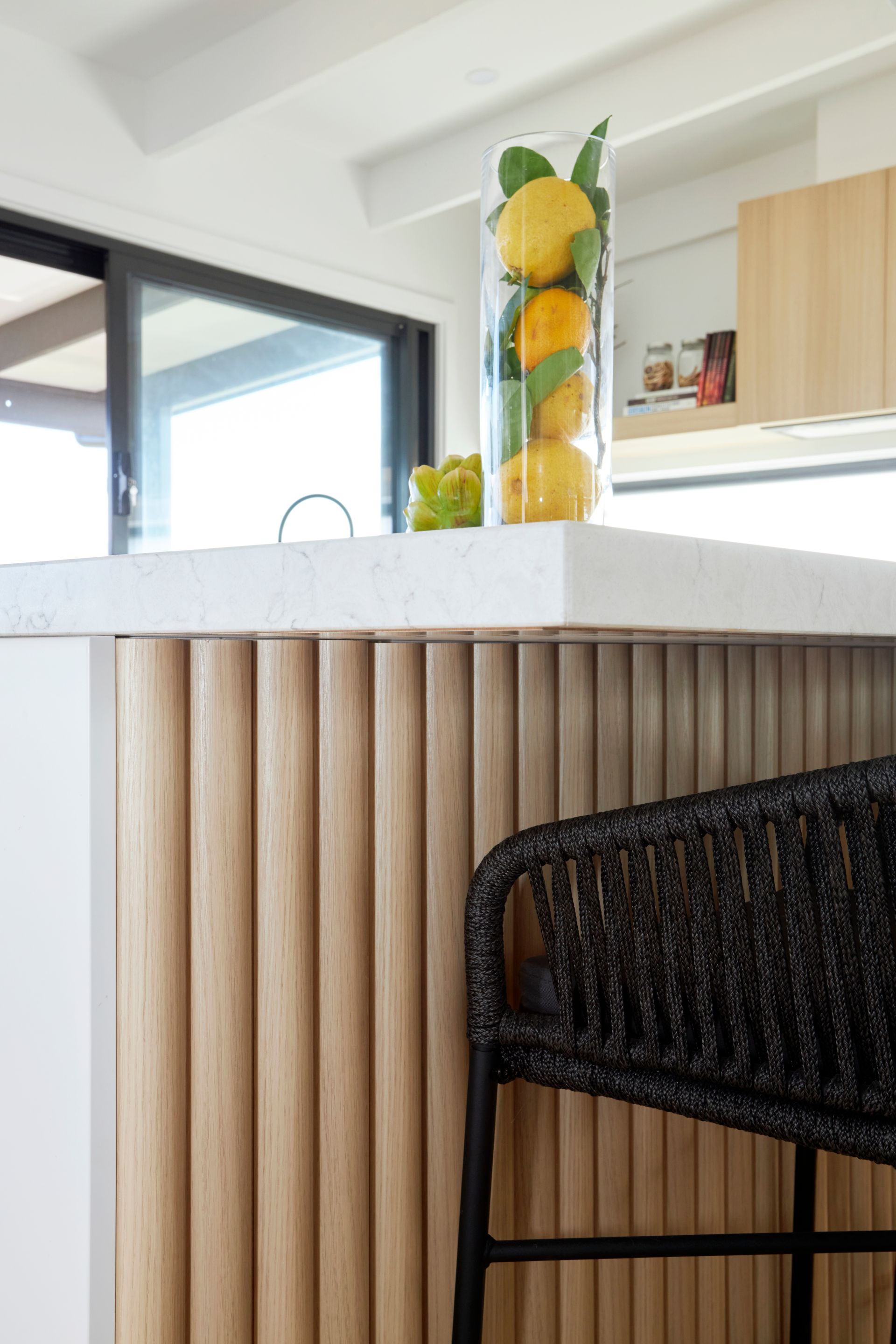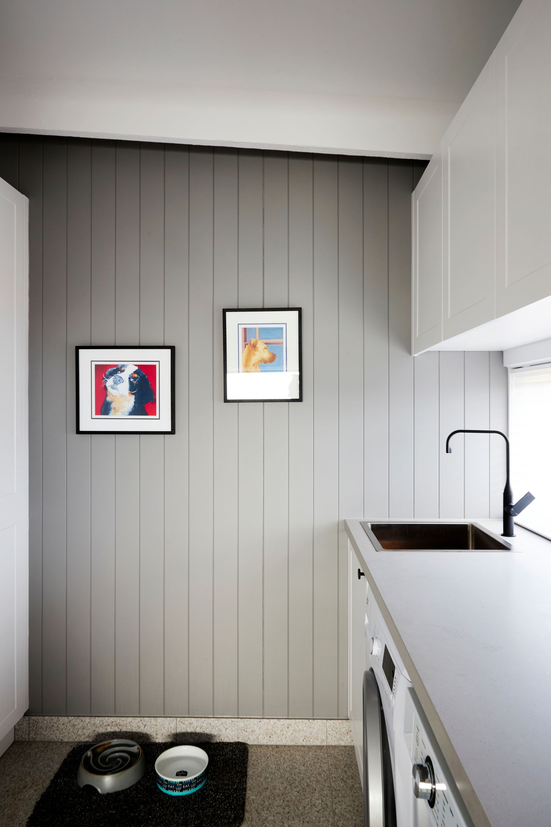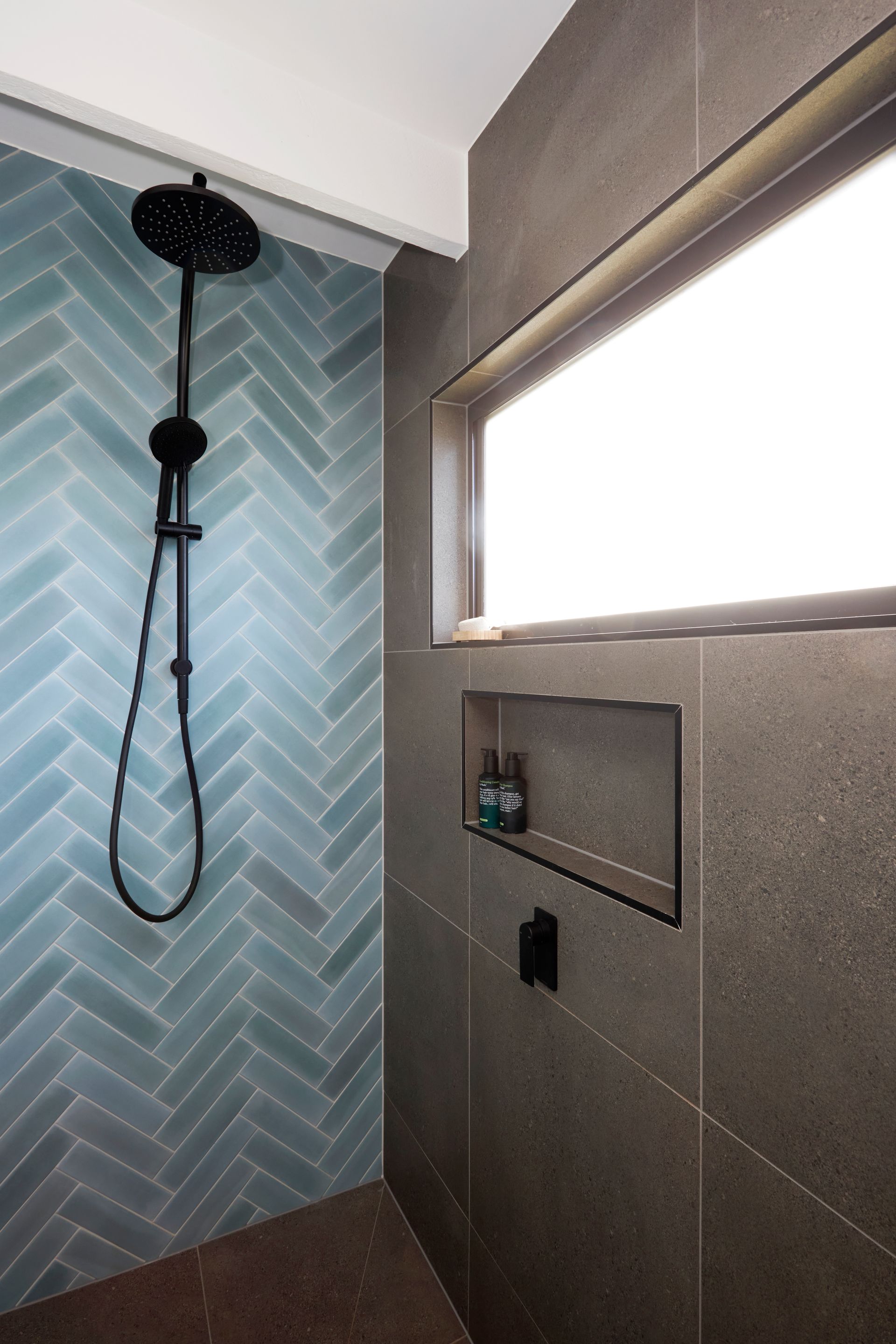 Beach house make over replacing tired asbestos walls and reconfiguring existing spaces to create a light filled modern lifestyle home. Some space was stolen from the upper story balcony to accomodate a luxury ensuite accessed from master bedroom via sliding barn doors. Morning light spills in to the ensuite through high windows.