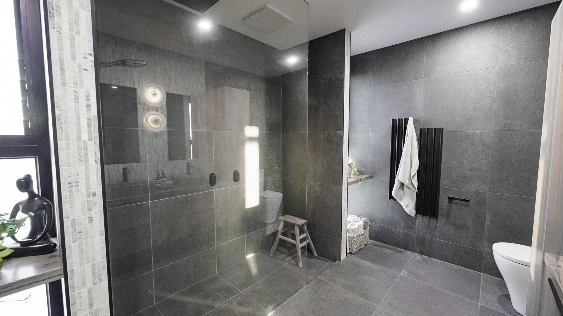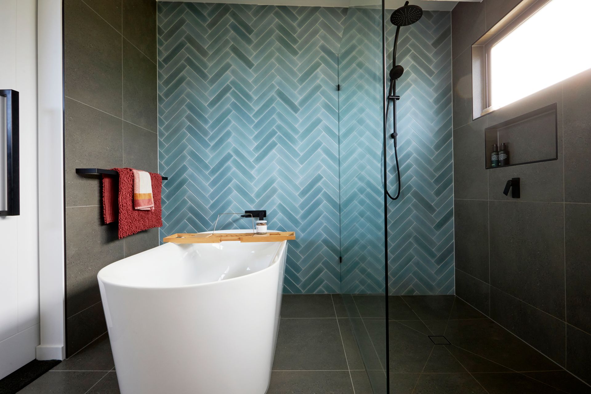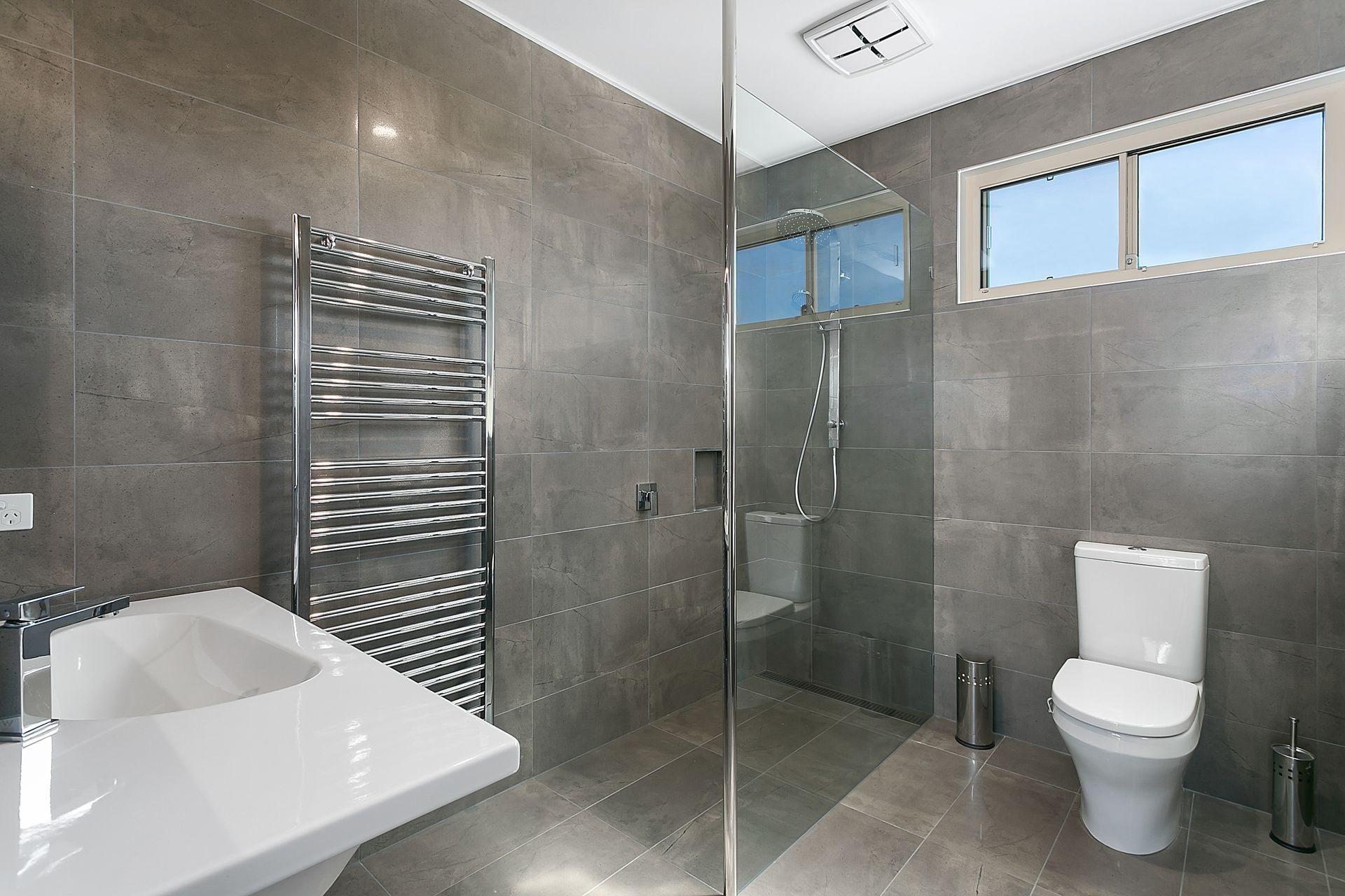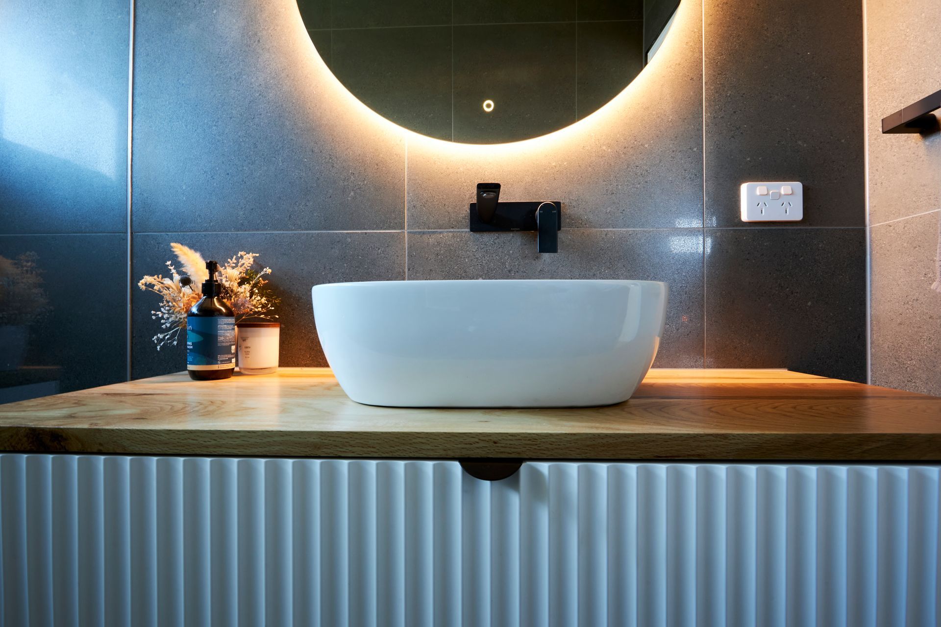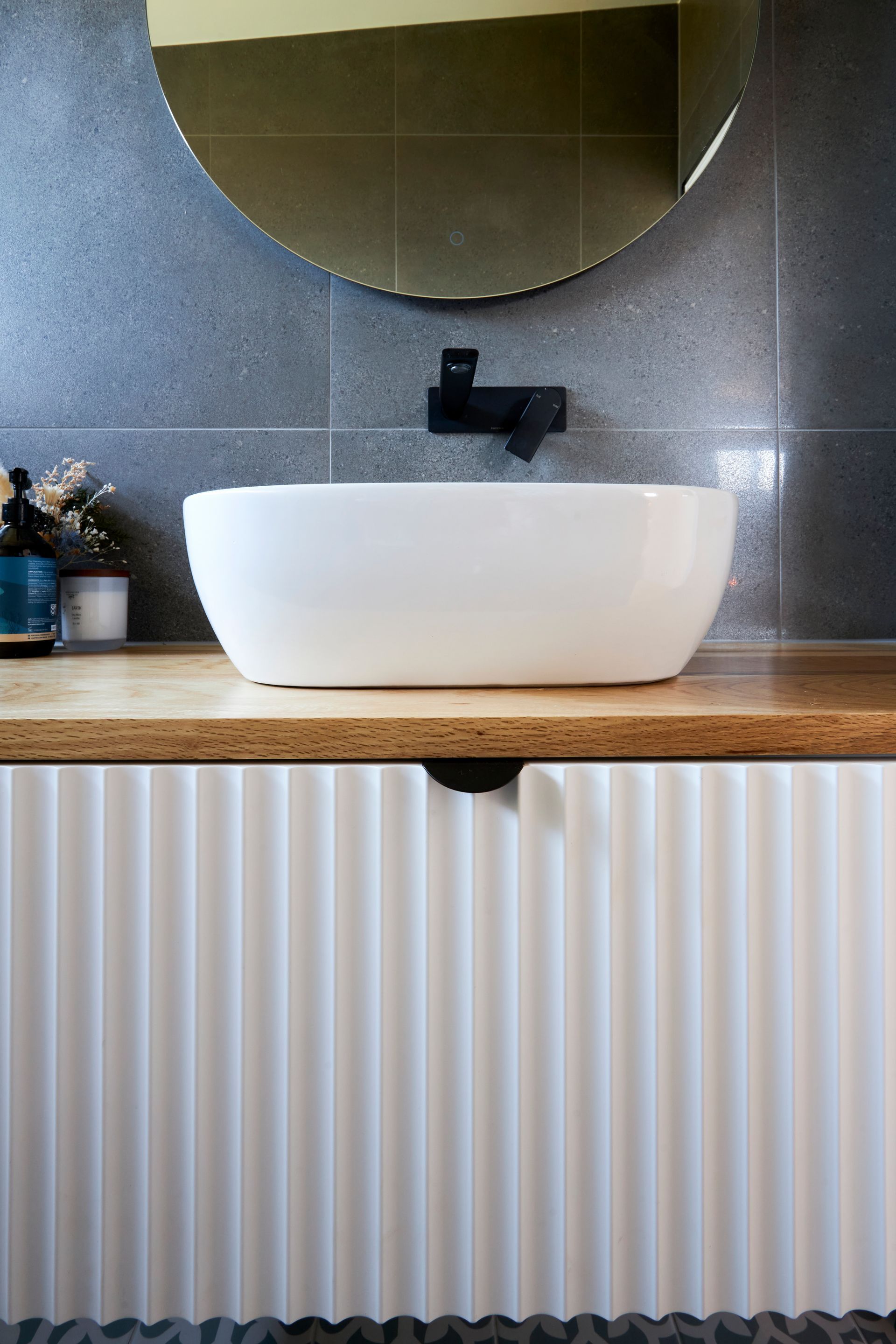 Beach house make over replacing tired asbestos walls and reconfiguring existing spaces to create a light filled modern lifestyle home. Some space was stolen from the upper story balcony to accomodate a luxury ensuite accessed from master bedroom via sliding barn doors. Morning light spills in to the ensuite through high windows.