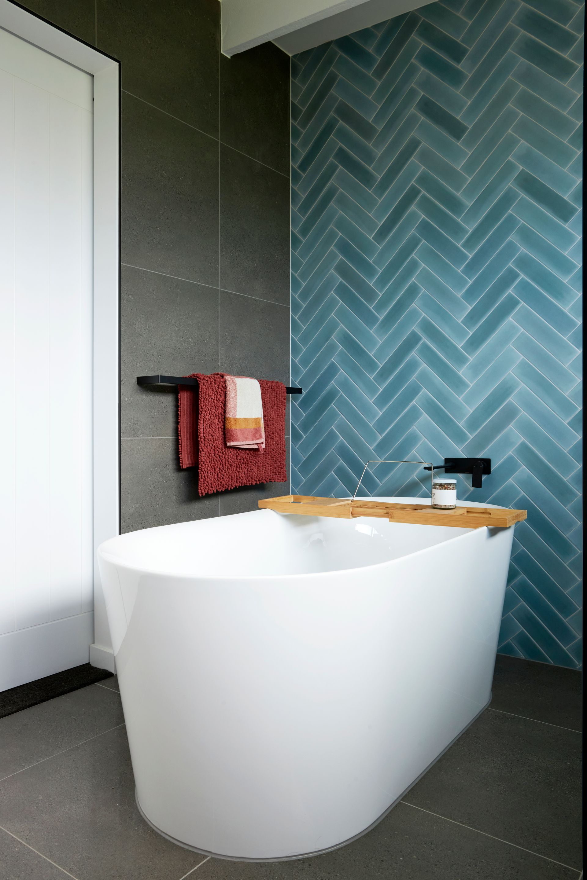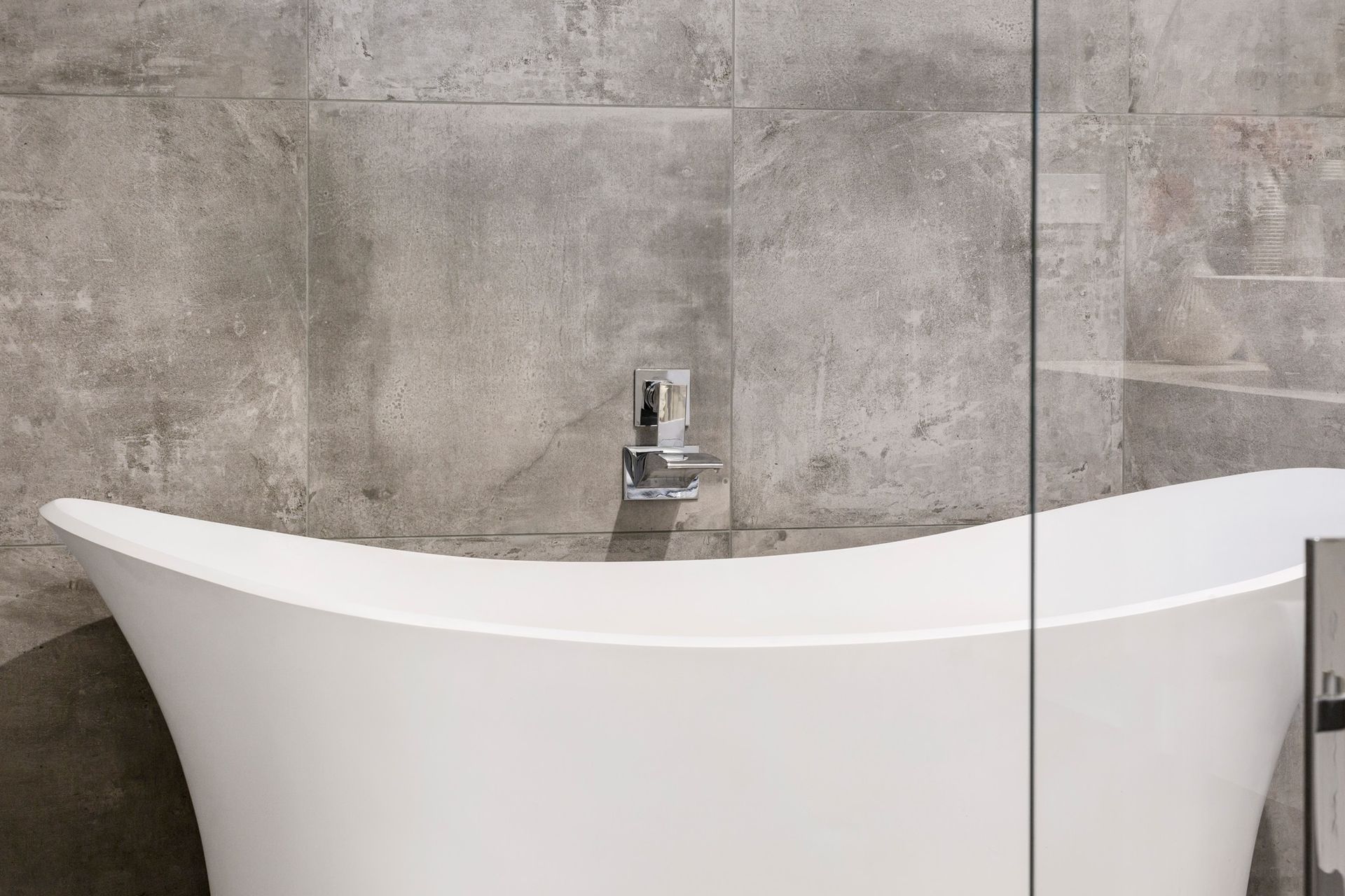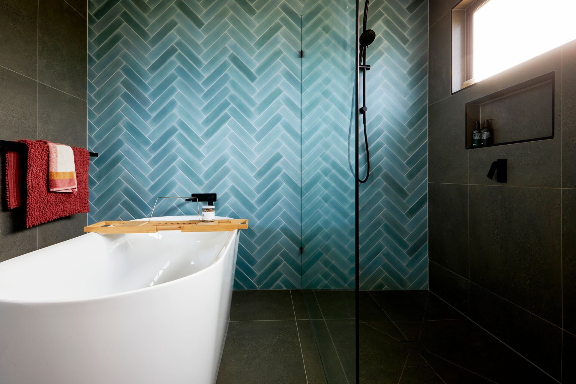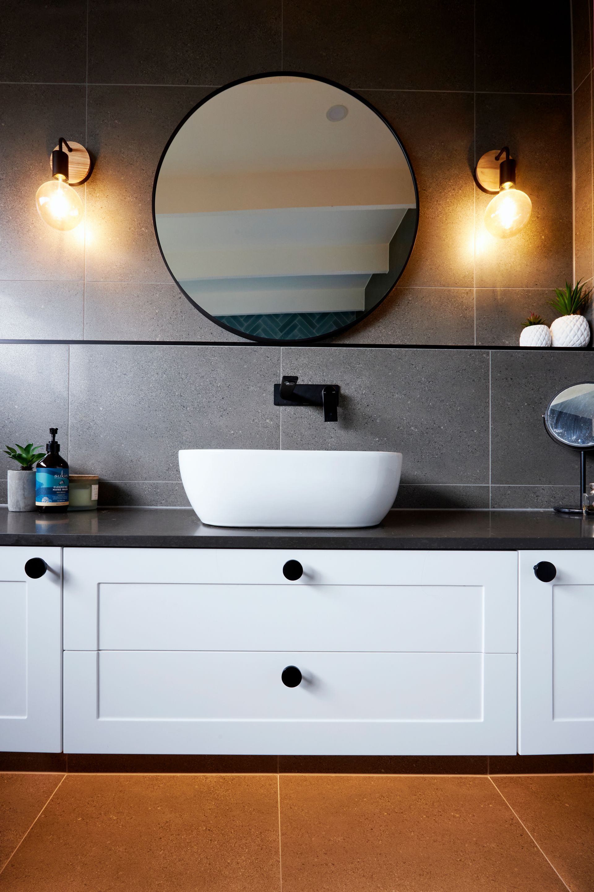 Beach house make over replacing tired asbestos walls and reconfiguring existing spaces to create a light filled modern lifestyle home. Some space was stolen from the upper story balcony to accomodate a luxury ensuite accessed from master bedroom via sliding barn doors. Morning light spills in to the ensuite through high windows.