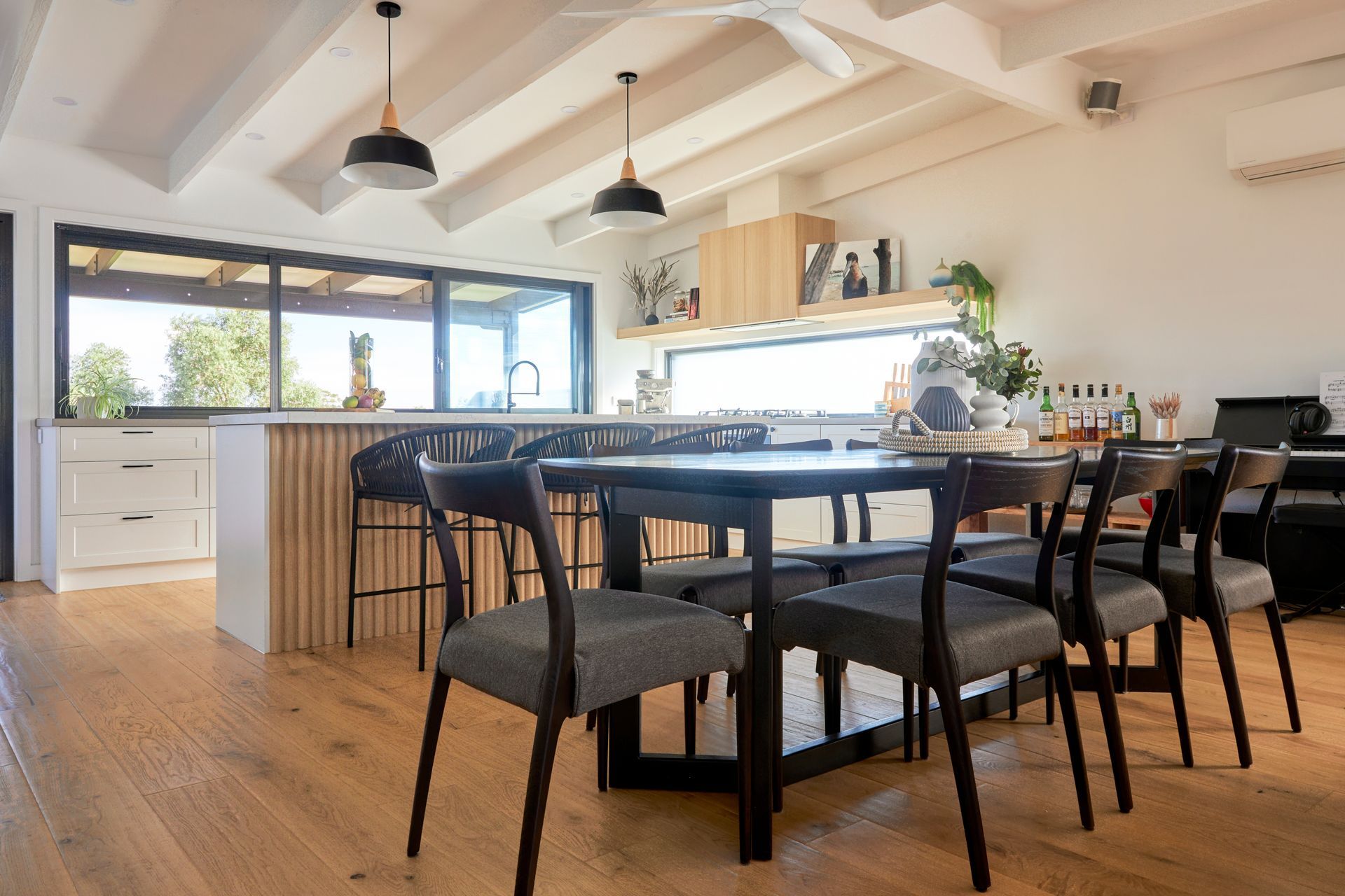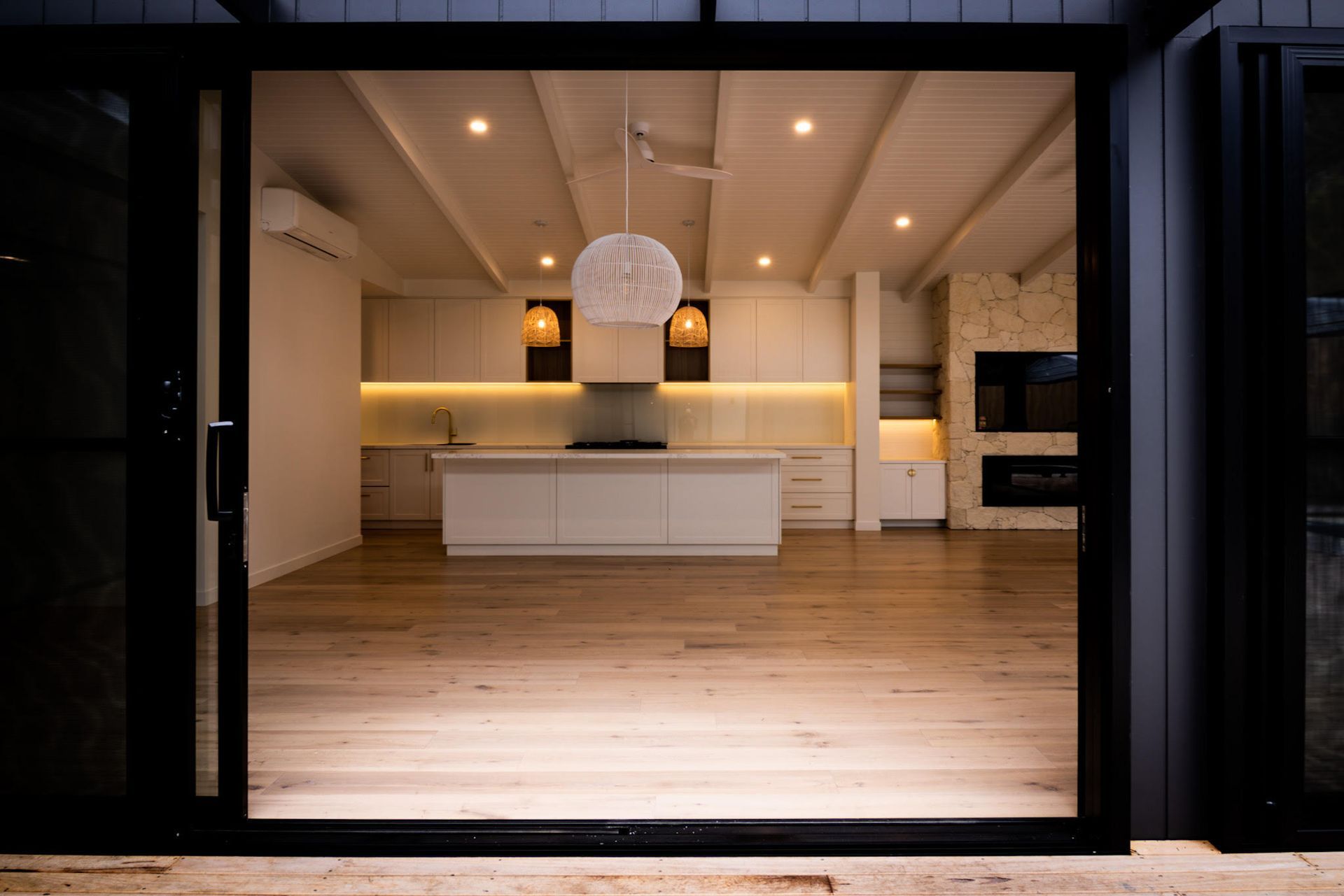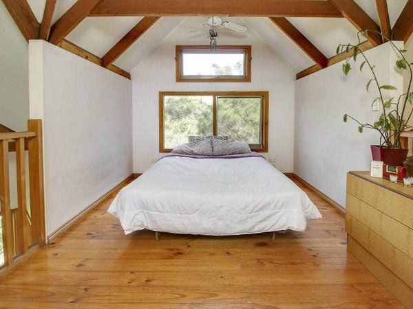 A beautiful Country cottage by the sea with a Bohemian vibe and eclectic interior accents. Ethically sourced yellow stringy bark board and batten cladding, mixed with Colorbond corrugated iron in natural woodland grey tones, are complimented by the private natural garden. Polished wood floors, soothing green interior walls with stained ply to the raked ceilings add to the relaxing interior feel, with antique doors linking rooms. Double timber French doors open out to the natural garden linking indoors with outdoors