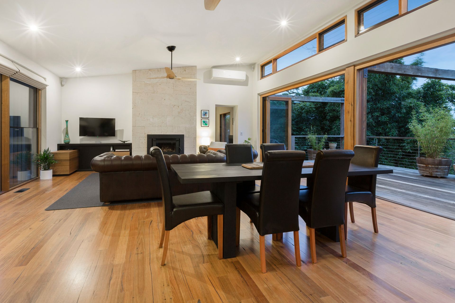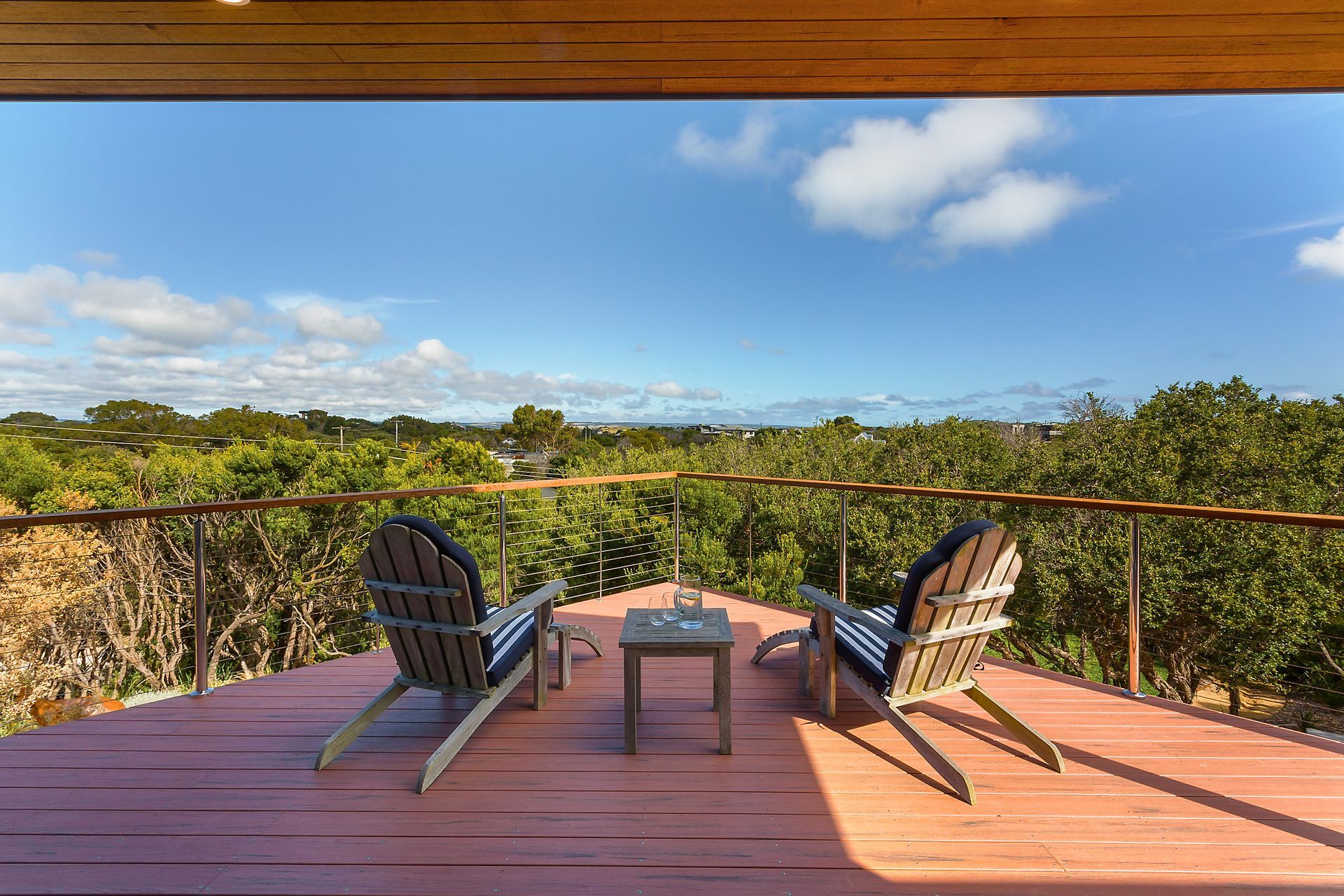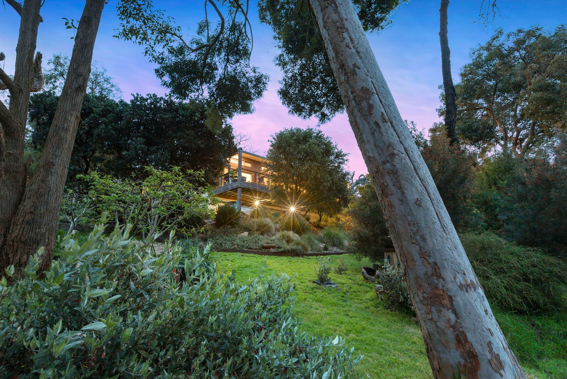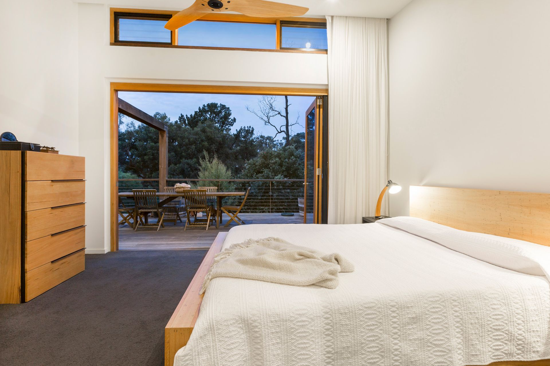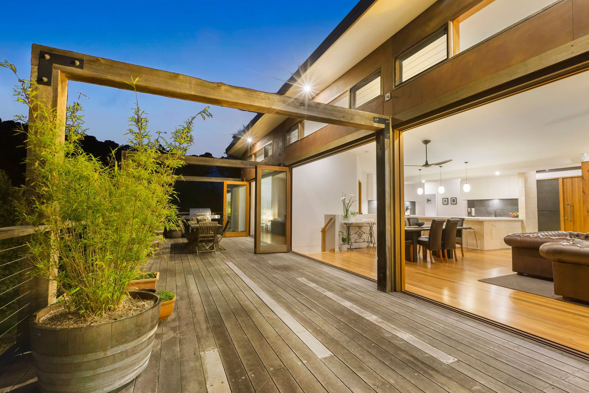 Sited on a downhill bush block with views along a creek line to Port Phillip bay and complies with stringent council controls, and bushfire regulations. Timber multi-fold doors open to a second storey deck that allow panoramic views through the available corridor and the bush shrouded creek below.
