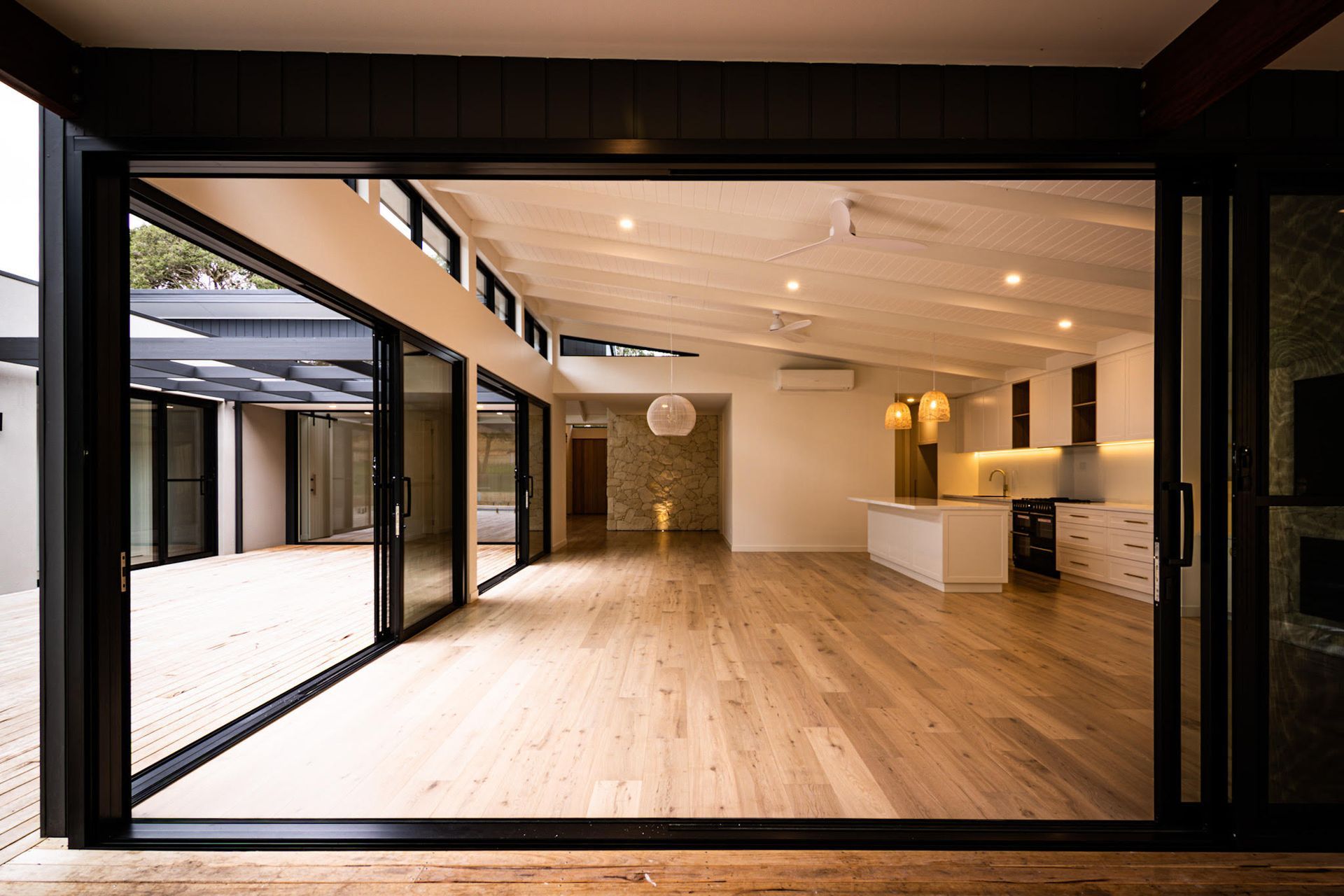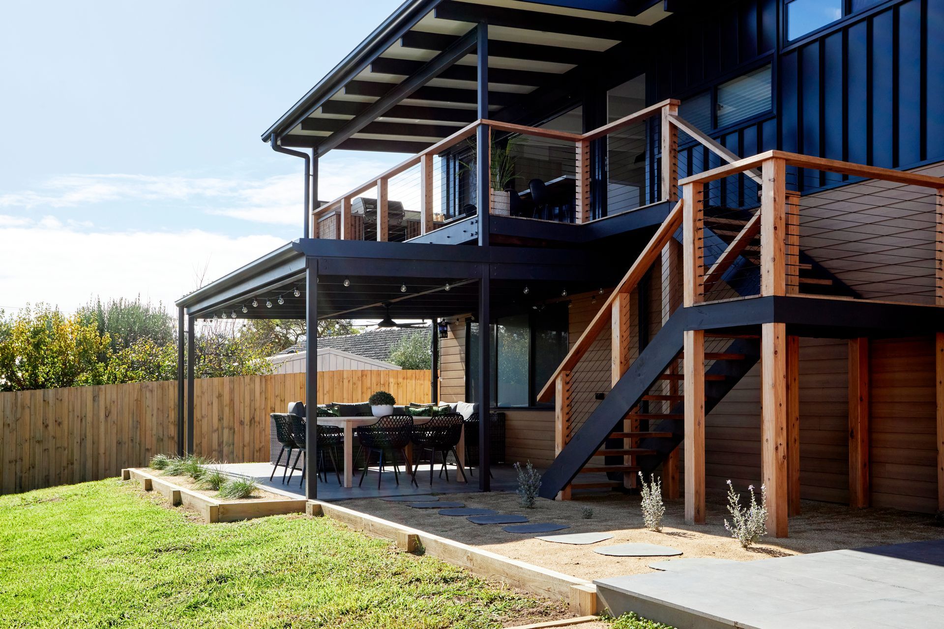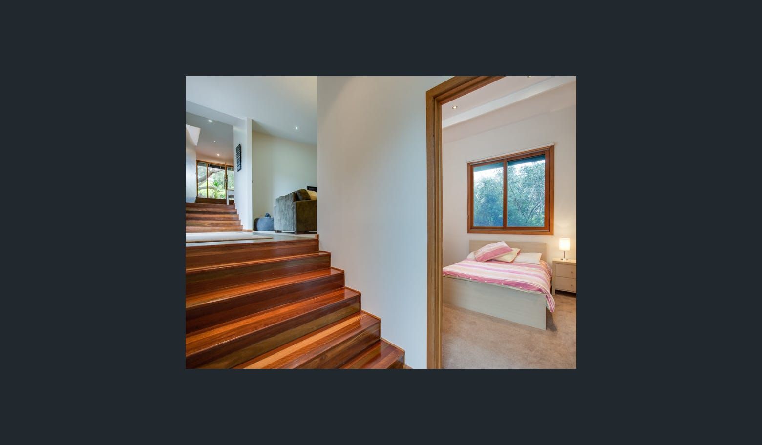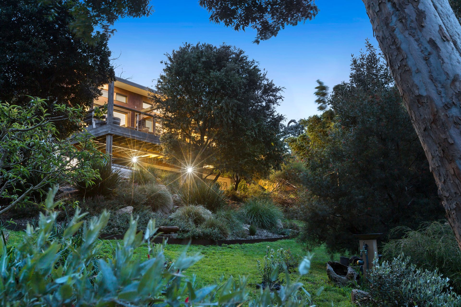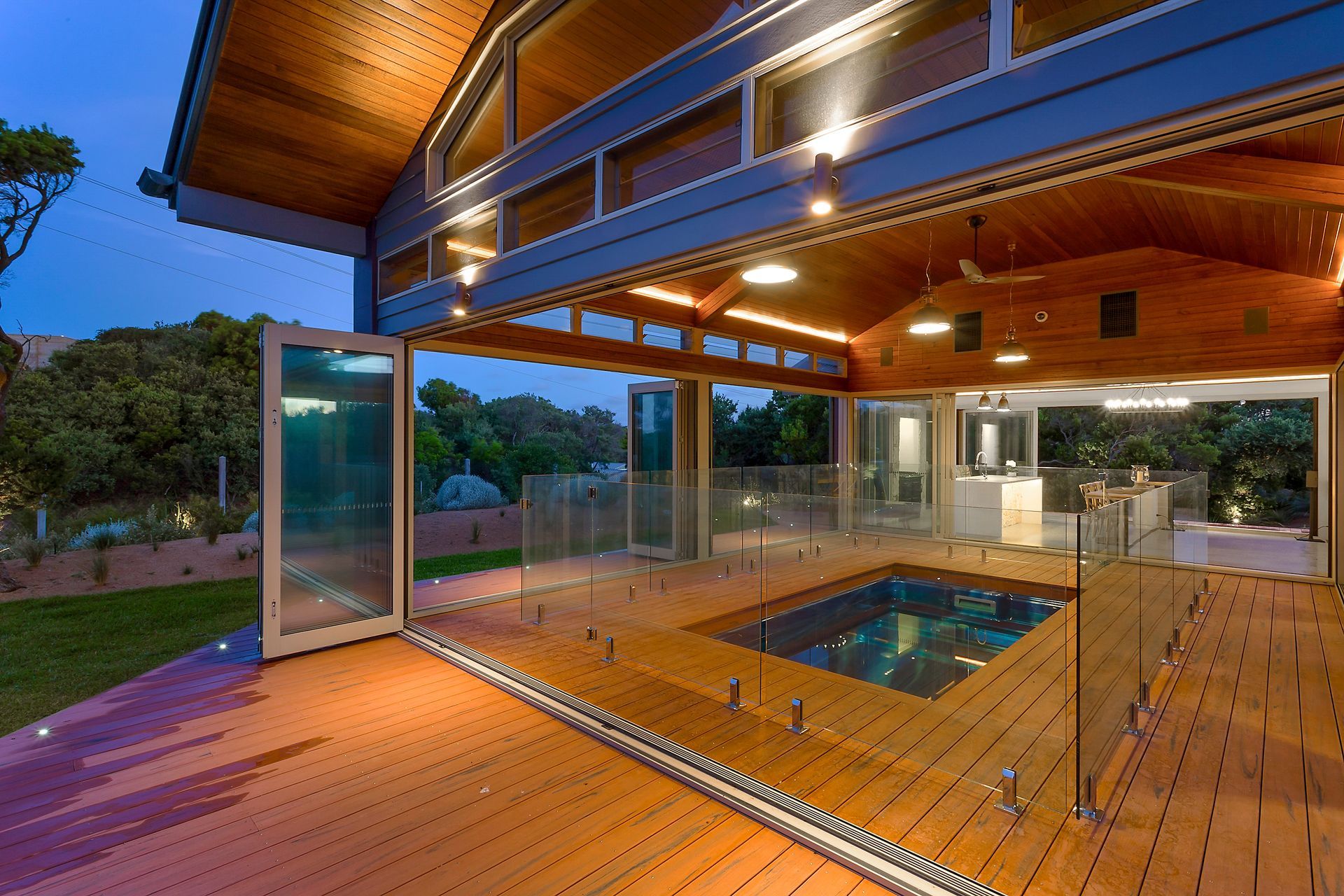 Sited on a downhill bush block with views along a creek line to Port Phillip bay and complies with stringent council controls, and bushfire regulations. Timber multi-fold doors open to a second storey deck that allow panoramic views through the available corridor and the bush shrouded creek below.