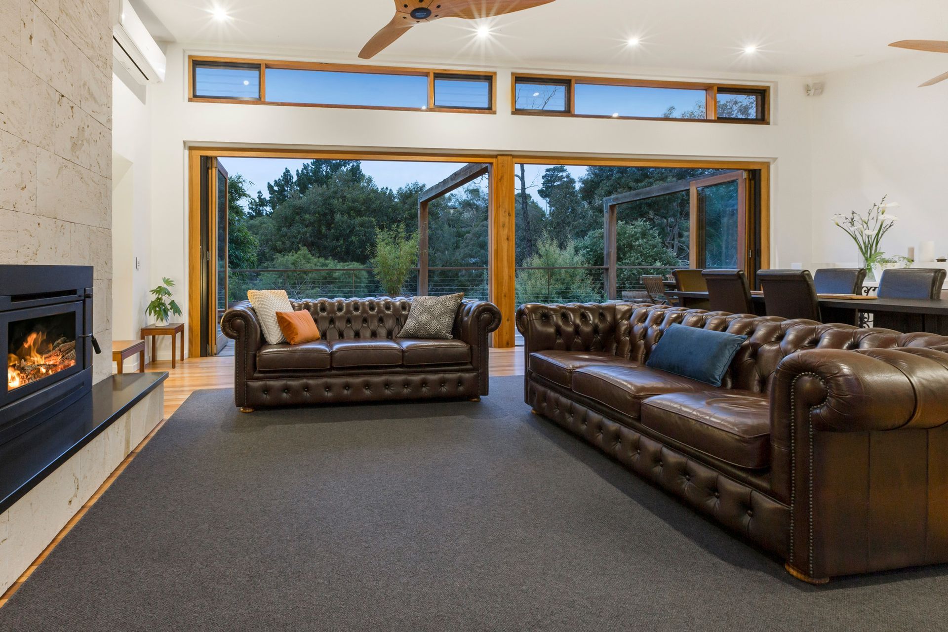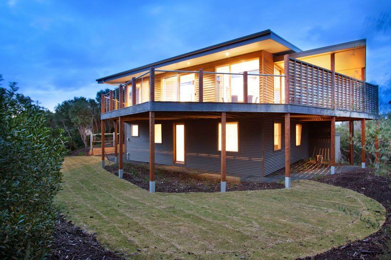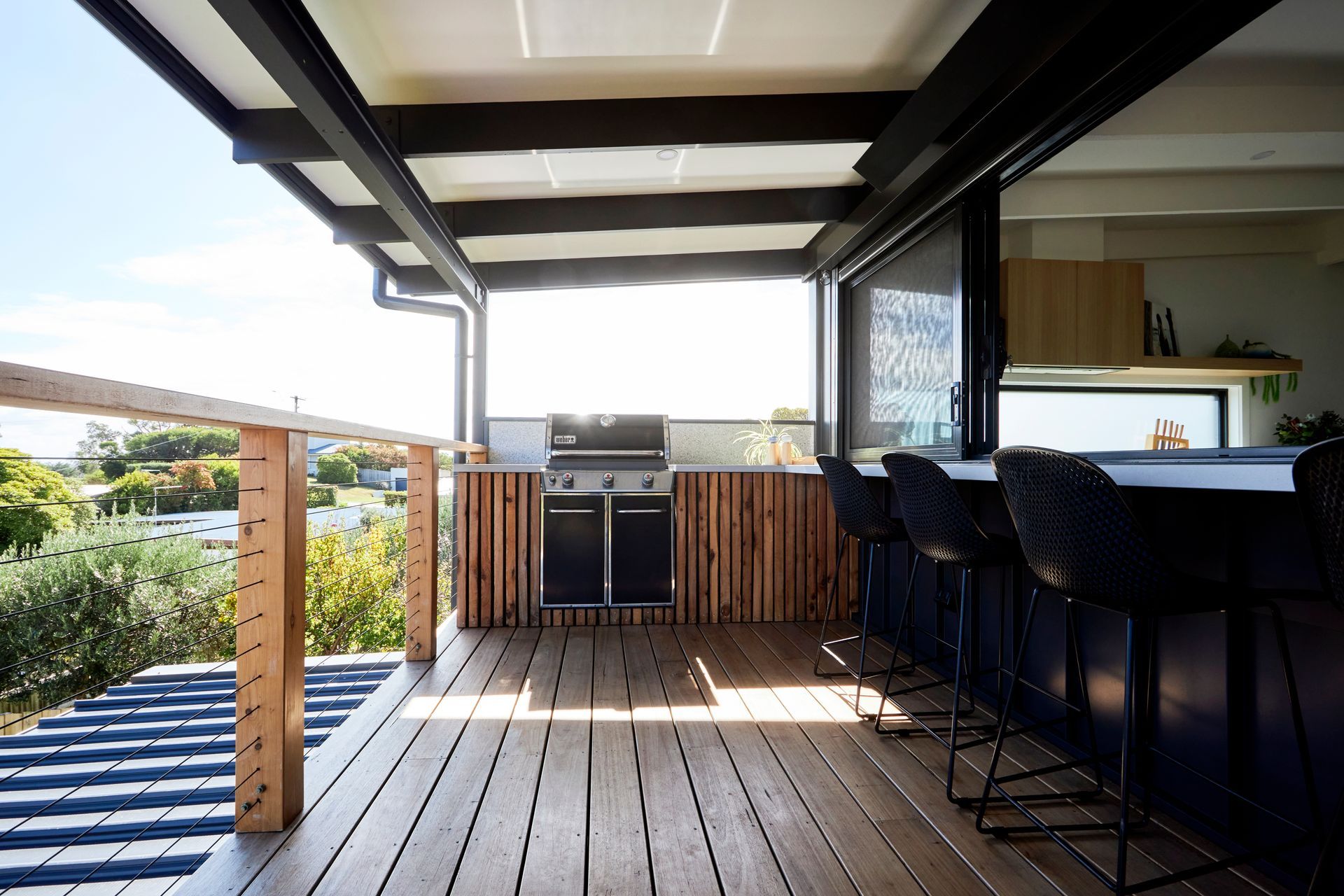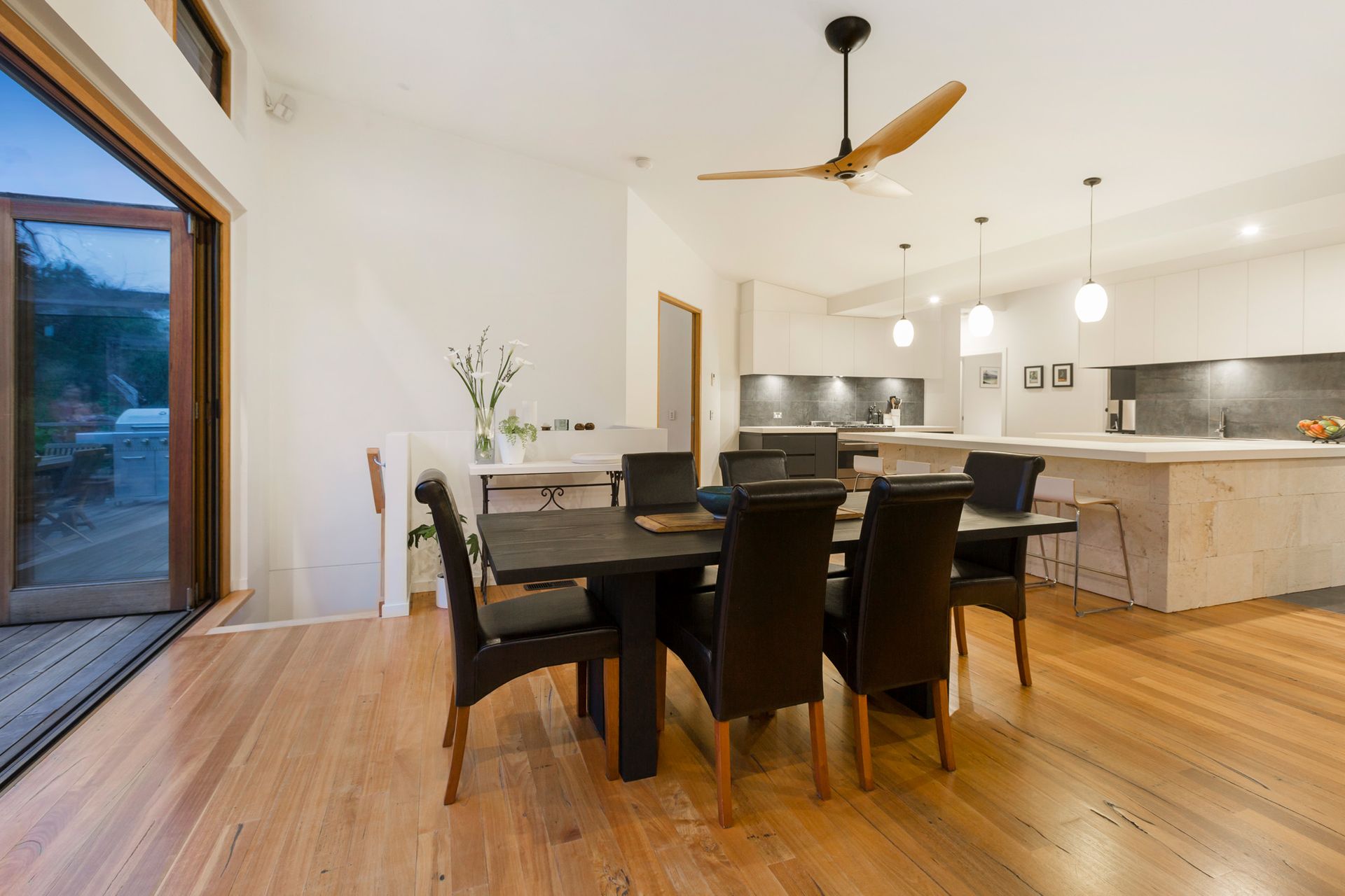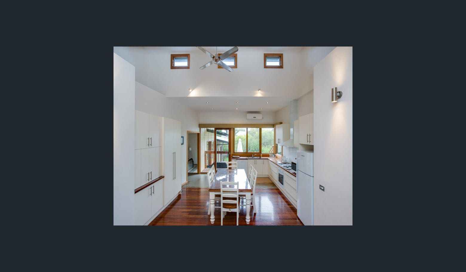 Sited on a downhill bush block with views along a creek line to Port Phillip bay and complies with stringent council controls, and bushfire regulations. Timber multi-fold doors open to a second storey deck that allow panoramic views through the available corridor and the bush shrouded creek below.