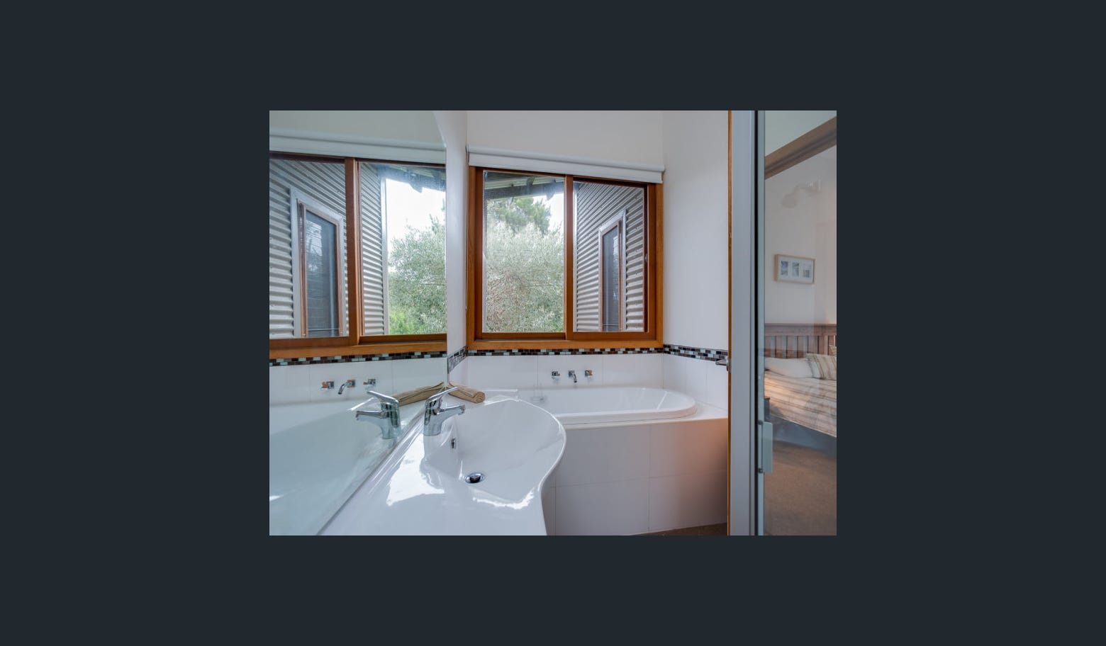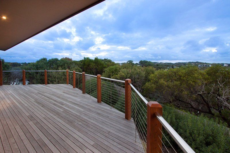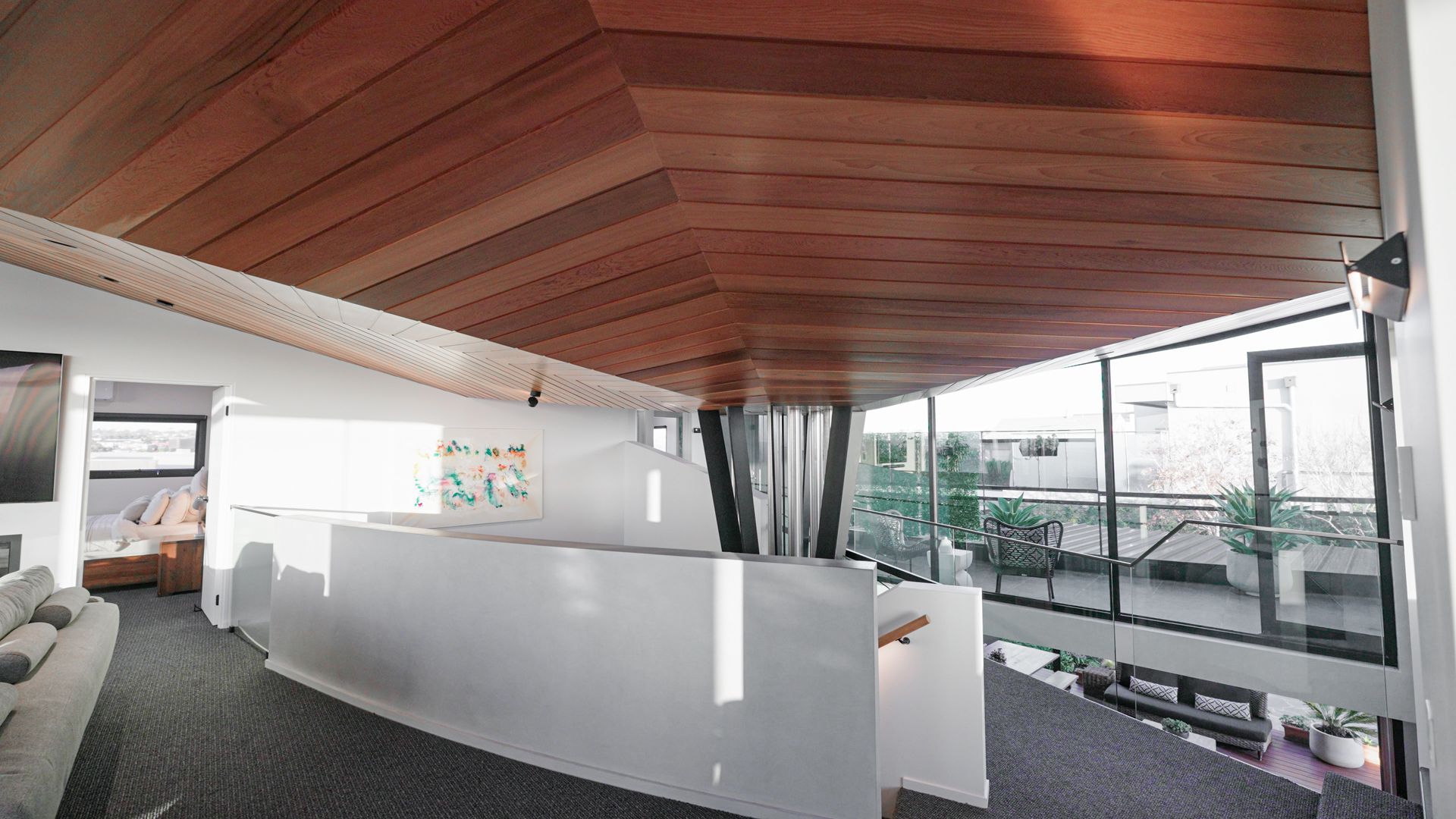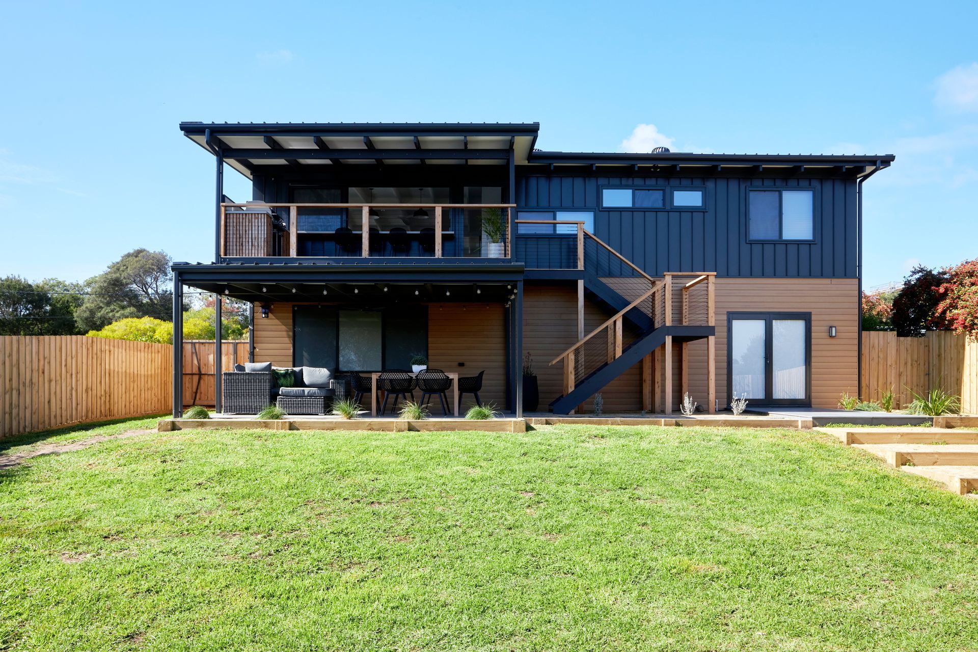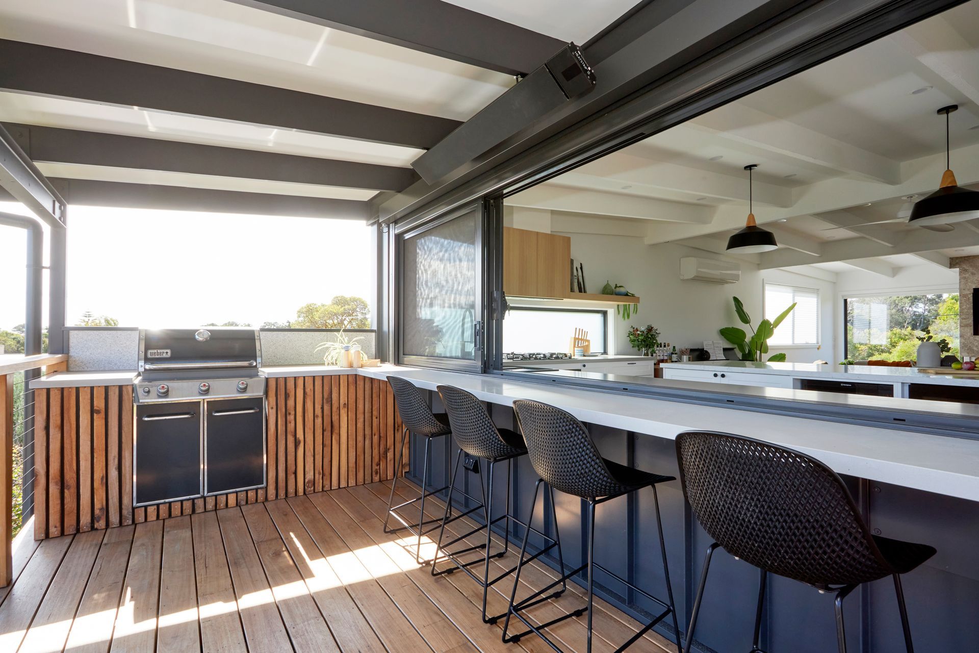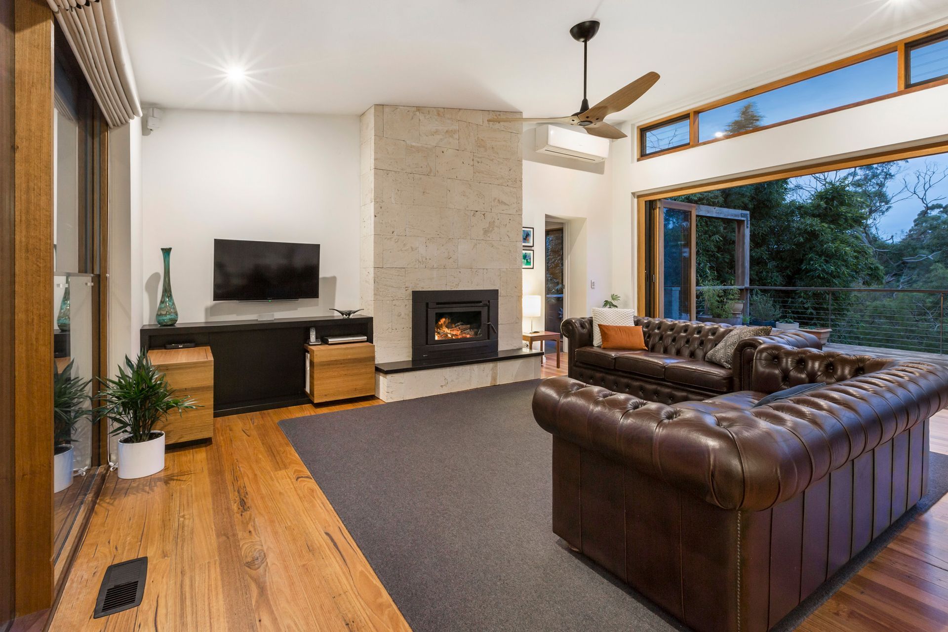 Sited on a downhill bush block with views along a creek line to Port Phillip bay and complies with stringent council controls, and bushfire regulations. Timber multi-fold doors open to a second storey deck that allow panoramic views through the available corridor and the bush shrouded creek below.
