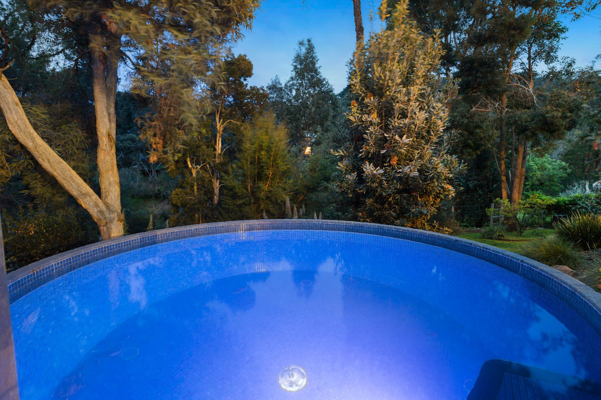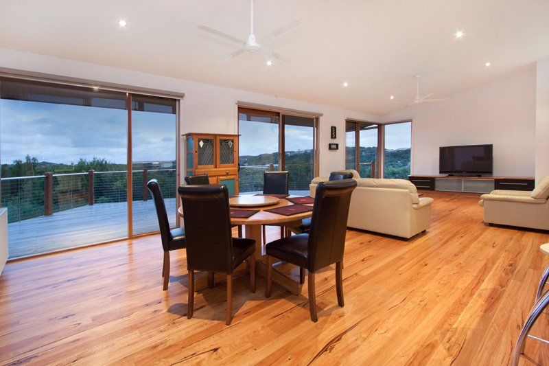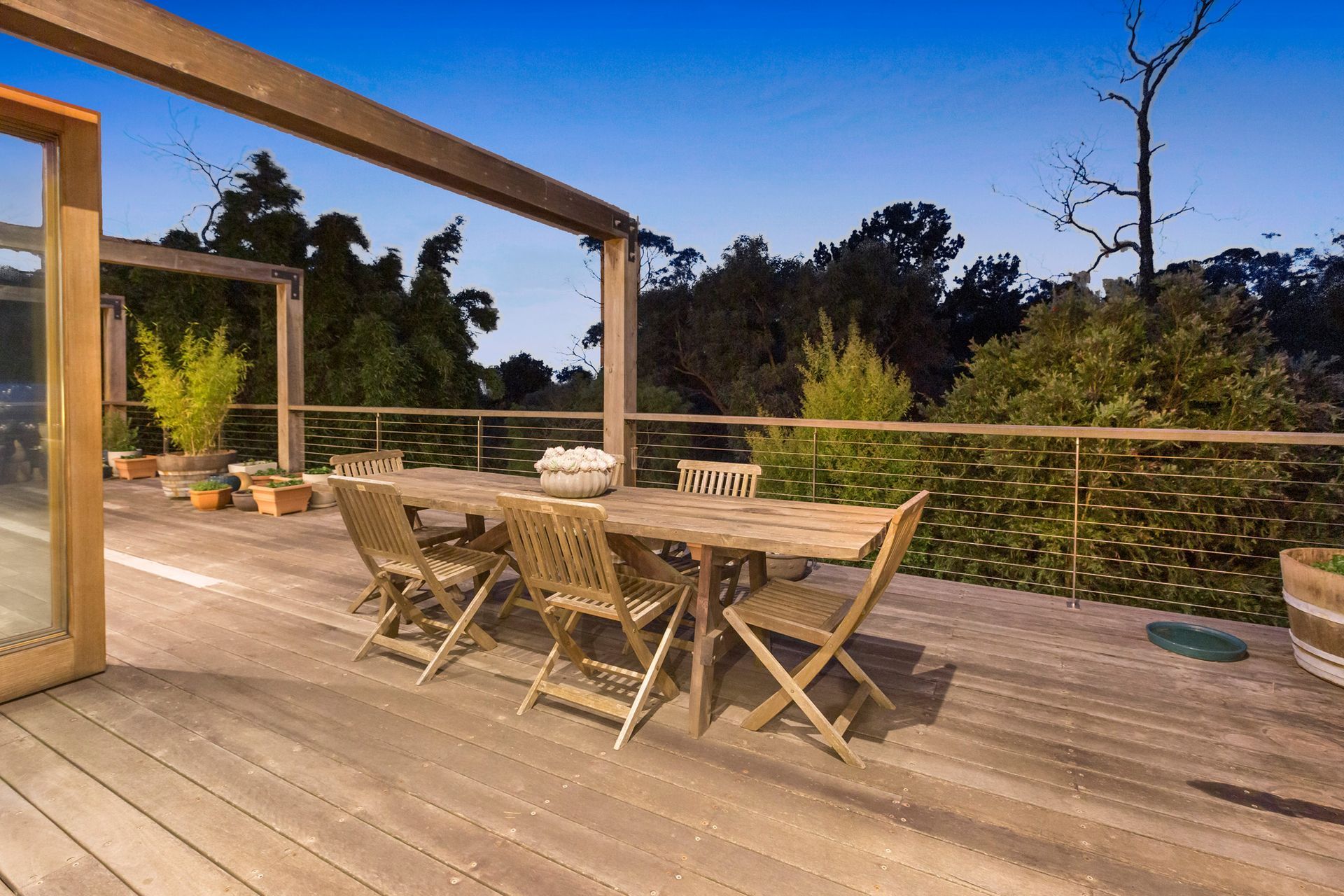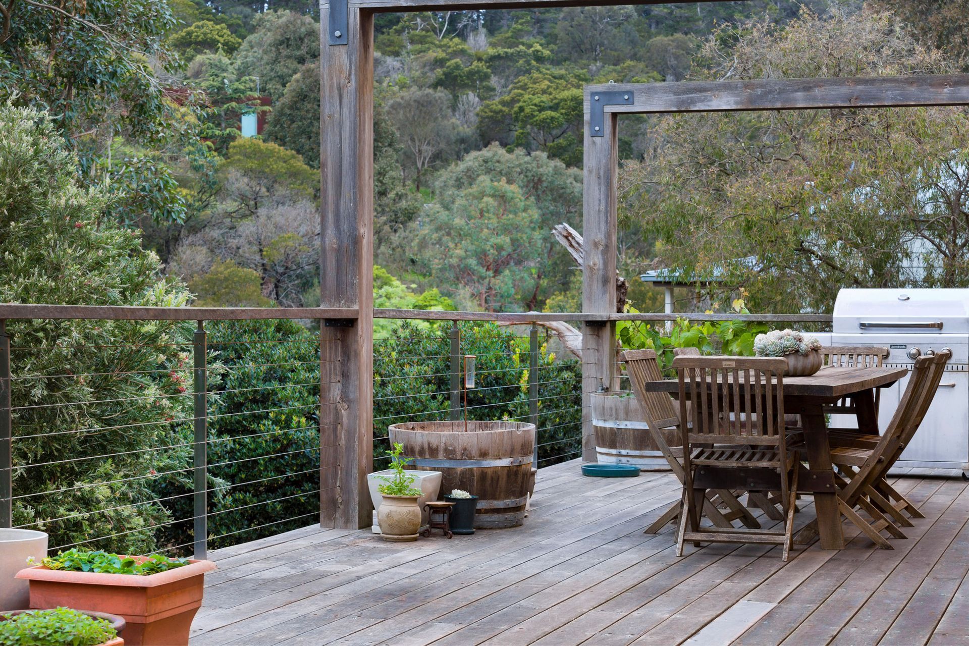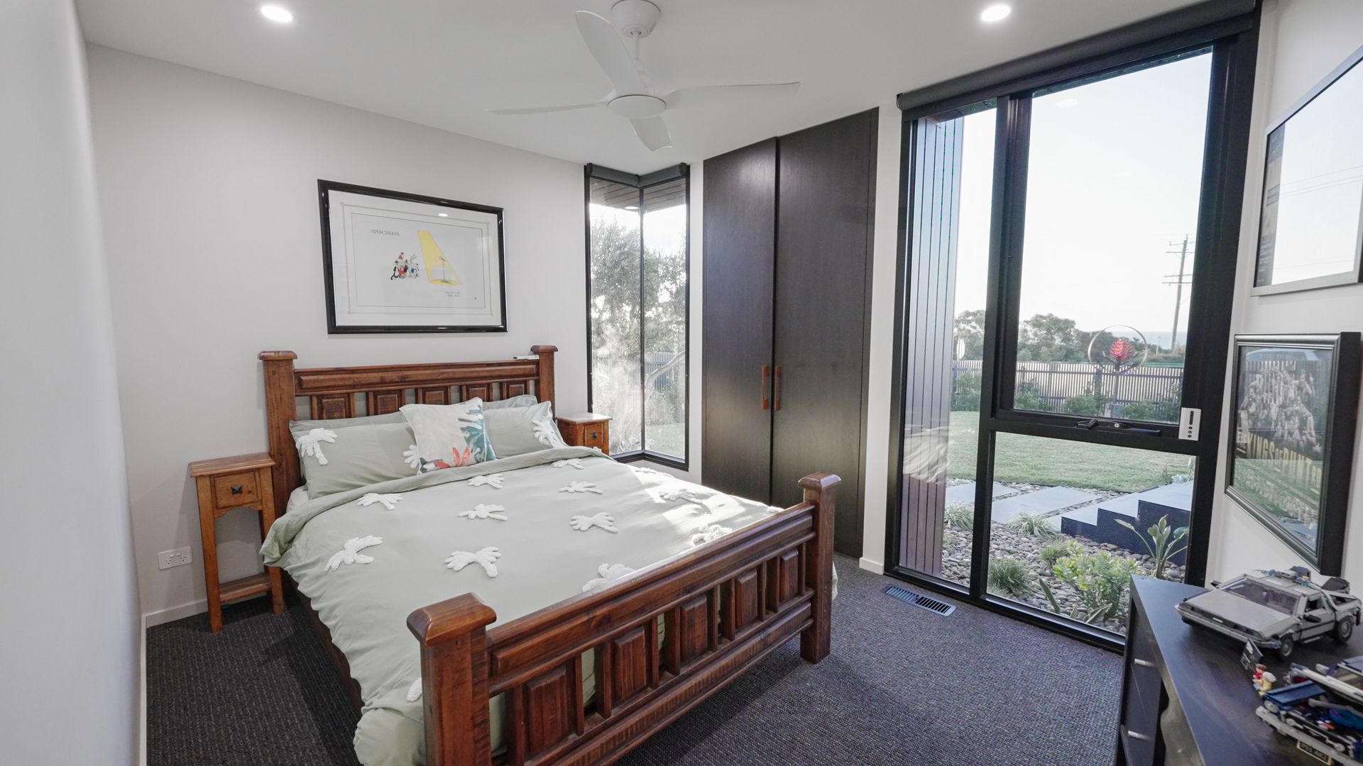 Sited on a downhill bush block with views along a creek line to Port Phillip bay and complies with stringent council controls, and bushfire regulations. Timber multi-fold doors open to a second storey deck that allow panoramic views through the available corridor and the bush shrouded creek below.