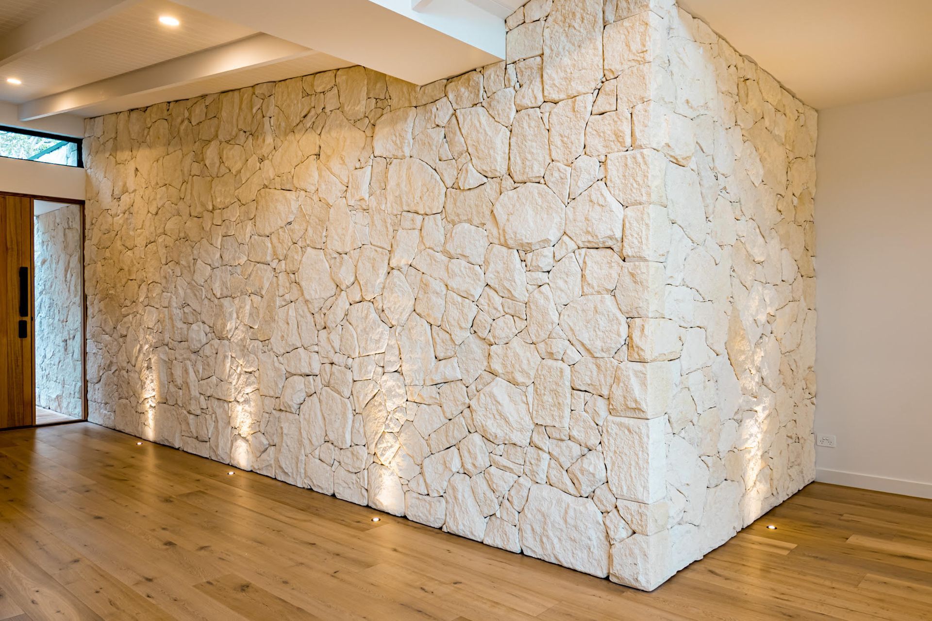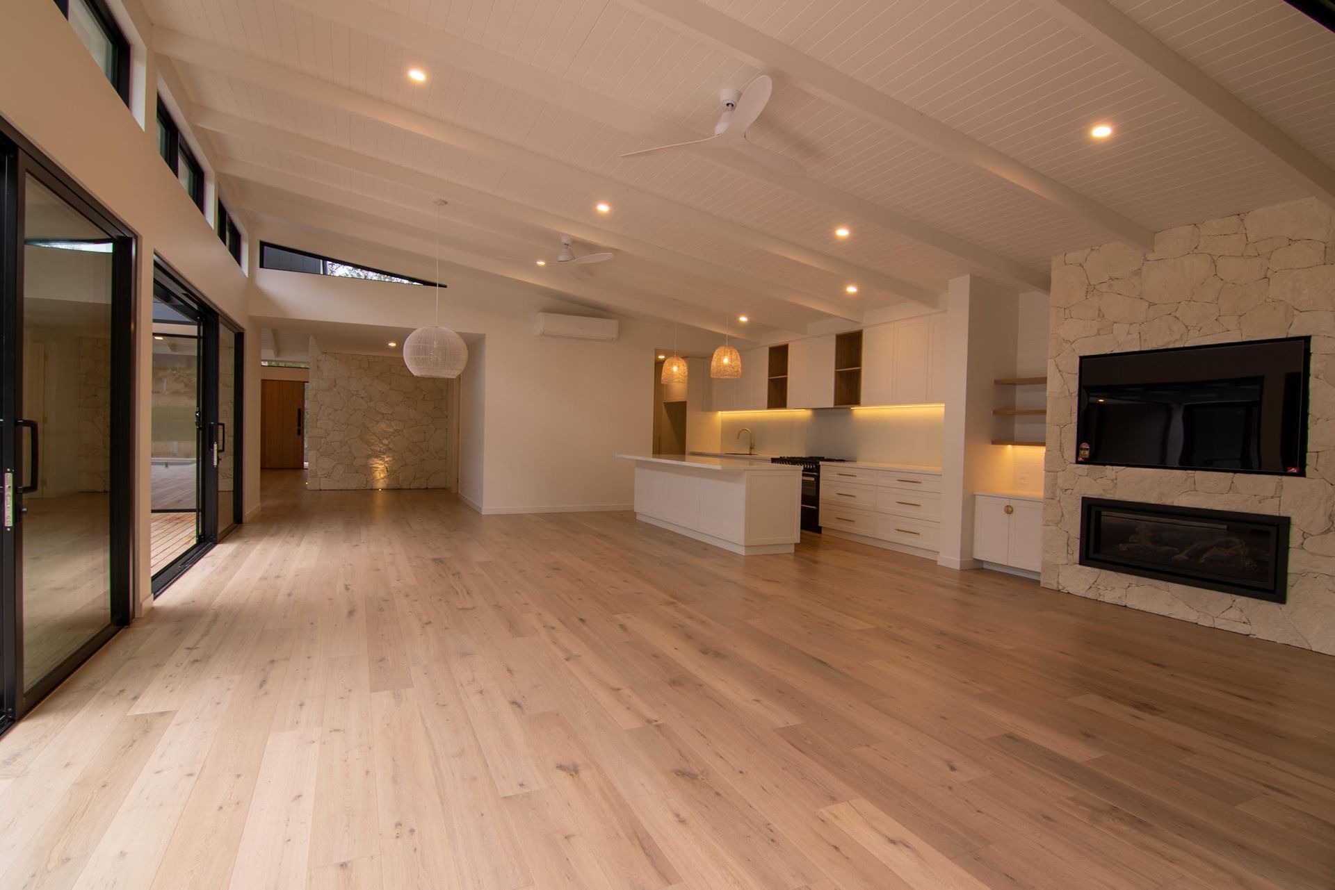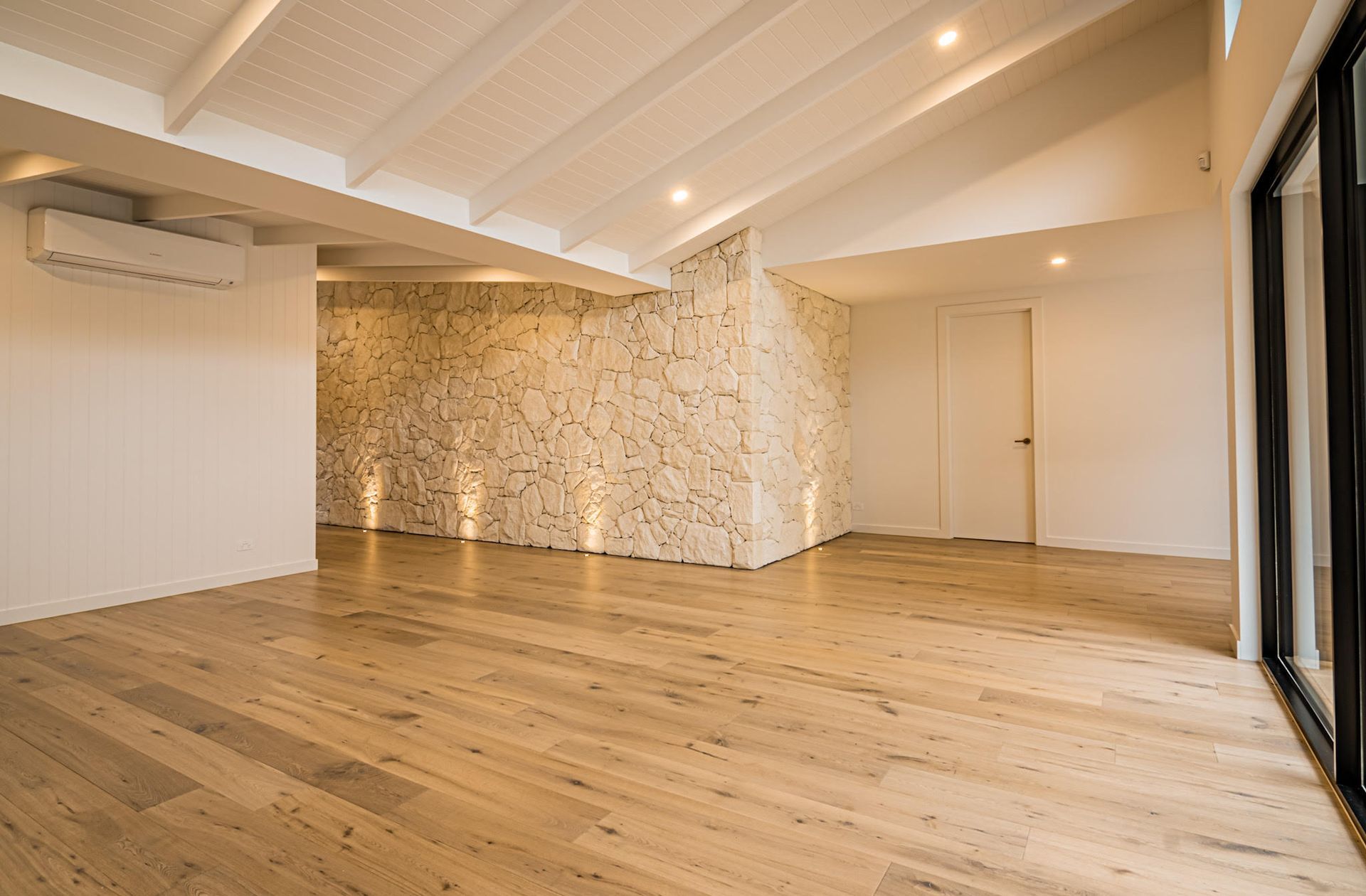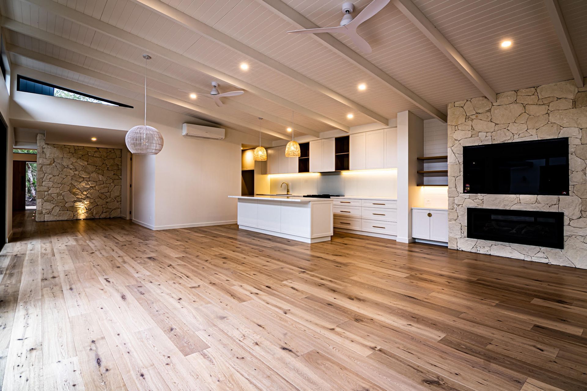 Natural materials and polished timber floors feature in the style of natural sustainable architecture in this house. Exterior and interior elements include natural random rubble Limestone feature walls. Interior features include stone bench tops, white timber lining boards, exposed white timber beams and feature white shiplap to walls.