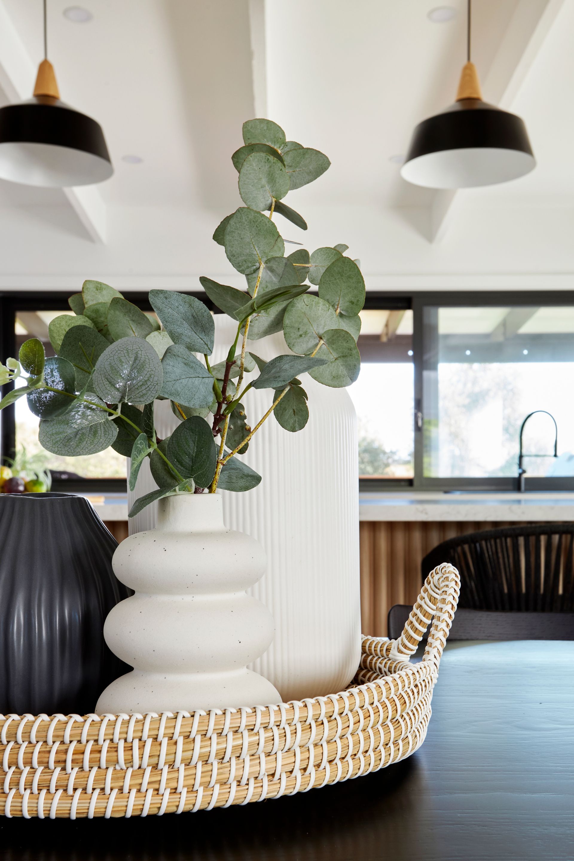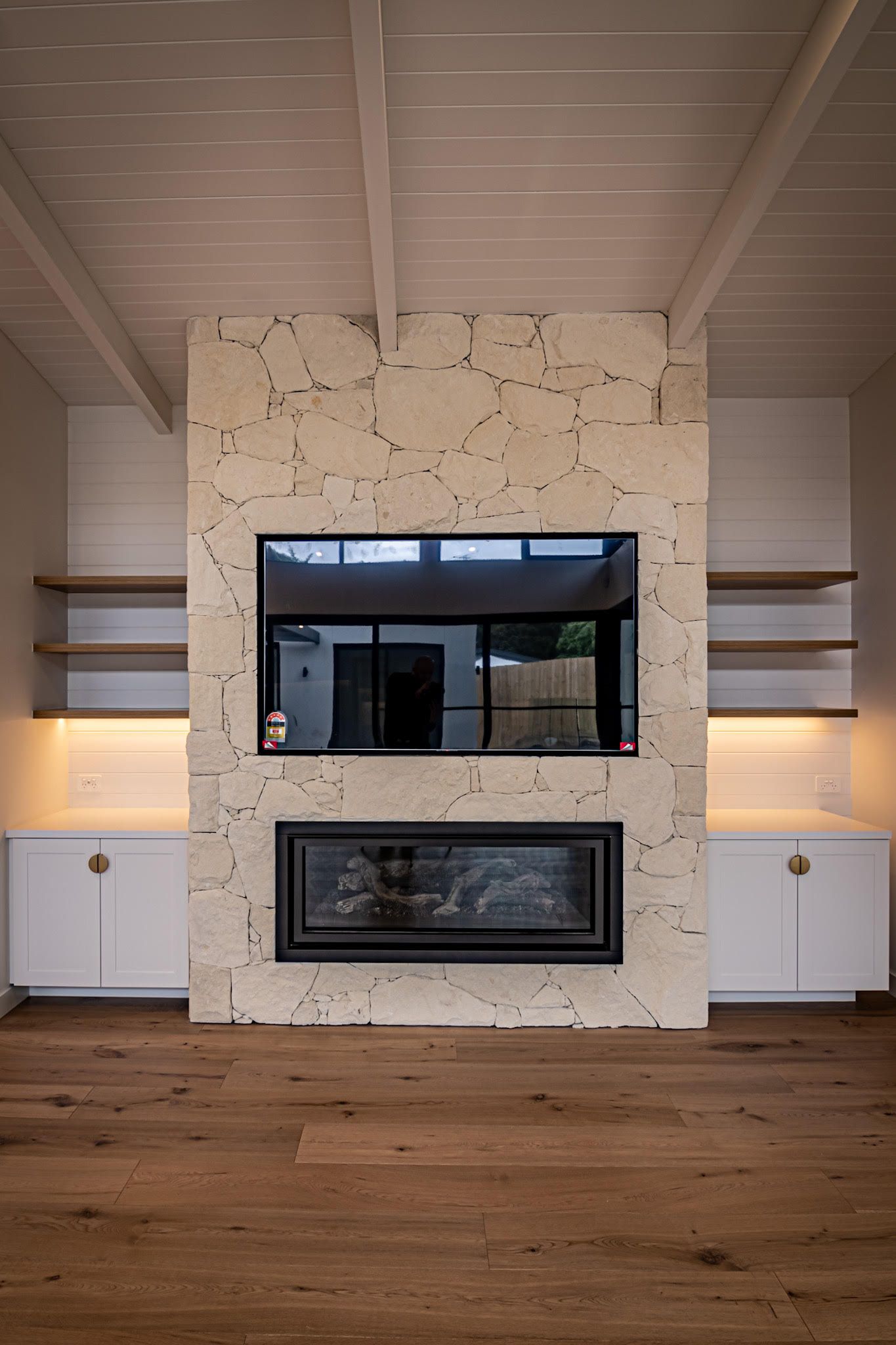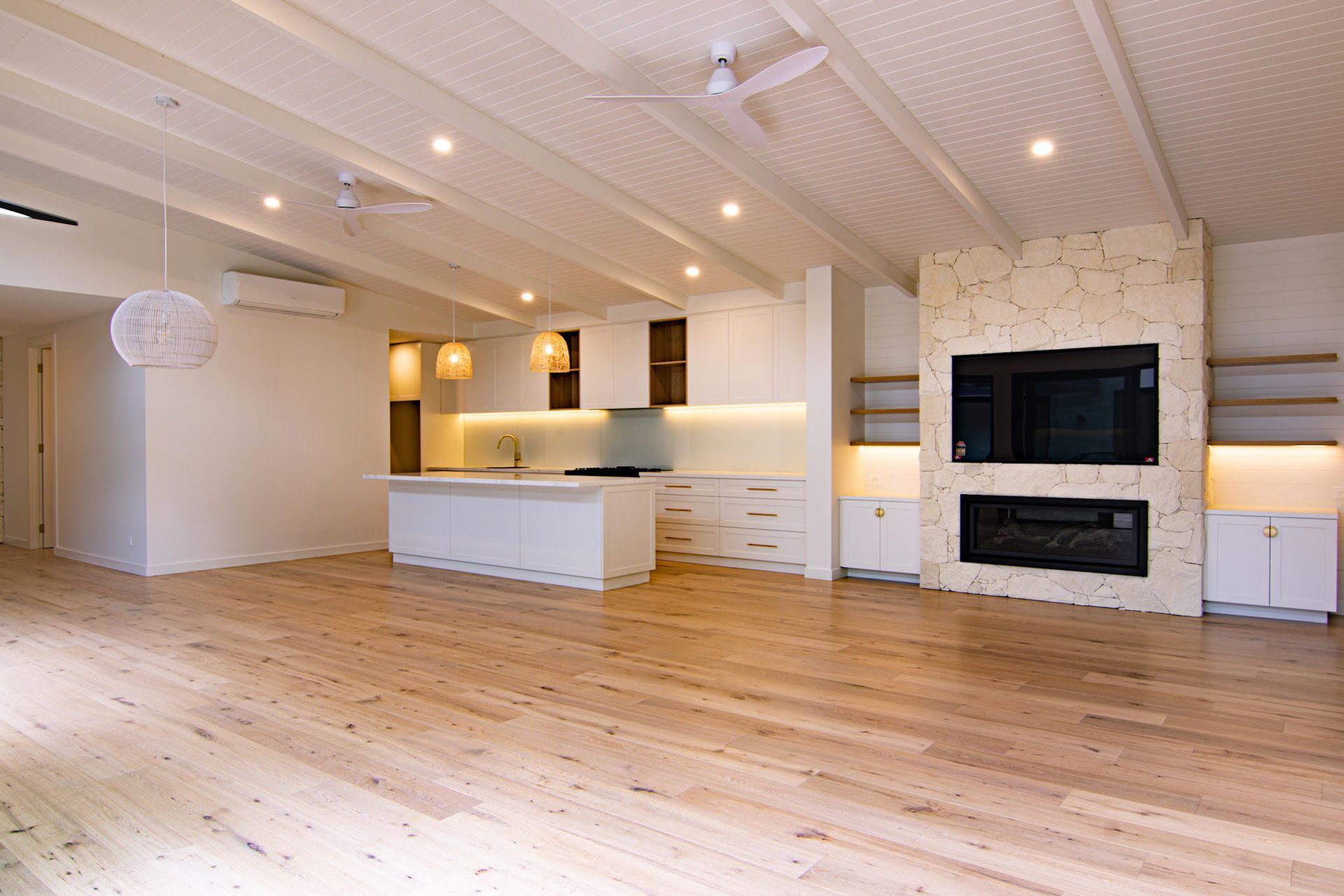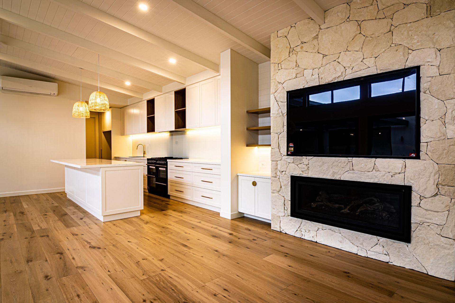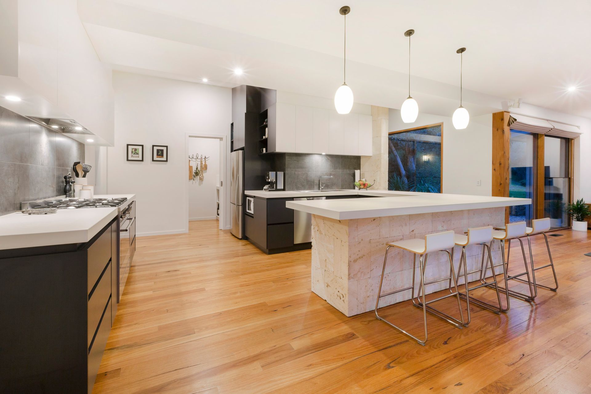 Natural materials and polished timber floors feature in the style of natural sustainable architecture in this house. Exterior and interior elements include natural random rubble Limestone feature walls. Interior features include stone bench tops, white timber lining boards, exposed white timber beams and feature white shiplap to walls.