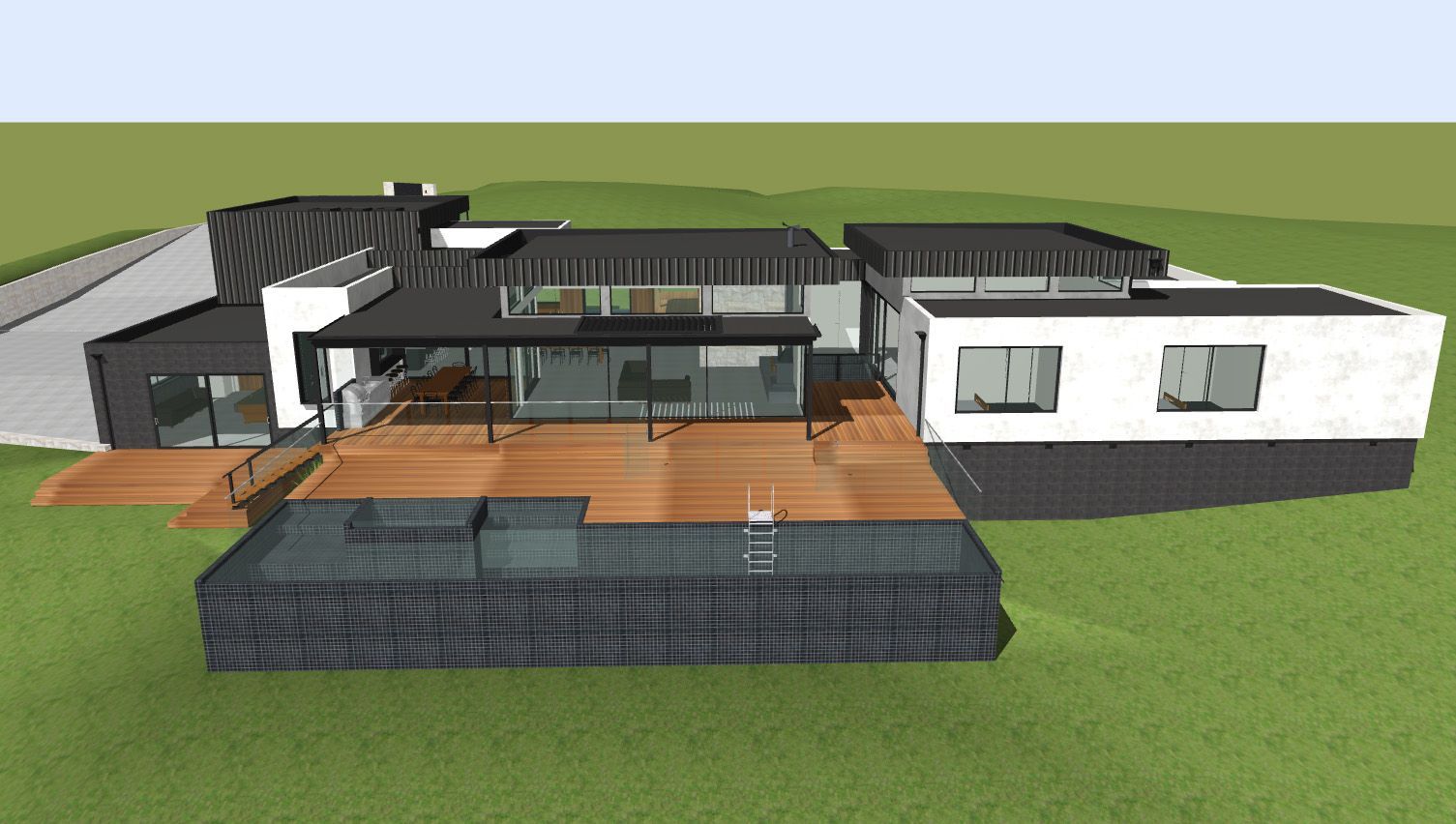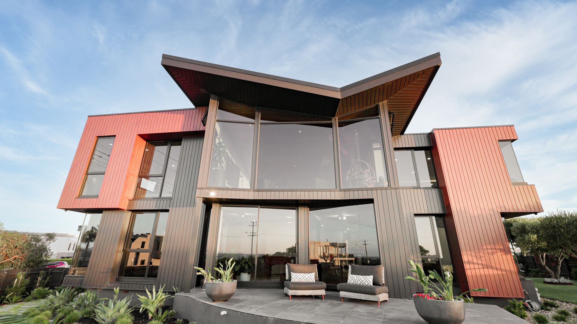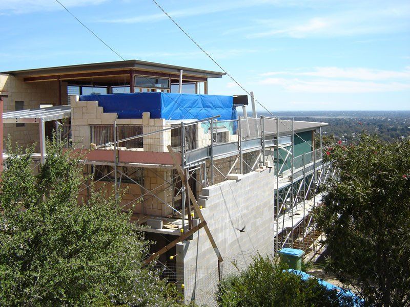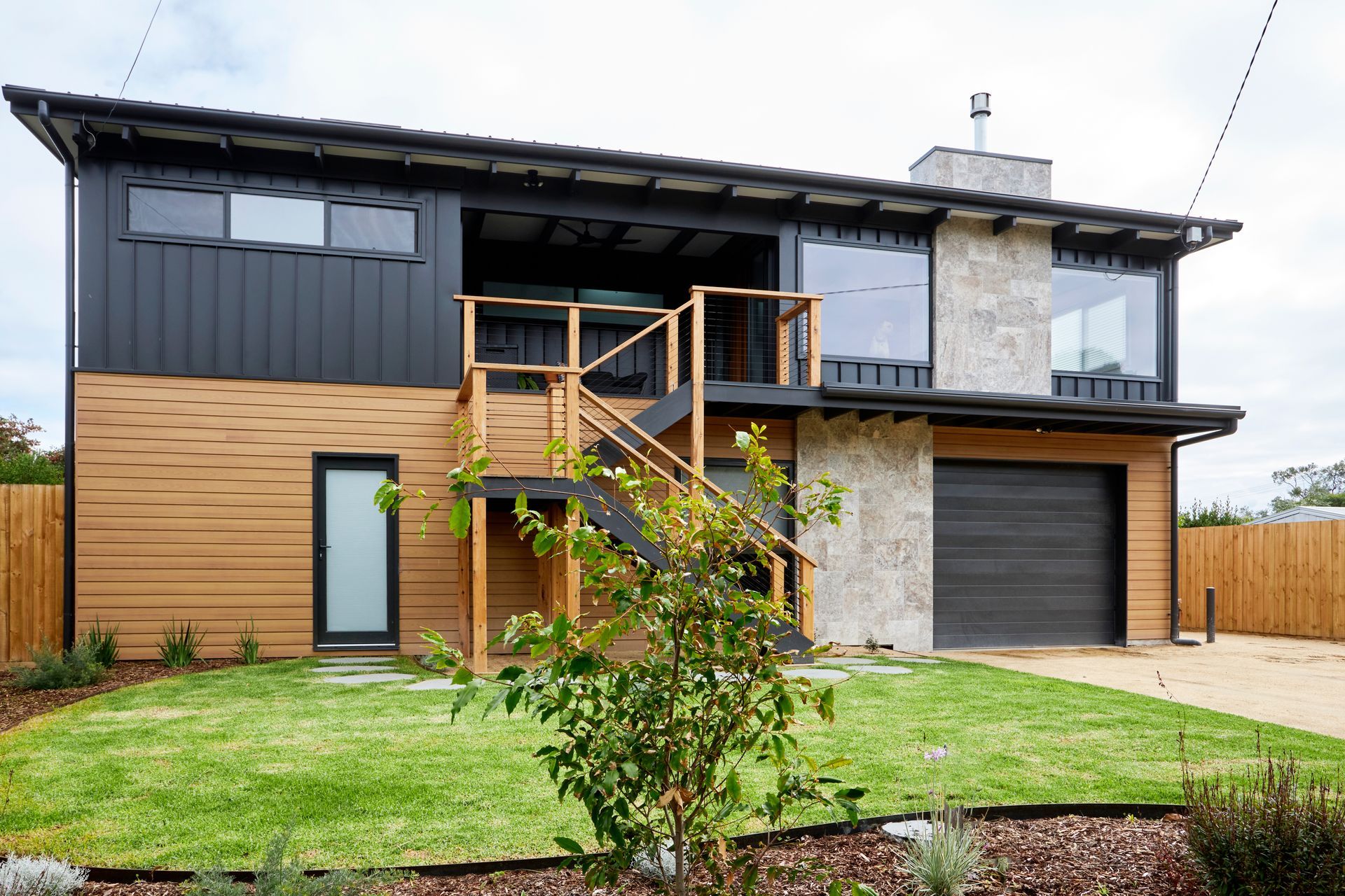 Luxury passive solar house currently under construction. Colorbond standing seam metal cladding, low c02 rendered foam board, timber decking from managed forests, grey designer blockwork by adbri.