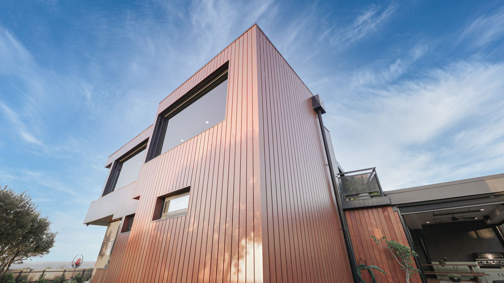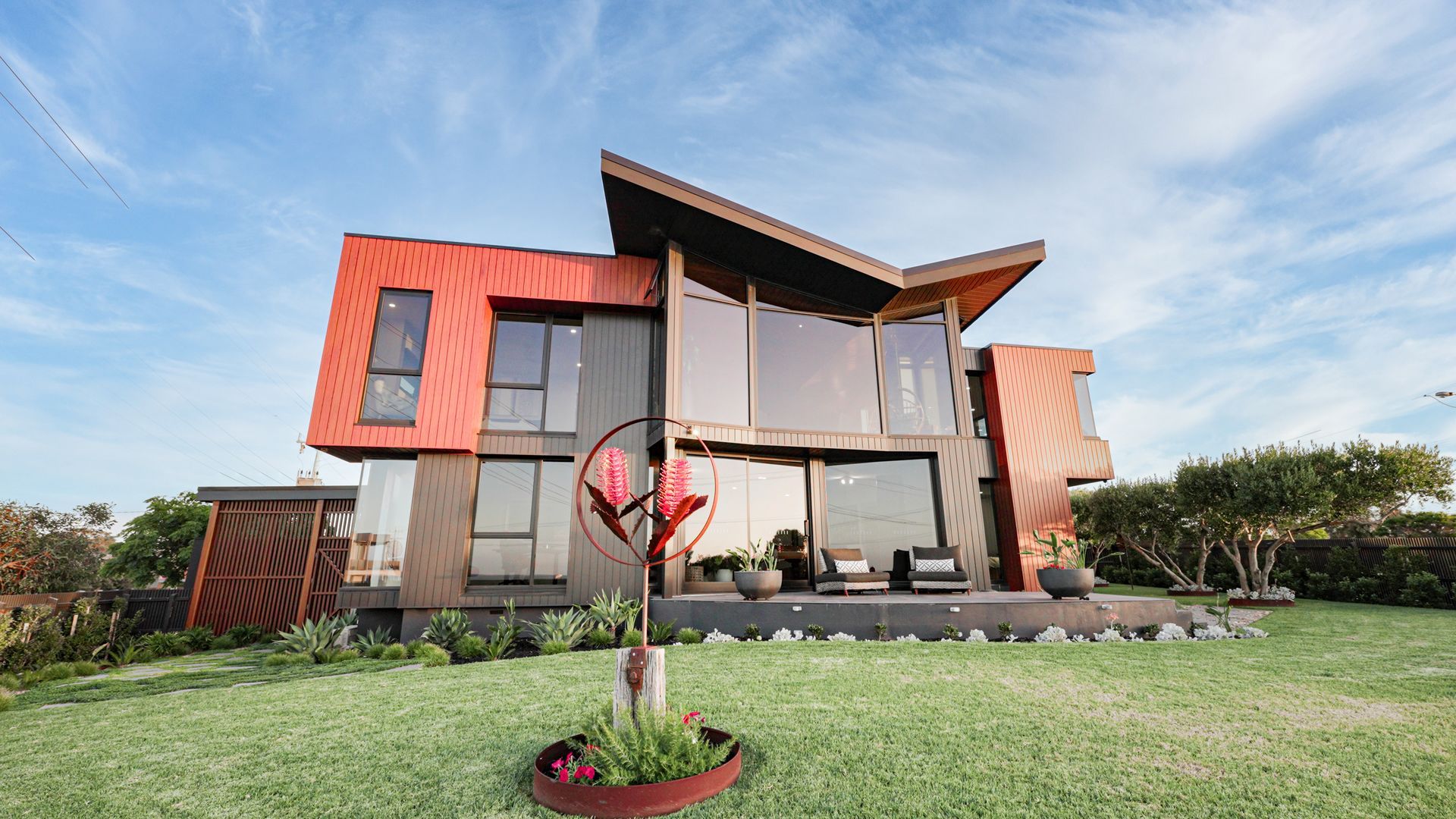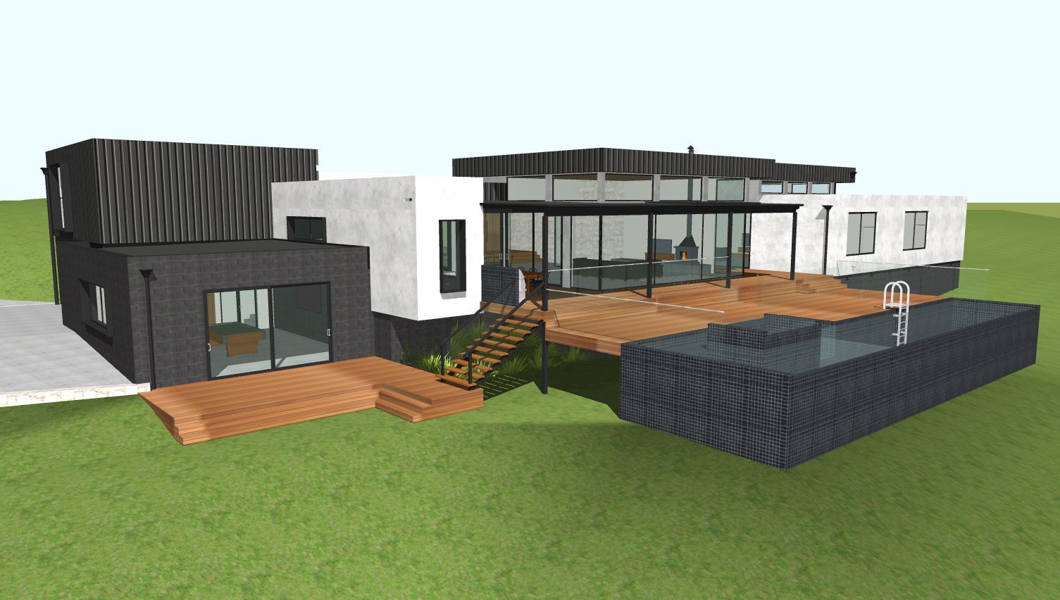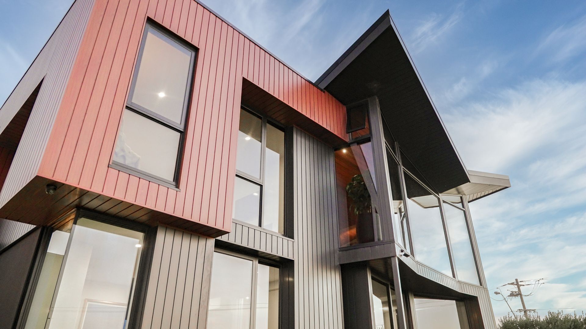 Luxury passive solar house currently under construction. Colorbond standing seam metal cladding, low c02 rendered foam board, timber decking from managed forests, grey designer blockwork by adbri.