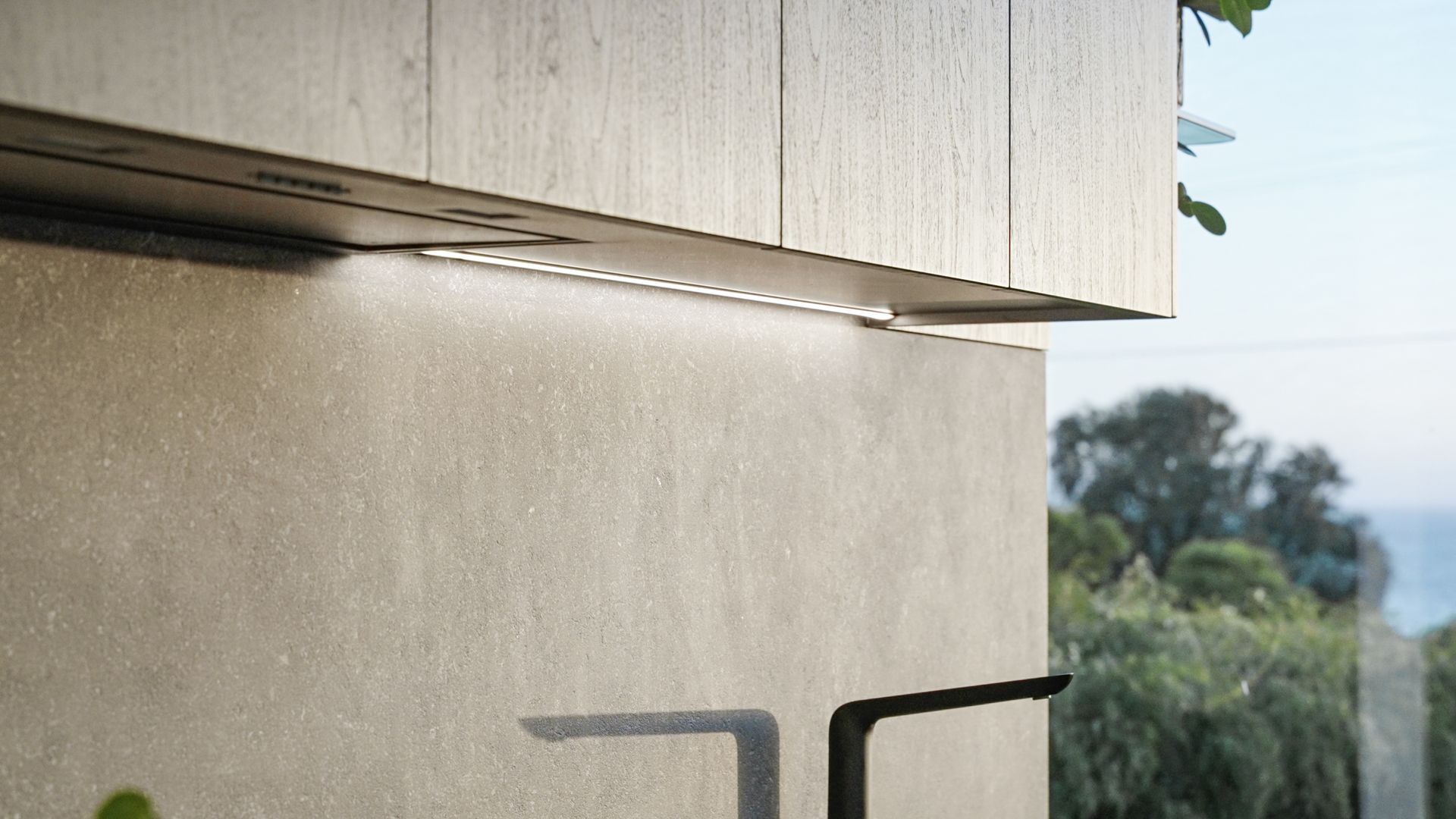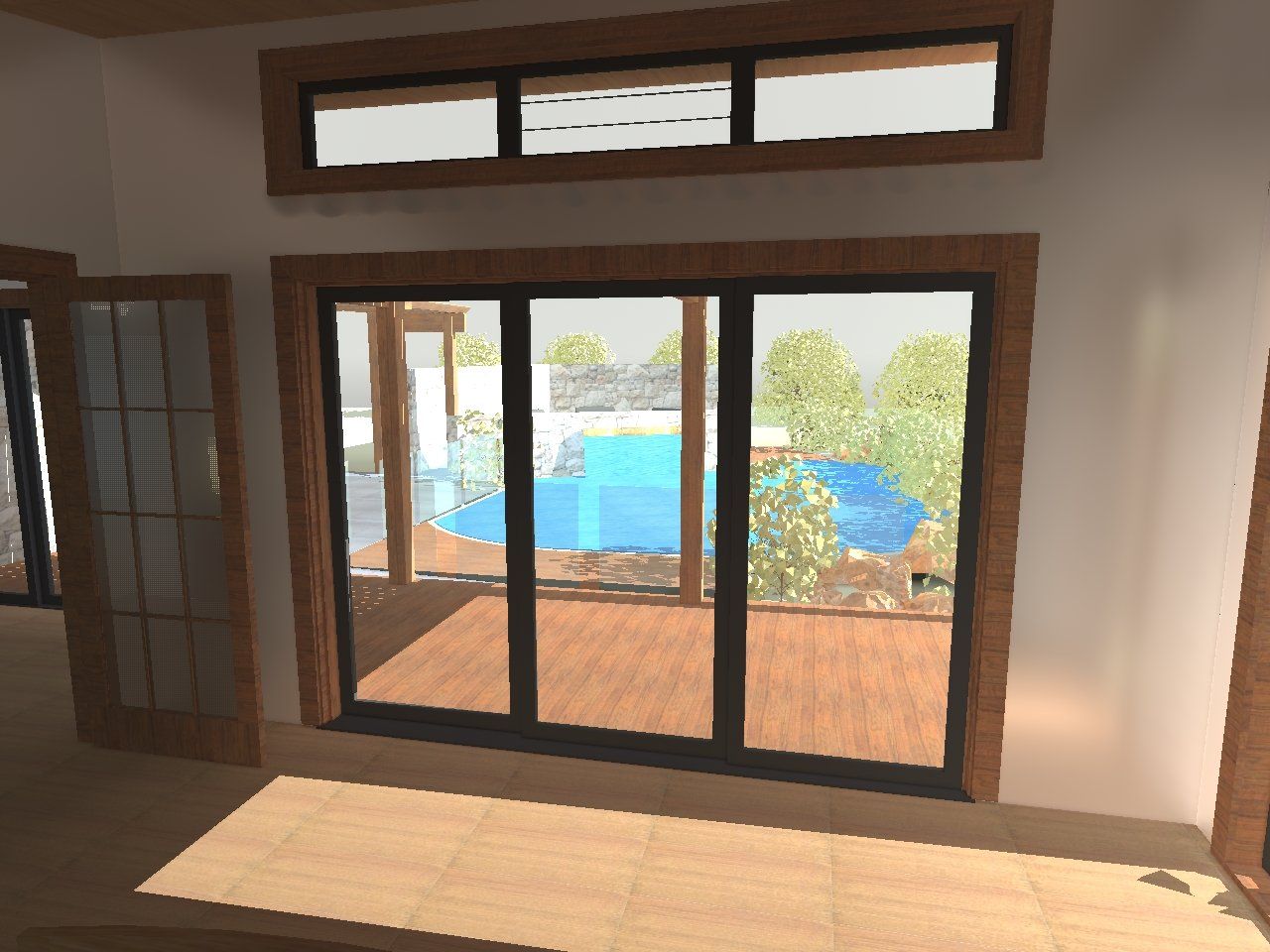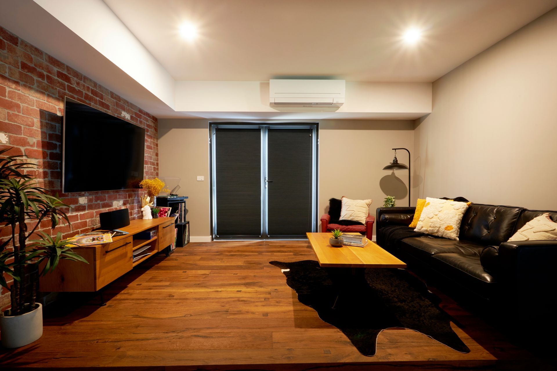 Highlight windows facing north allow winter sunshine to pour into open living areas in winter and detachable waterproof shade sails protect from the summer sun. A carefully placed internal door to lower storey stairs can be opened or closed to control natural air from lower subterranean storey allowing passive air conditioning to suit each season. Cool air from the lower storey naturally flows up and out through the motor operated highlight windows in the upper storey by natural convection.