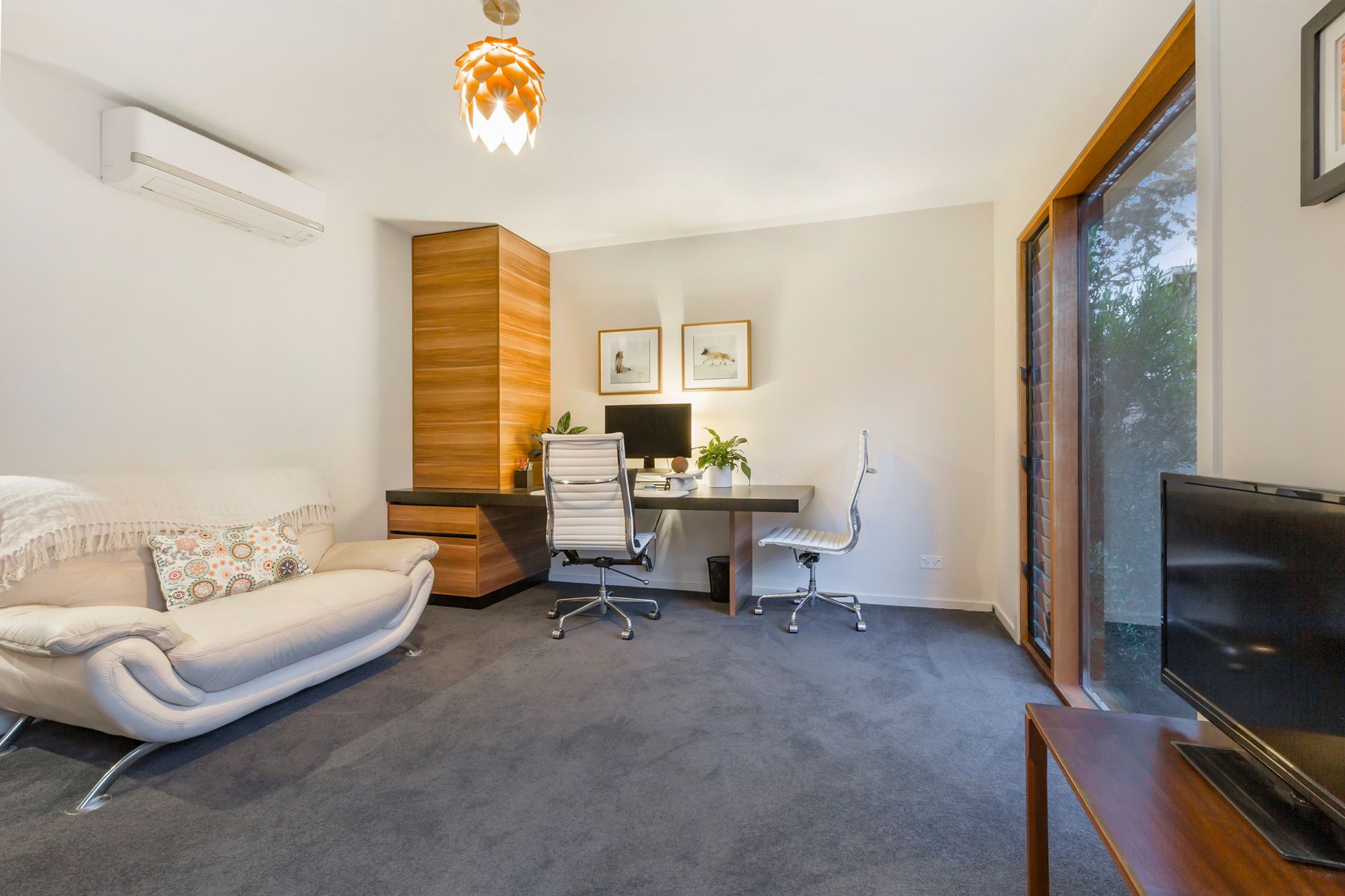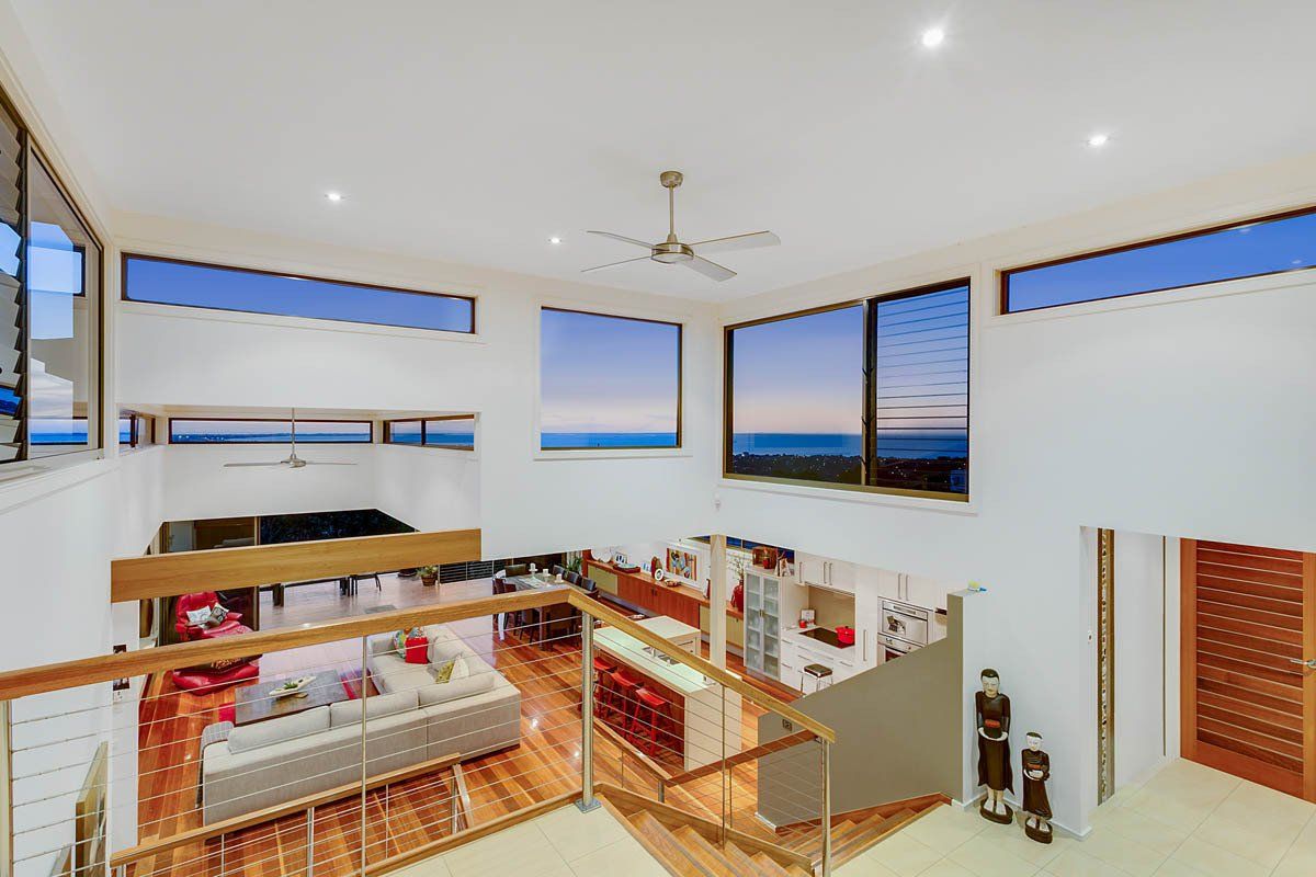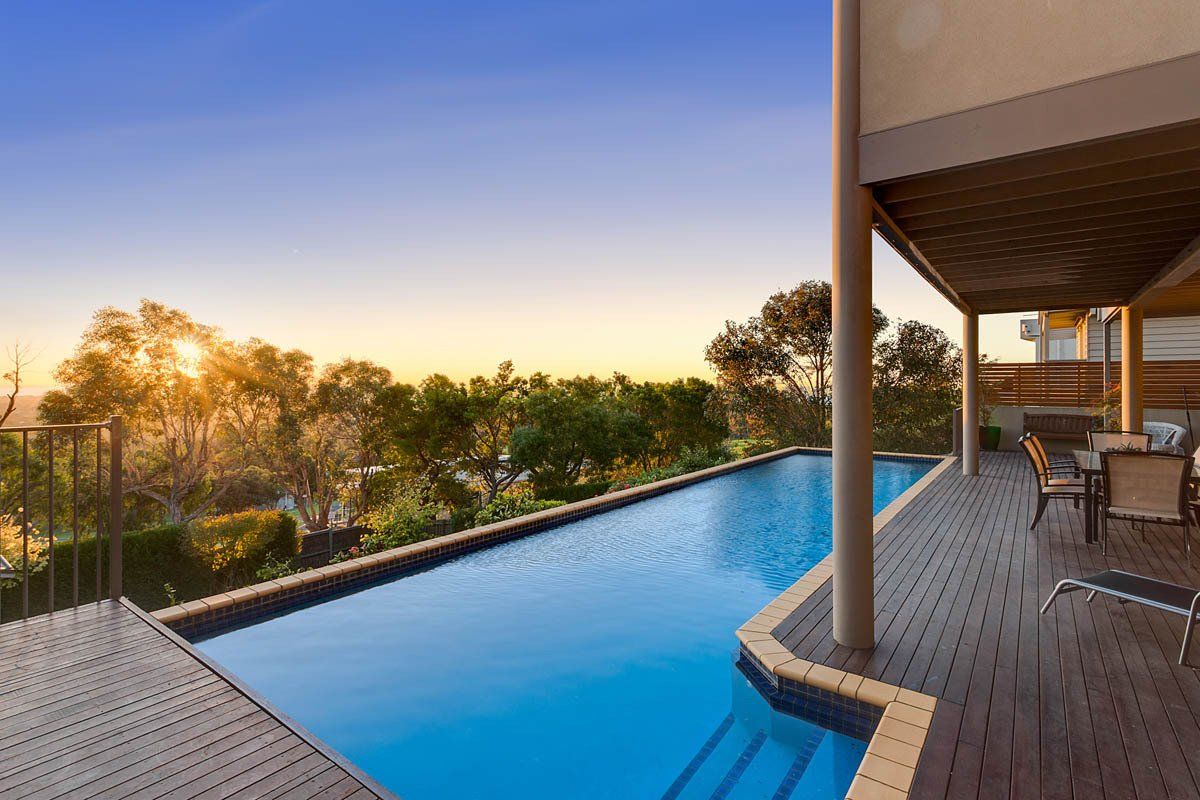 Marina lifestyle can be experienced in this two-storey contemporary home with Northern light filtering into a pond courtyard with an Asian garden, landscaping by 'Stylescapes'. Flanked either side by tall houses blocking out the sun, the light filled central courtyard is skirted by energy efficient double glazing that offers views from all living areas up and down. A central recycled timber pier style floor runs from the street entry through to the picture window at the rear that frames the pool and Patio. Natural rock facades and rendered finishes feature on the exterior and internally, blue stone paving, polished concrete benches feature. In the second storey master bedroom ensuite a free-standing bath looks down into the courtyard garden that features Bonsai plants and a specimen Maple. Views of the Marina canals and nearby hills are available from the upper rooms.
