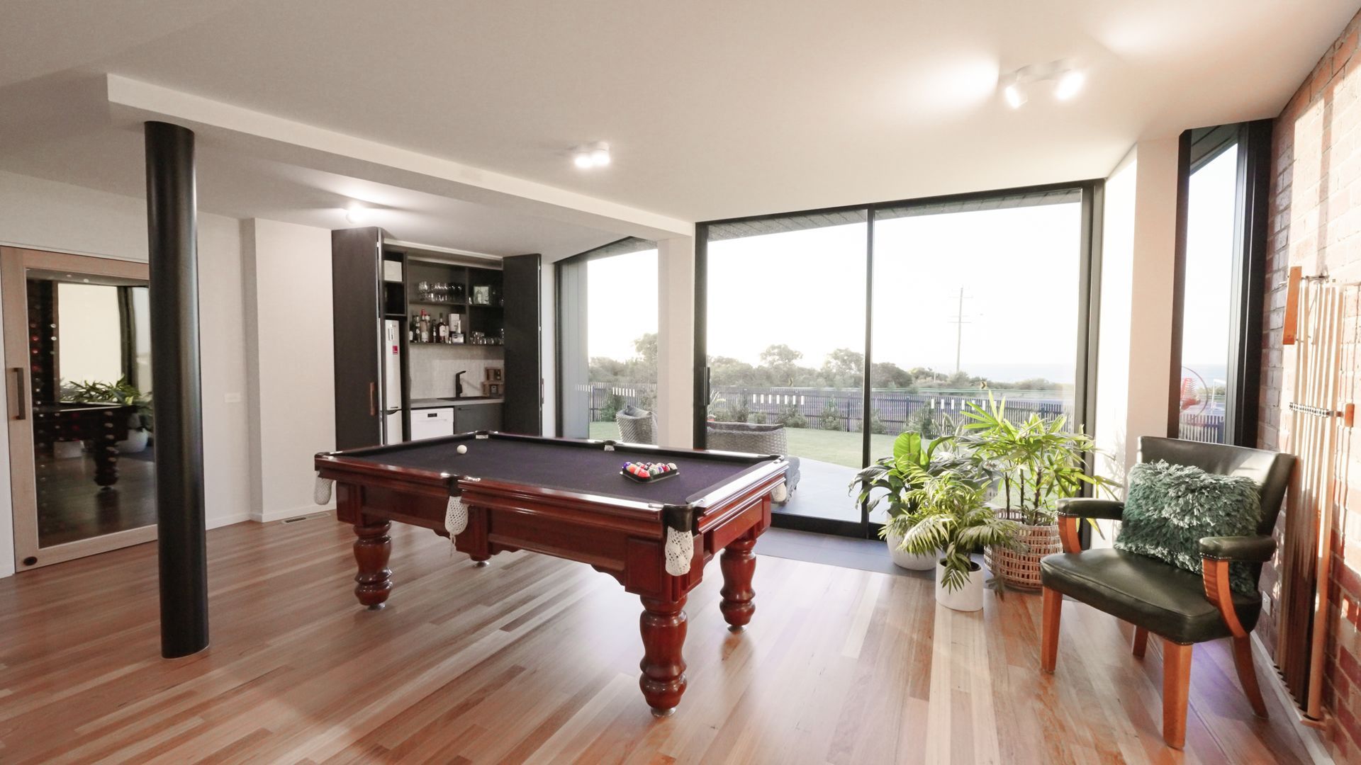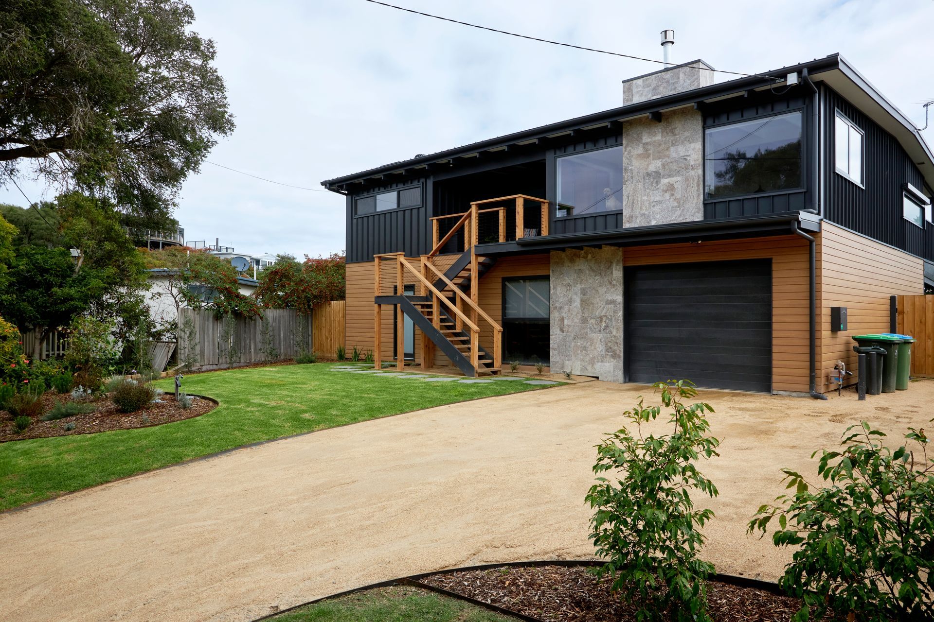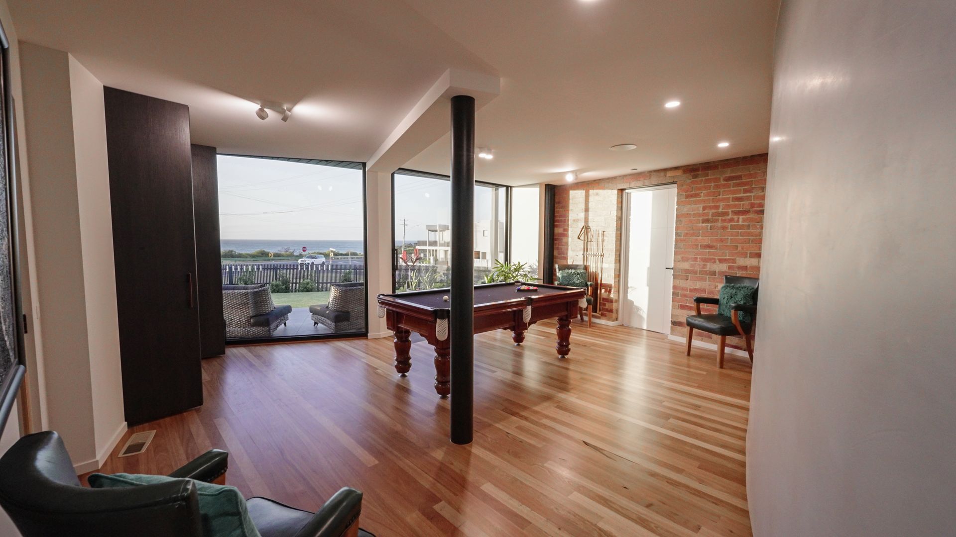 This modern style beach house features a mix of exterior cladding including stone, ebonised timber shiplap, Colorbond standing seam in Monument, and Hardwood timber decks.The light filled interiors include polished wood floors, accented tiles to wet areas in charcoal and warm white.The sunken living room leads onto a generous Alfresco covered deck and pool and seperate outdoor entertainment room. The latge master bedroom overlooks the pool and deck areas.