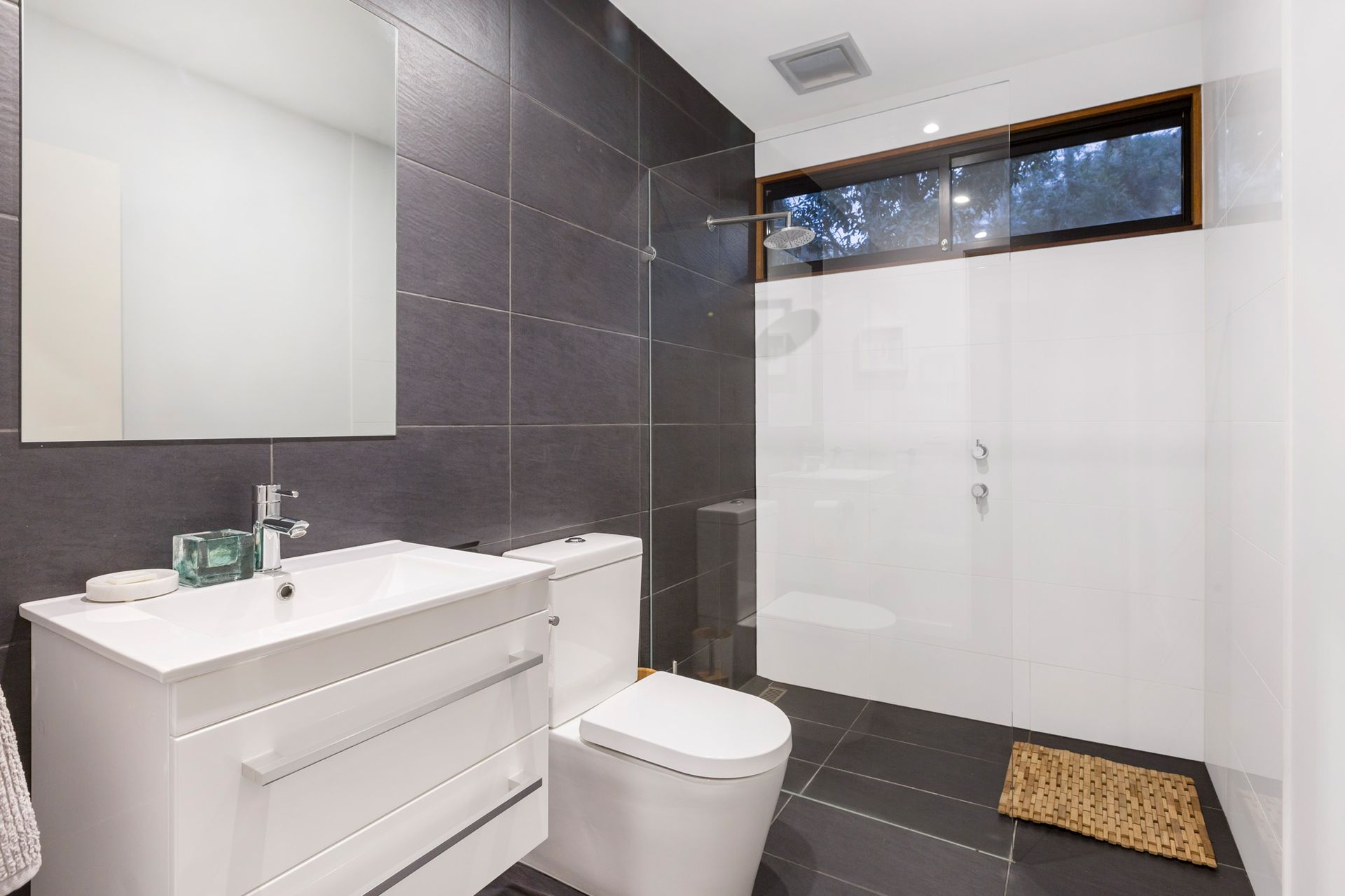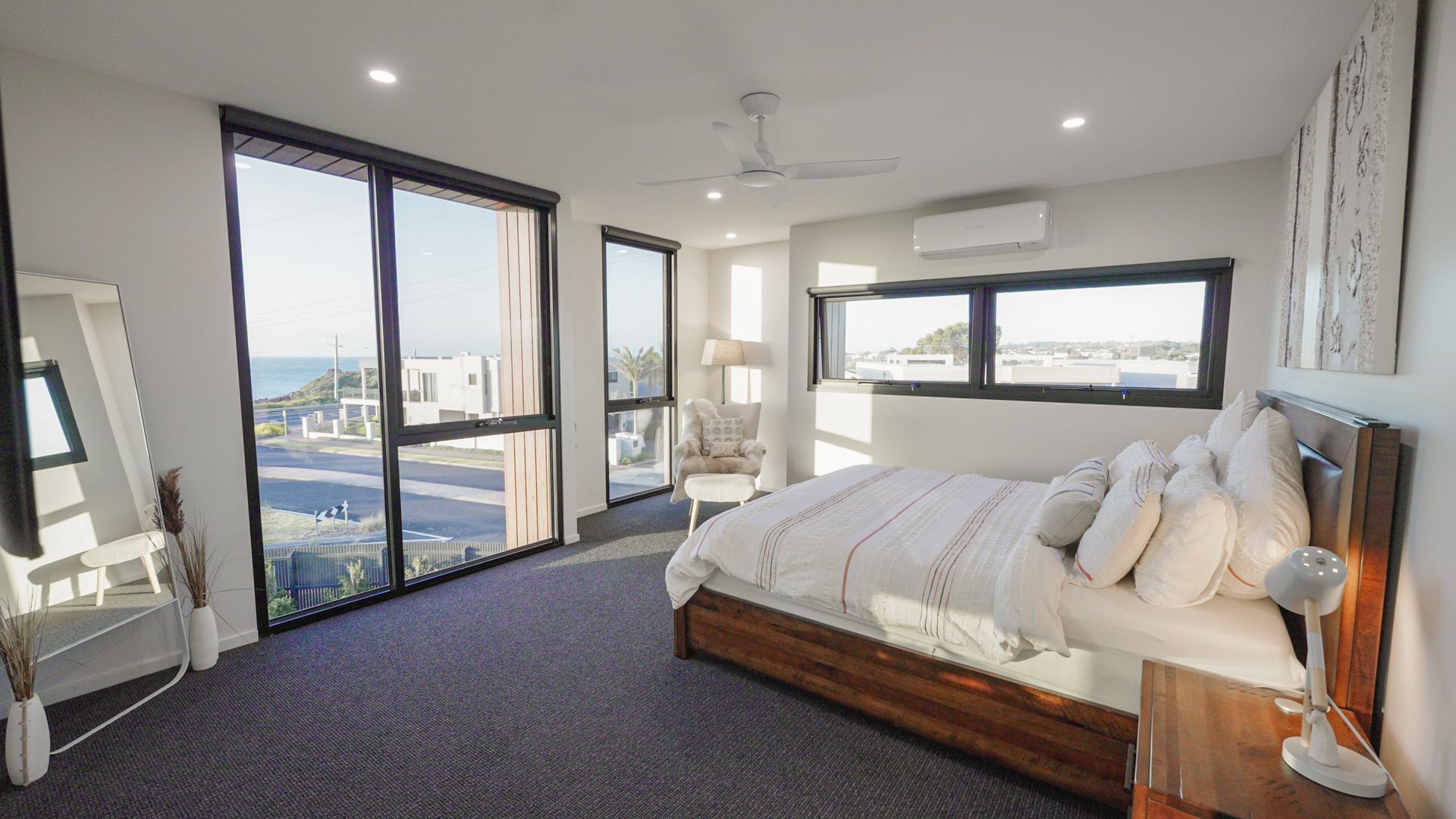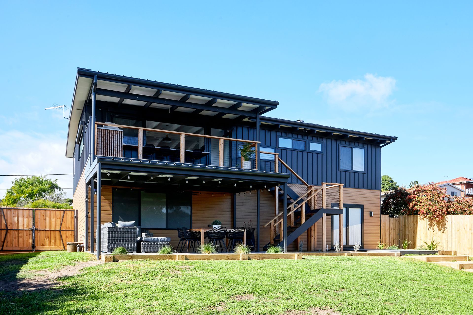 This modern style beach house features a mix of exterior cladding including stone, ebonised timber shiplap, Colorbond standing seam in Monument, and Hardwood timber decks.The light filled interiors include polished wood floors, accented tiles to wet areas in charcoal and warm white.The sunken living room leads onto a generous Alfresco covered deck and pool and seperate outdoor entertainment room. The latge master bedroom overlooks the pool and deck areas.