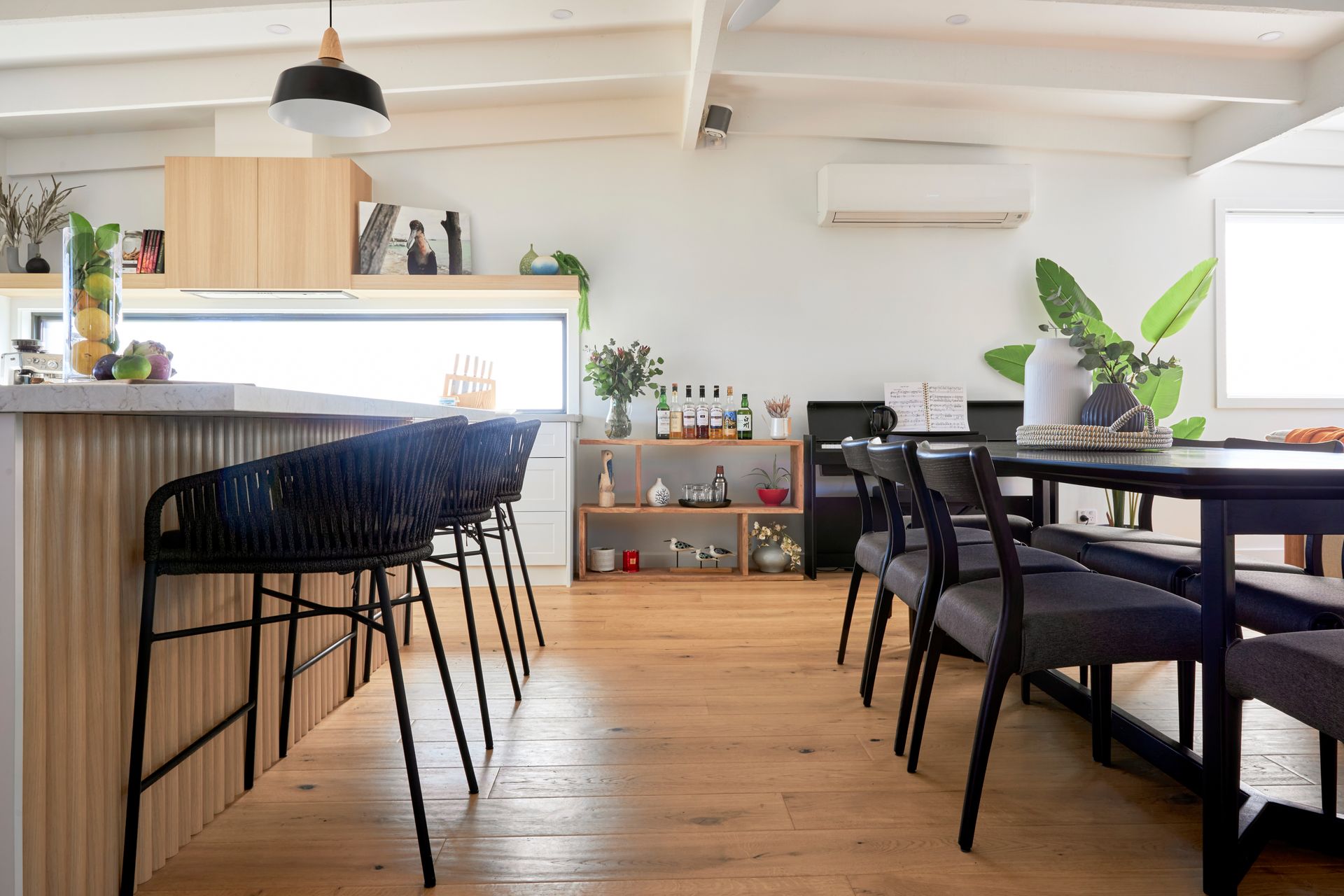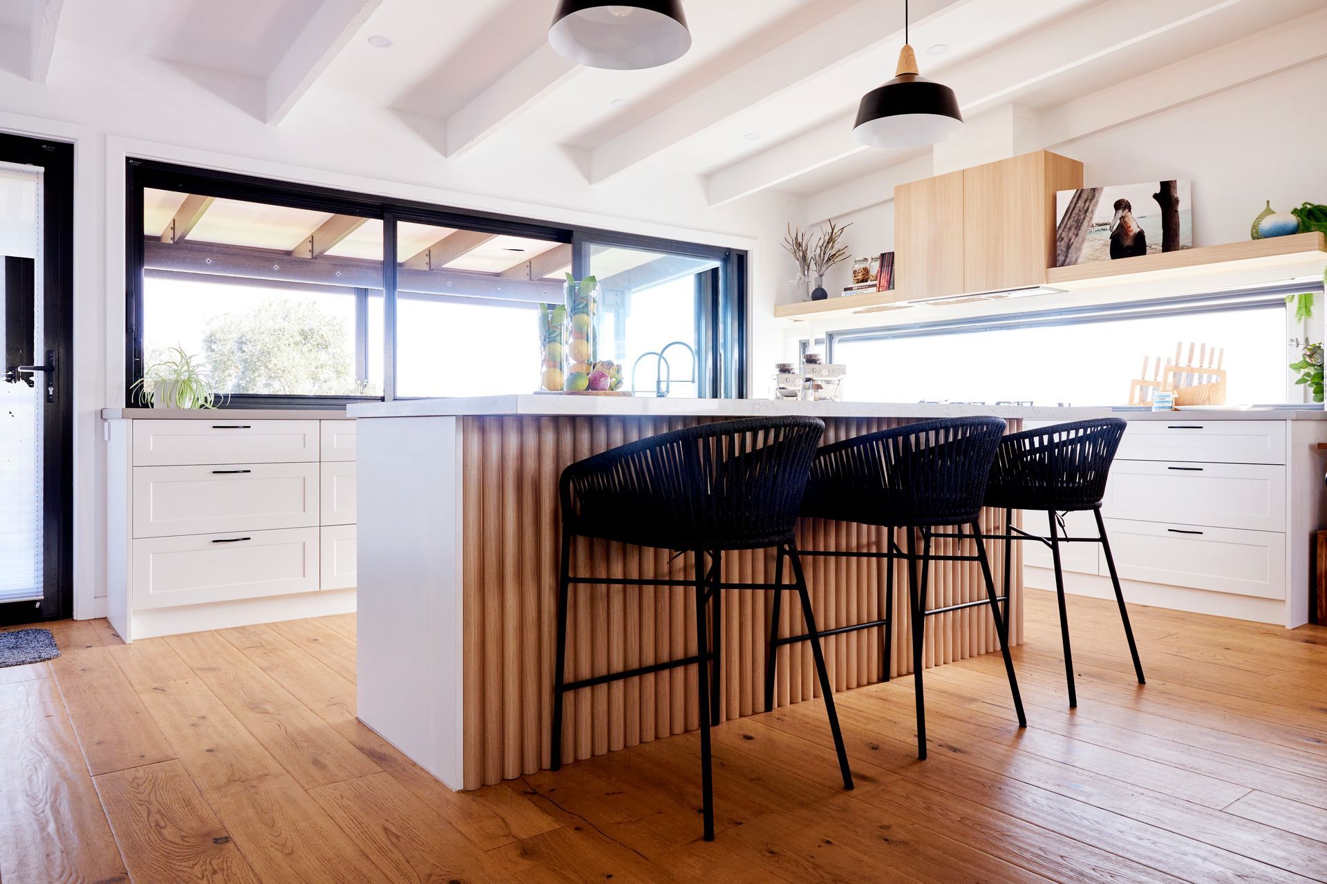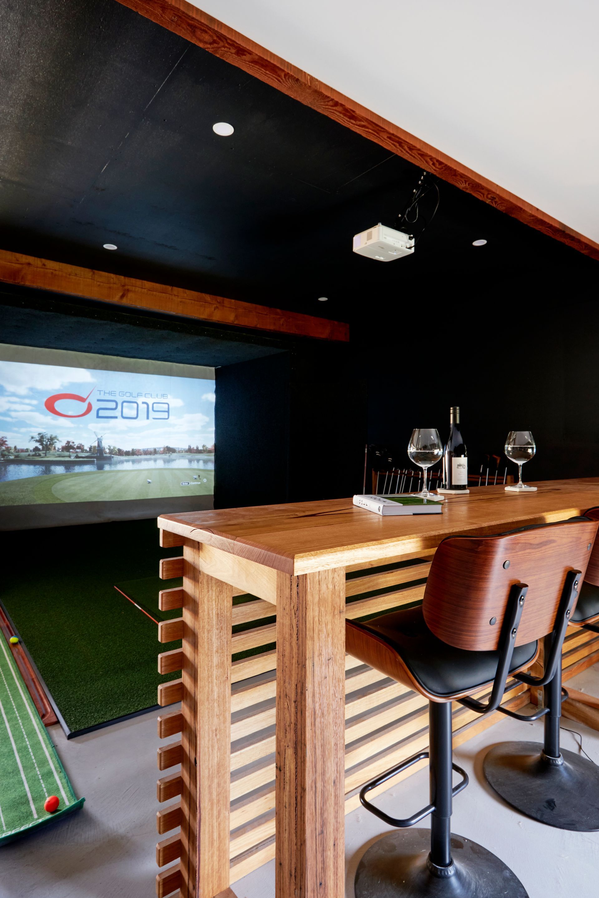 The exisitng lower old garage space is now used as rumpus room come games room with an interactive golf video games area. Upstairs the new kitchen opens out through a large cafe window to an outside alfresco deck and bar with views to western tree tops of the village. Tiled chimney facade provides articulation to the street view. Sunny window seats create nooks. Existing old oregon beams painted up in white help lift the old ceiling. Polished engineered floors feature. Charcoal tiles contrast the white beams and drawer fronts in bathrooms. Retro sixties tiles add interst to bathrooms.