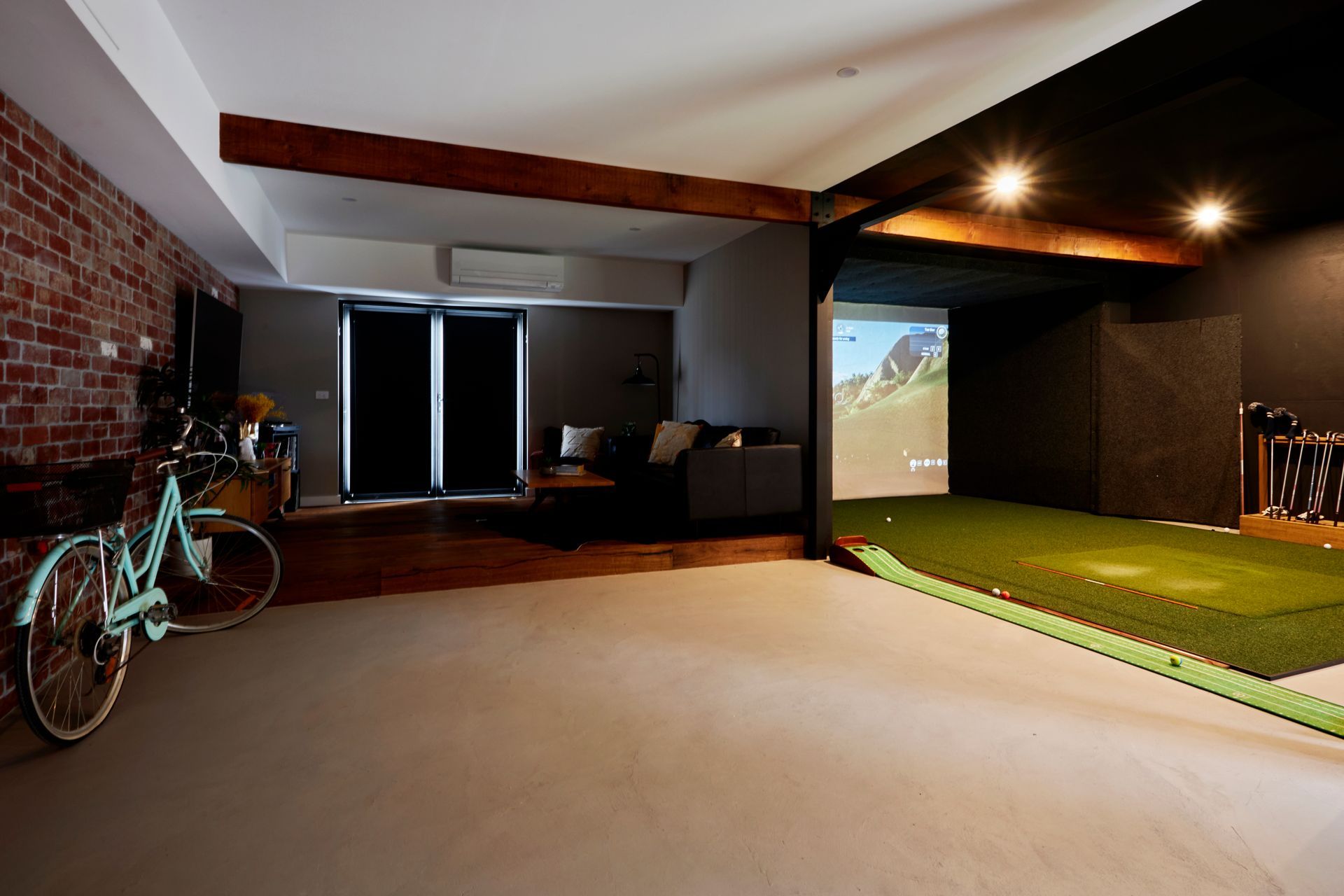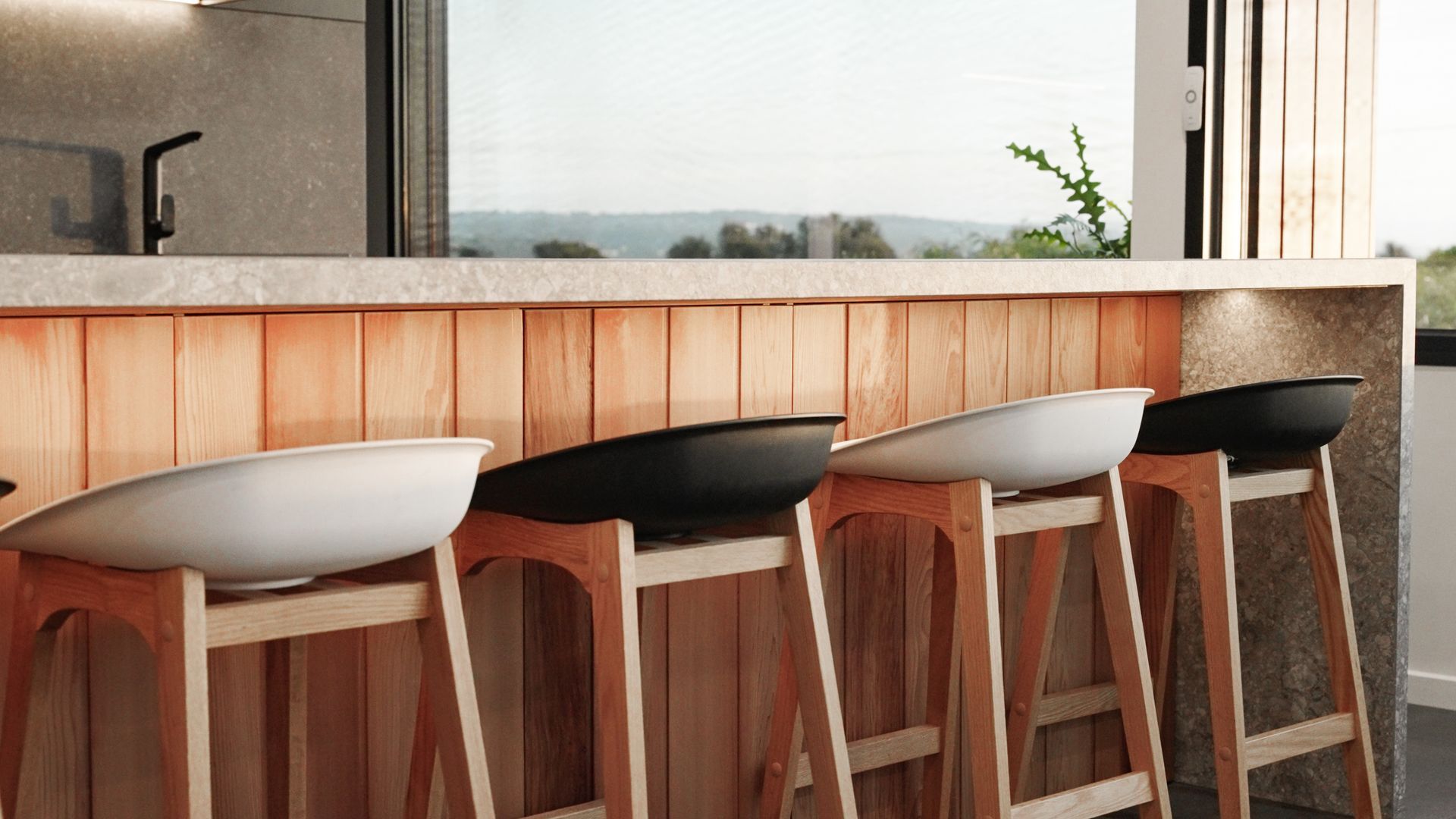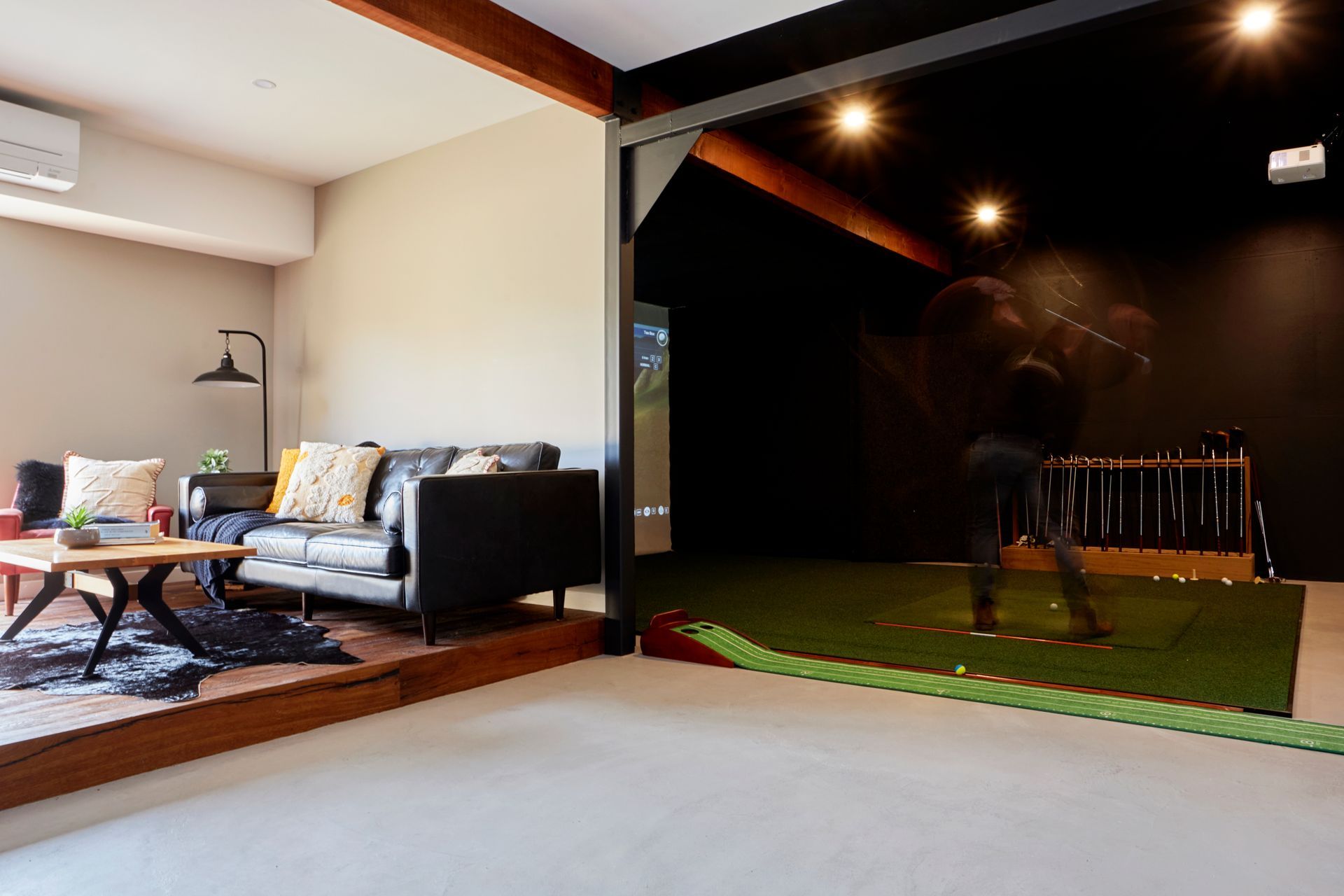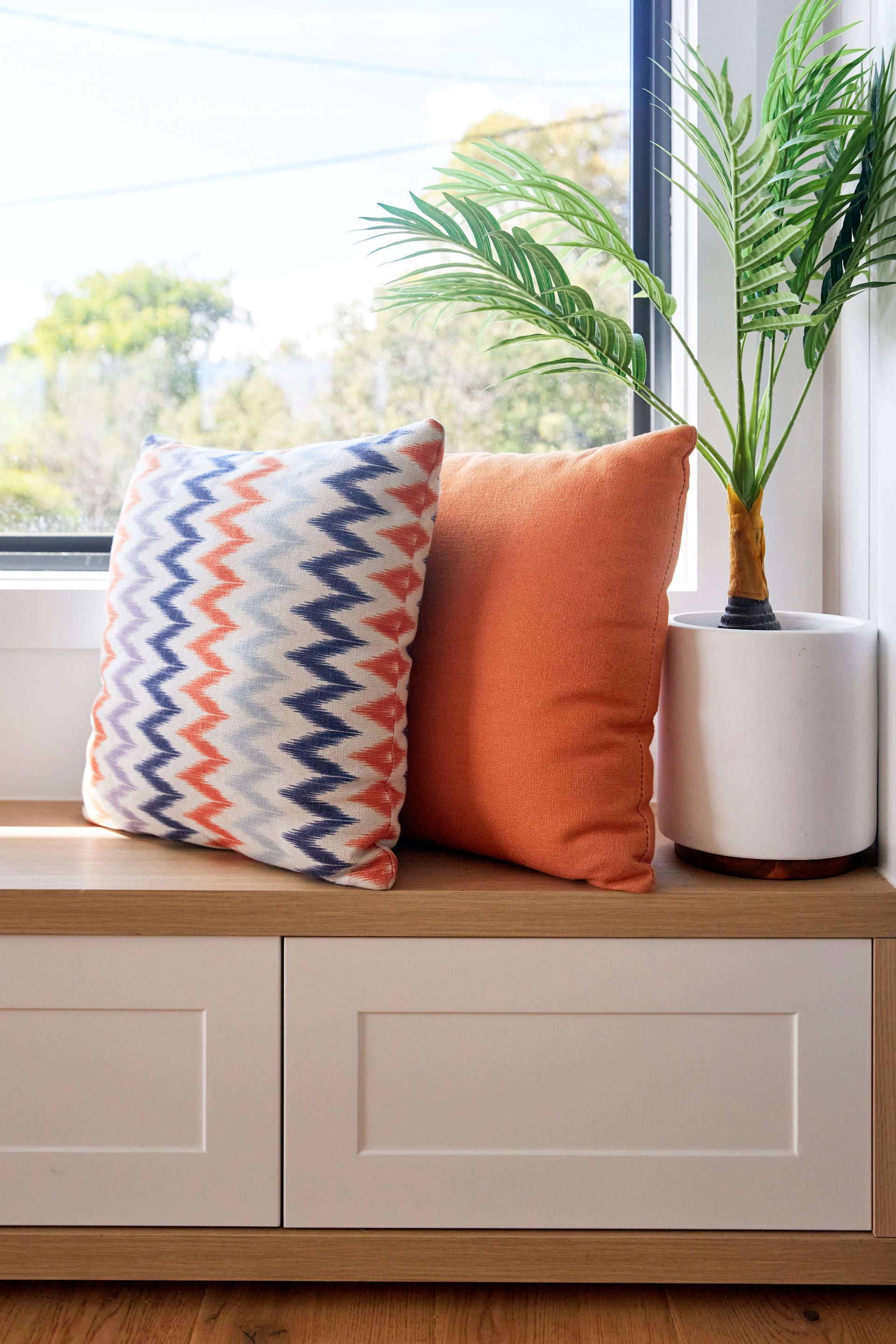 The exisitng lower old garage space is now used as rumpus room come games room with an interactive golf video games area. Upstairs the new kitchen opens out through a large cafe window to an outside alfresco deck and bar with views to western tree tops of the village. Tiled chimney facade provides articulation to the street view. Sunny window seats create nooks. Existing old oregon beams painted up in white help lift the old ceiling. Polished engineered floors feature. Charcoal tiles contrast the white beams and drawer fronts in bathrooms. Retro sixties tiles add interst to bathrooms.