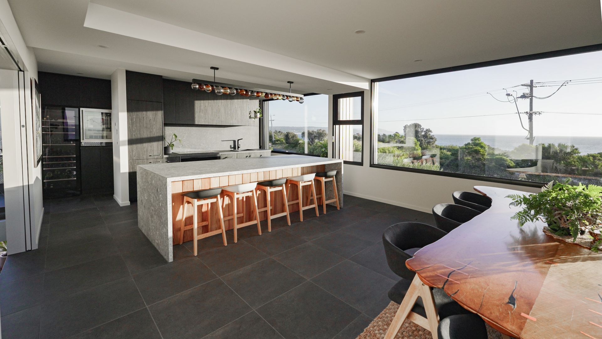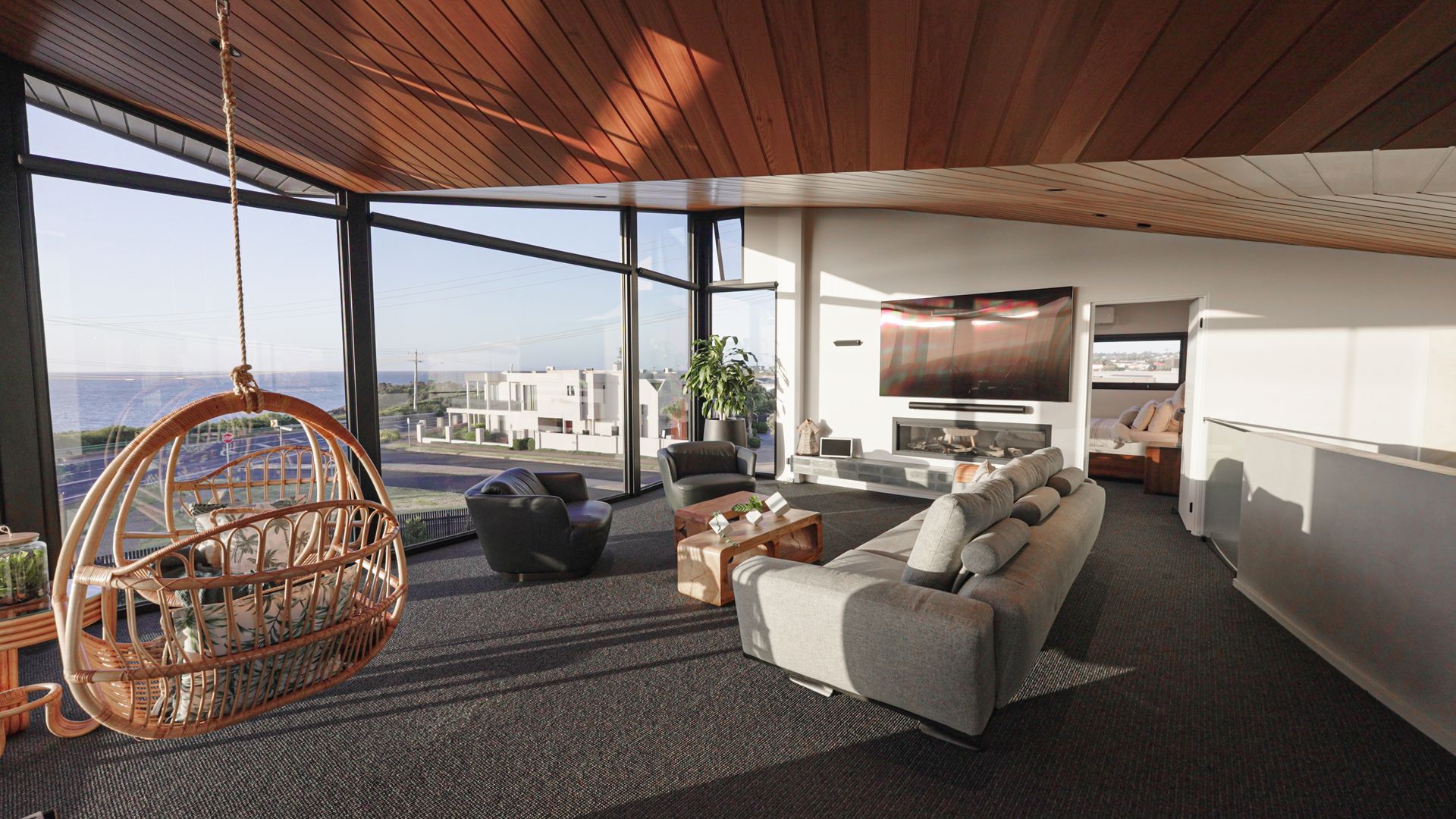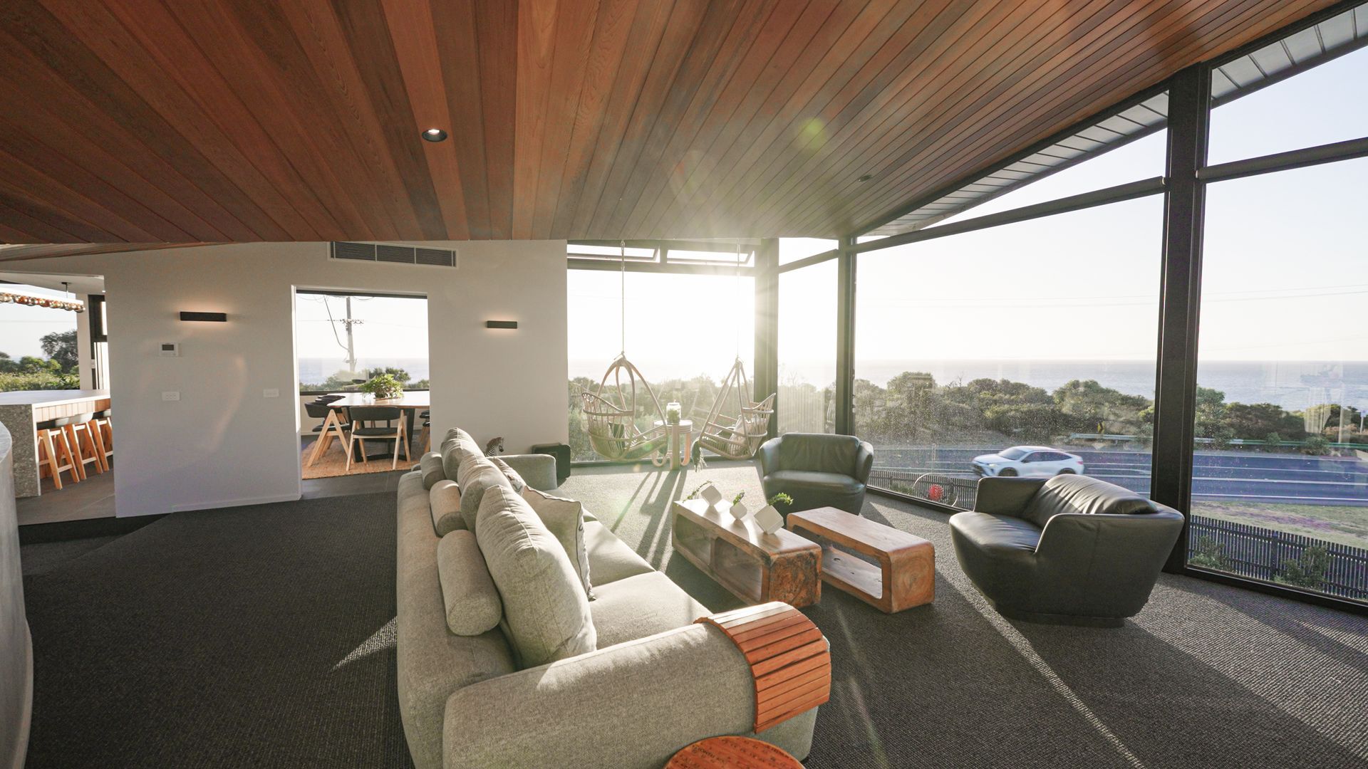 This mid 90 'architectural statement' was a little shabby, and in need of total refurbishment and additional spaces, and at one stage demolition was even considered. The proposed renovations and additions will now enhance the previous creative indulgences of this architecture, expanding on earlier concepts and replacing exterior and interior building fabrics that will stand the test of time aesthetically and be resilient in the harsh coastal environment on the frontline of Port Philip Bay. The new exterior cladding by 'Decoclad' is guaranteed for 20 years and has an aluminium base that will require no maintenance, and with a colour selection that accentuates the articulation of this building a transformation becomes possible. New expansive windows open up views to Mt Martha and across to Melbourne.