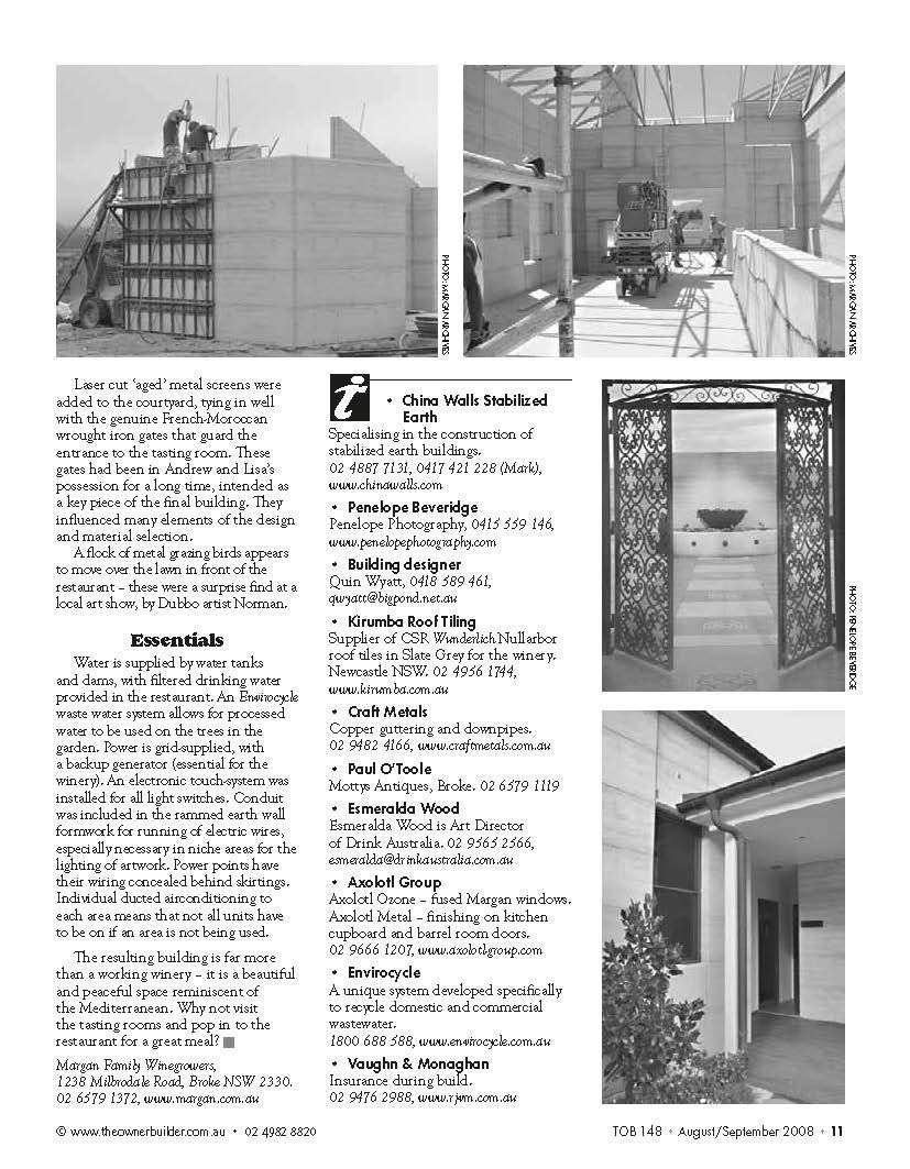 Rammed earth walls feature in this winery and restaurant nestled in the hunter valley near Broke, NSW. the 5.5 m high rammed earth walls 500mm thick in the barrel room provide asteady tempreture perfect for wine maturation.